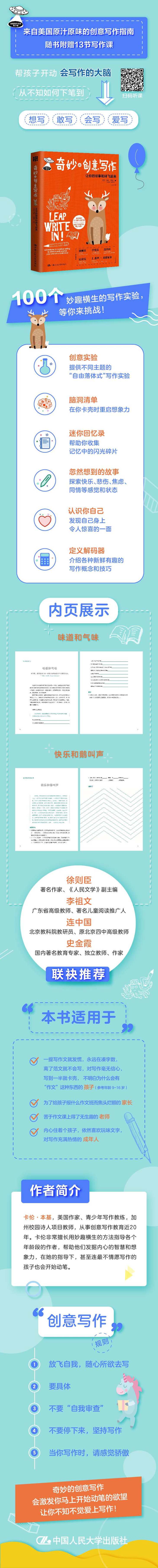 l 作者卡伦·本基从事创意写作教育已近20年,是美国著名的写作教练,非常擅长启发孩子。在她的指导下,甚至连最不情愿的写作的孩子也会提起笔。