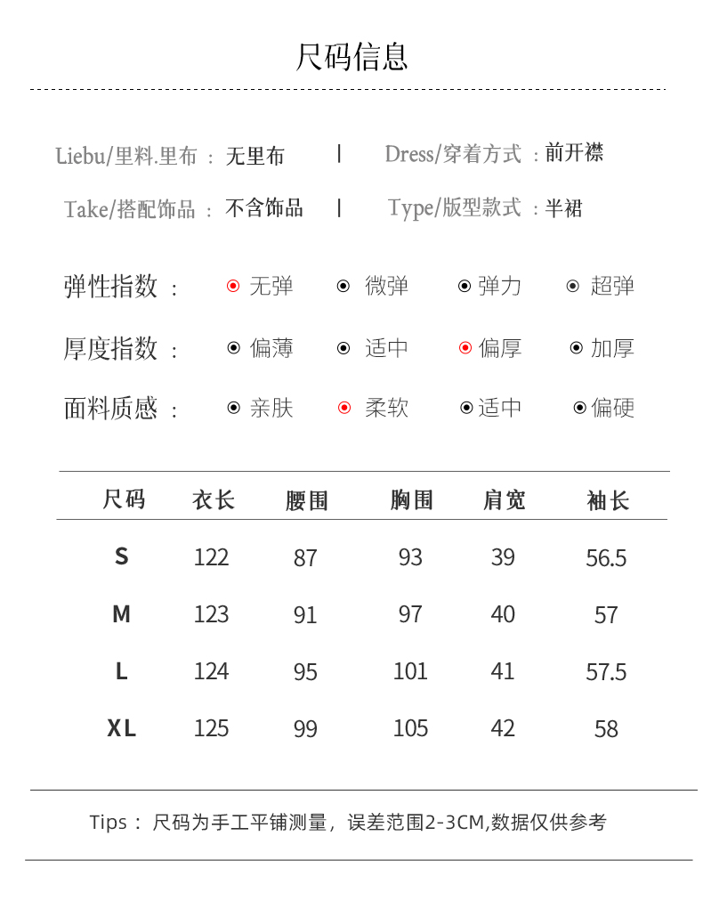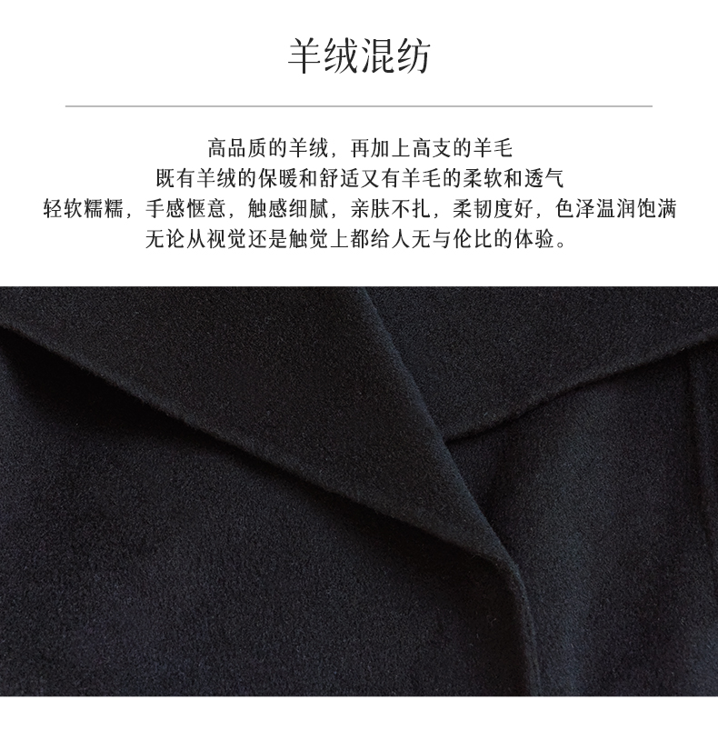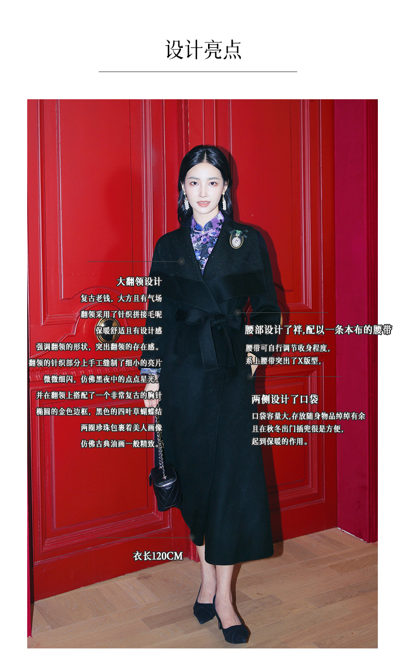 X版型设计,气场全开,腰部设计了袢,配以一条本布的腰带,腰带可自行调节收身程度,系上腰带突出了X版型,即使秋冬穿着的毛呢大衣也不会臃肿,复古又优雅。