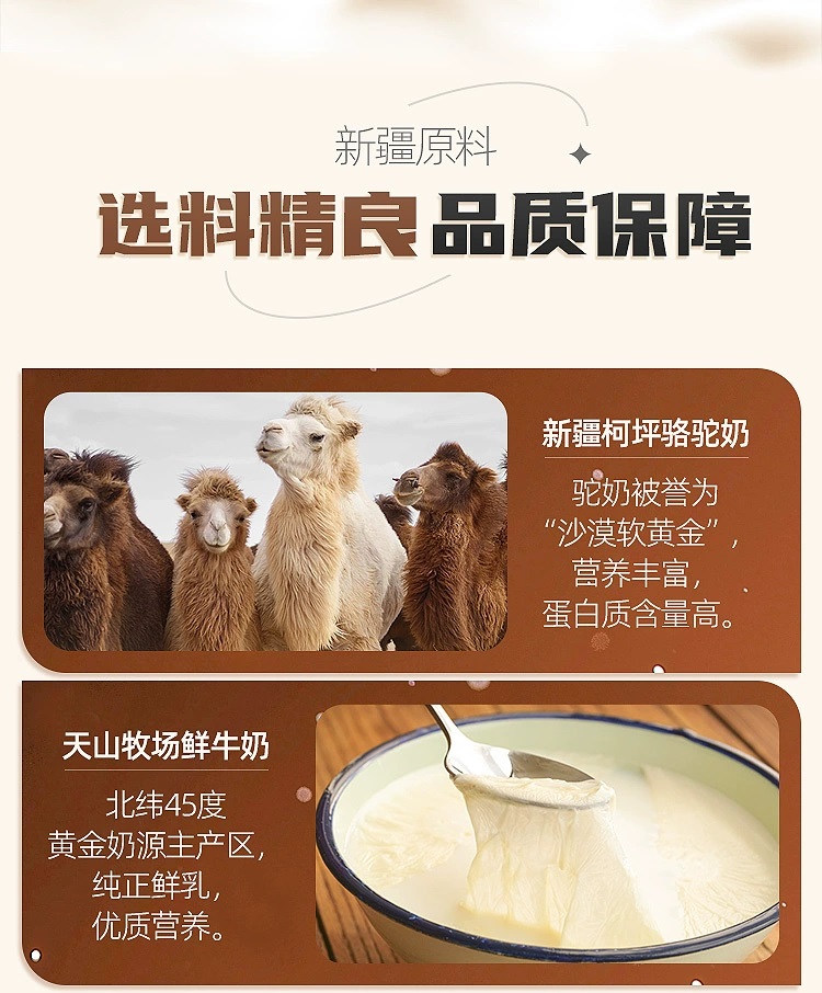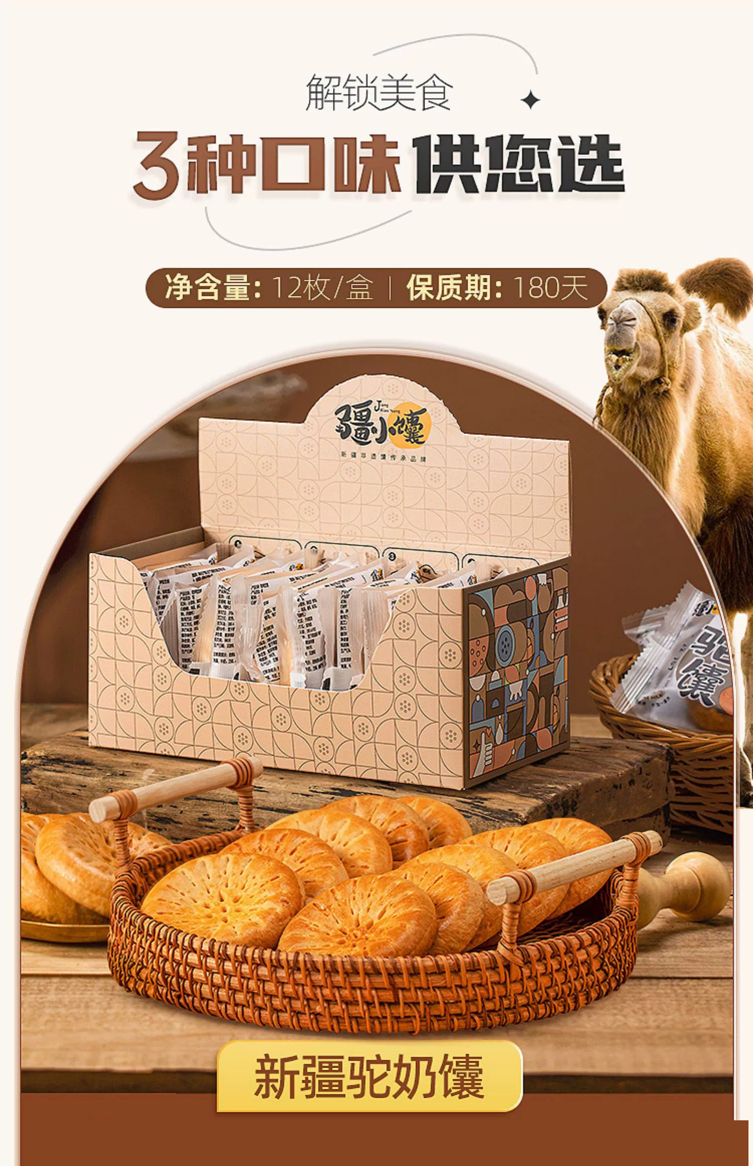 【驼奶馕配料】小麦粉、骆驼奶、食用植物油、食用油脂制品、白砂糖、鸡蛋、酵母、食用盐、食品添加剂(脱氢乙酸钠、丙酸钙)