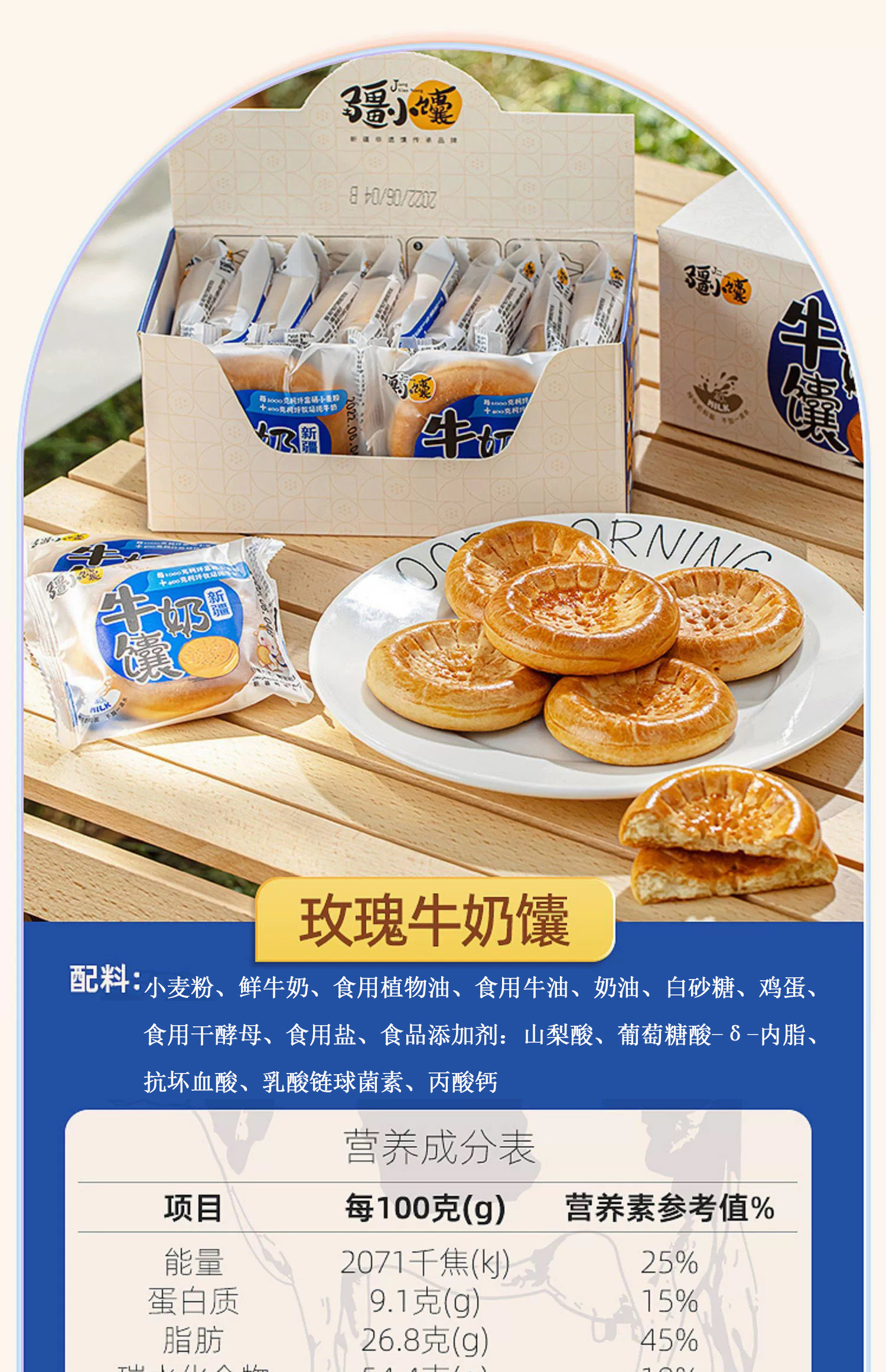 【牛奶馕配料】小麦粉、鲜牛奶、食用植物油、食用牛油、奶油、白砂糖、鸡蛋、使用干酵母、食用盐、食品添加剂:山梨酸、葡萄糖酸-δ-内脂、抗坏血酸、乳酸链球菌素、丙酸钙