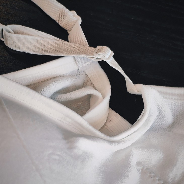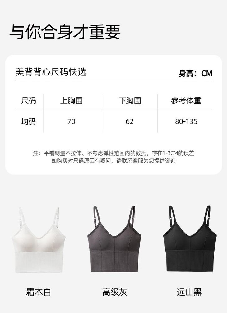 美背吊带有远山黑、高级灰、霜本白三色,我自留的是白色,又纯又欲!版形上身还是很好看的,大露背!微压的面料,穿在身上也不会太勒,但,肚子上肉比较多的,还是会觉得紧的,并且可能卷边,适合小蛮腰人,肉肉多的还是选哈夫的无尺码或细带小背心,更舒服些。。。这件轻运动是很Ok的,外面穿个防晒衣,再搭条五分鲨鱼裤,超有活力!