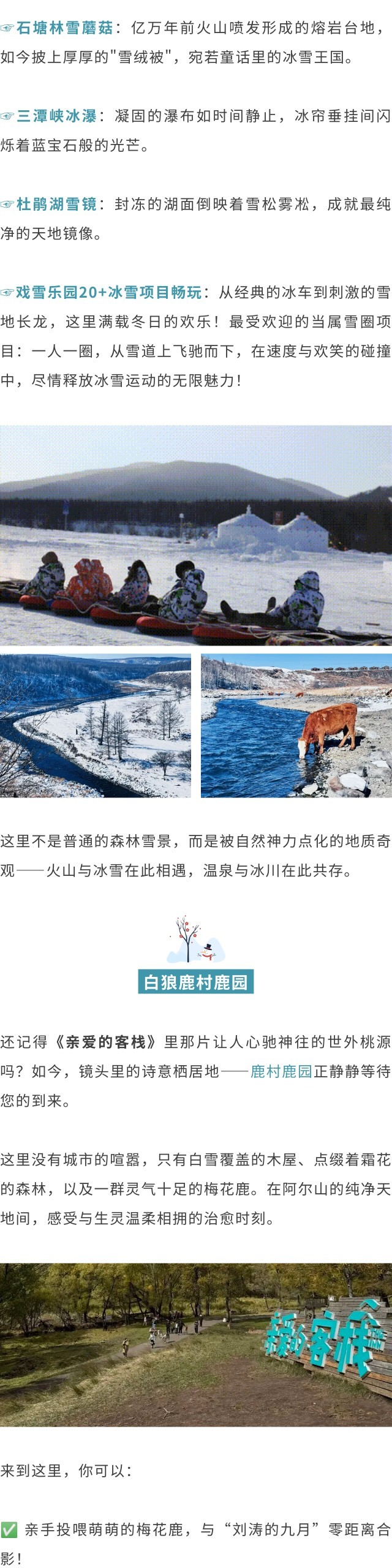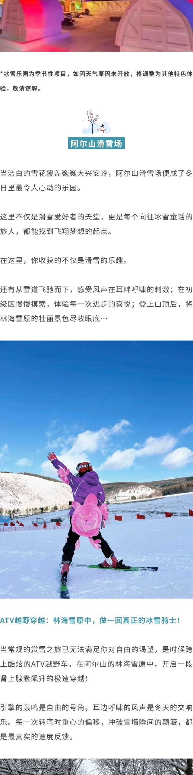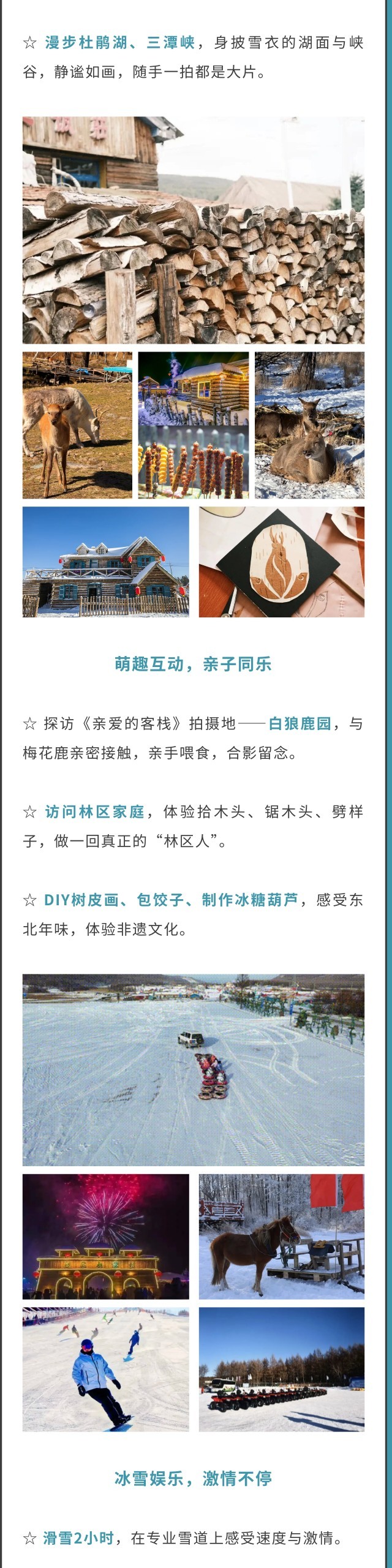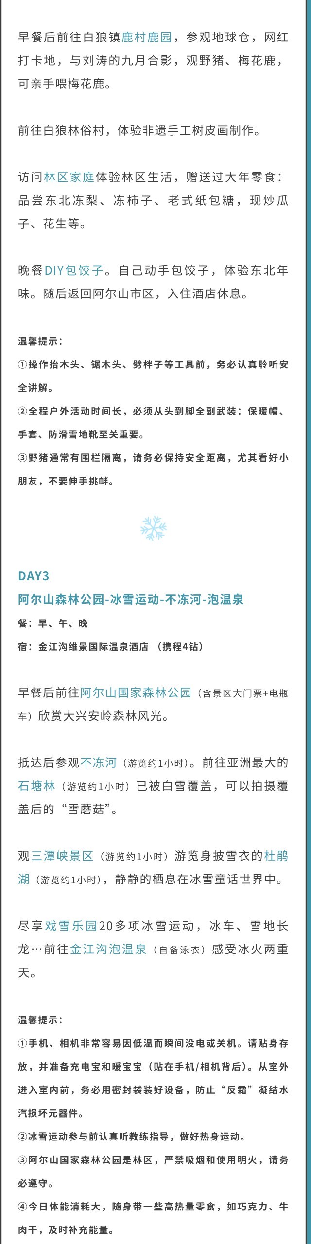 鹿村鹿园投喂梅花鹿、手作非遗树皮画、体验林区生活、品尝东北冻果炒货、包饺子、游玩戏雪乐园、金江沟泡温泉、泼水成冰、DIY冰糖葫芦、阿尔山滑雪、ATV越野车体验、打卡阿尔山五里泉等。