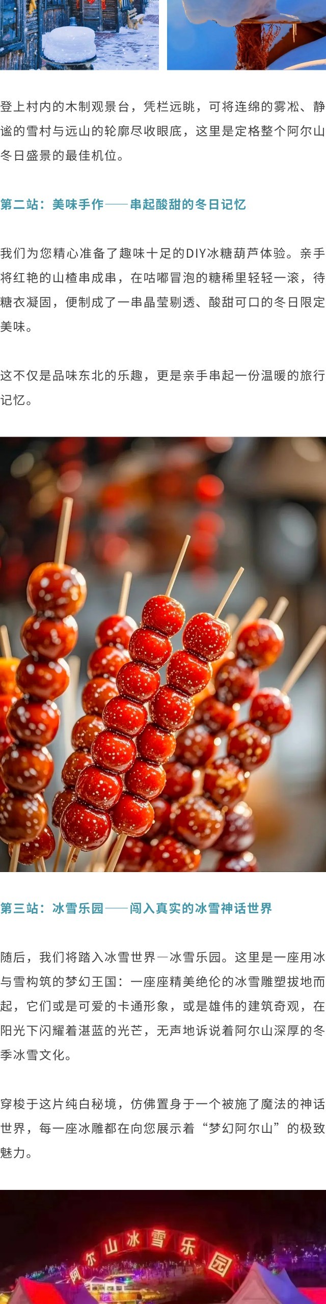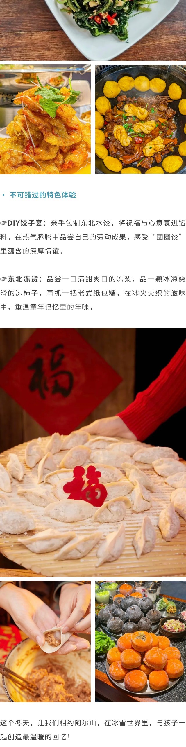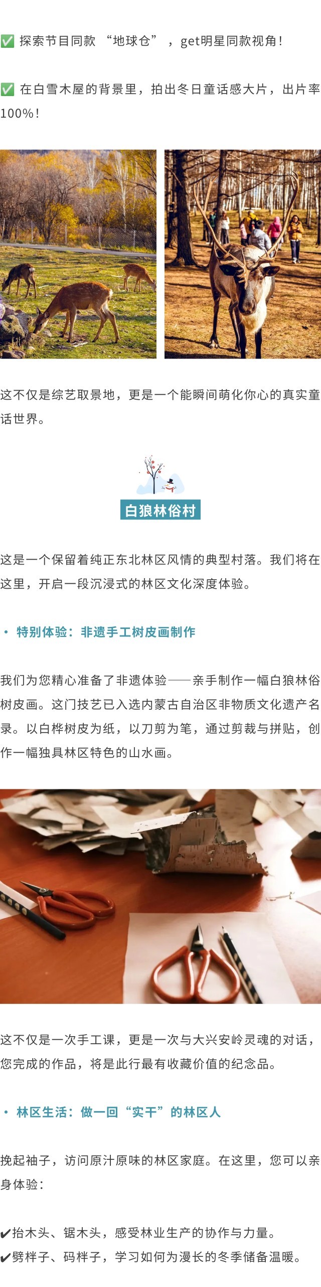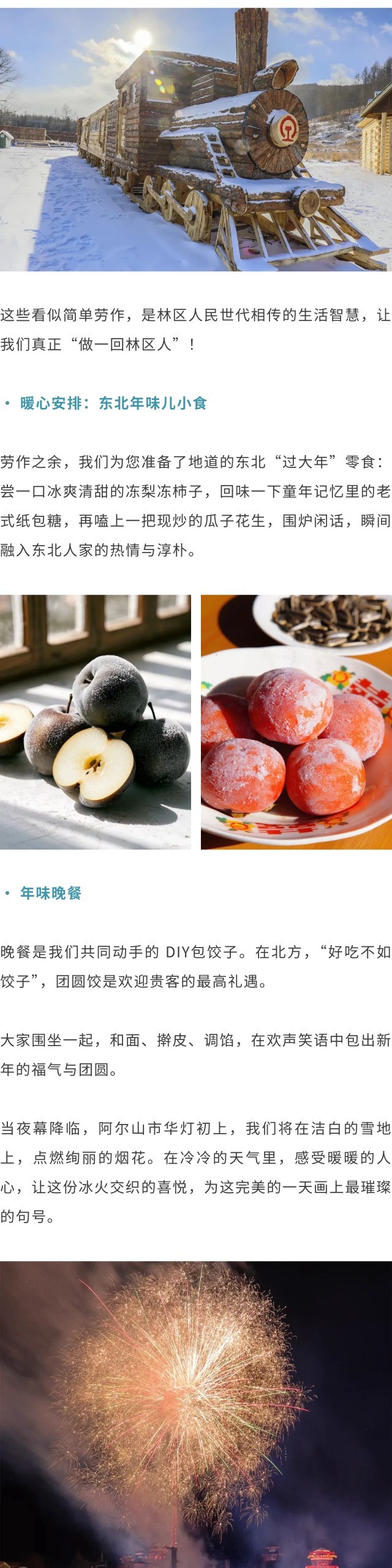 鹿村鹿园投喂梅花鹿、手作非遗树皮画、体验林区生活、品尝东北冻果炒货、包饺子、游玩戏雪乐园、金江沟泡温泉、泼水成冰、DIY冰糖葫芦、阿尔山滑雪、ATV越野车体验、打卡阿尔山五里泉等。