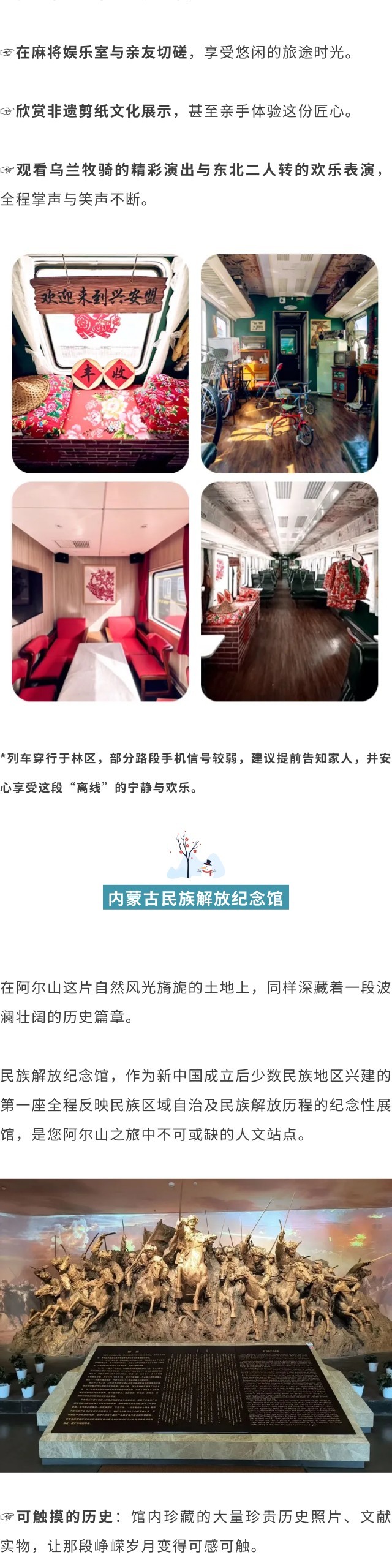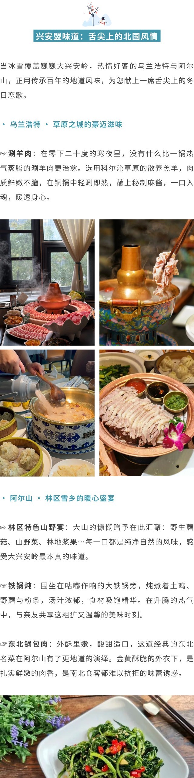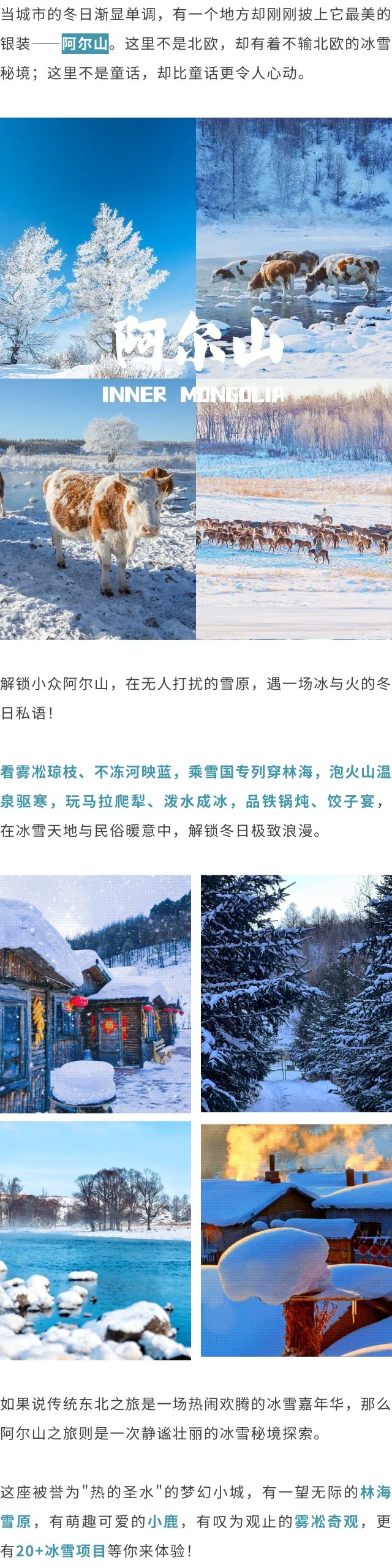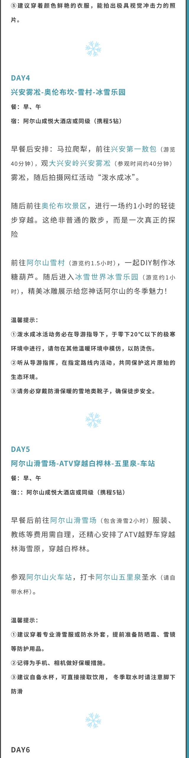 鹿村鹿园投喂梅花鹿、手作非遗树皮画、体验林区生活、品尝东北冻果炒货、包饺子、游玩戏雪乐园、金江沟泡温泉、泼水成冰、DIY冰糖葫芦、阿尔山滑雪、ATV越野车体验、打卡阿尔山五里泉等。