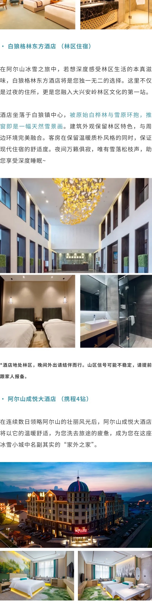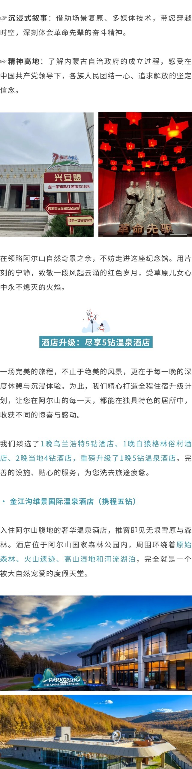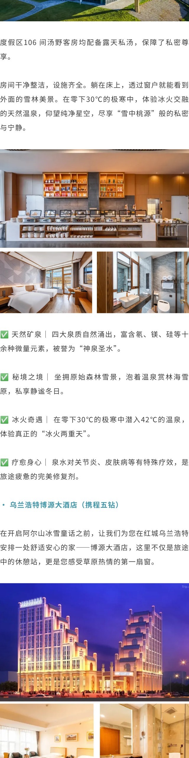 含5晚酒店入住,包括:乌兰浩特博源大酒店或同级1晚、白狼格林东方酒店或同级1晚、金江沟维景国际温泉酒店或同级1晚、阿尔山成悦大酒店或同级2晚。