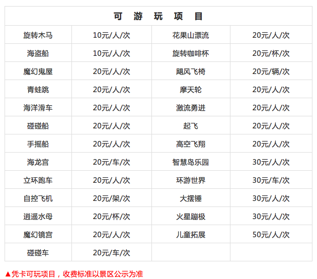注:储值卡,按项目收费,具体收费标准以景区公示为准