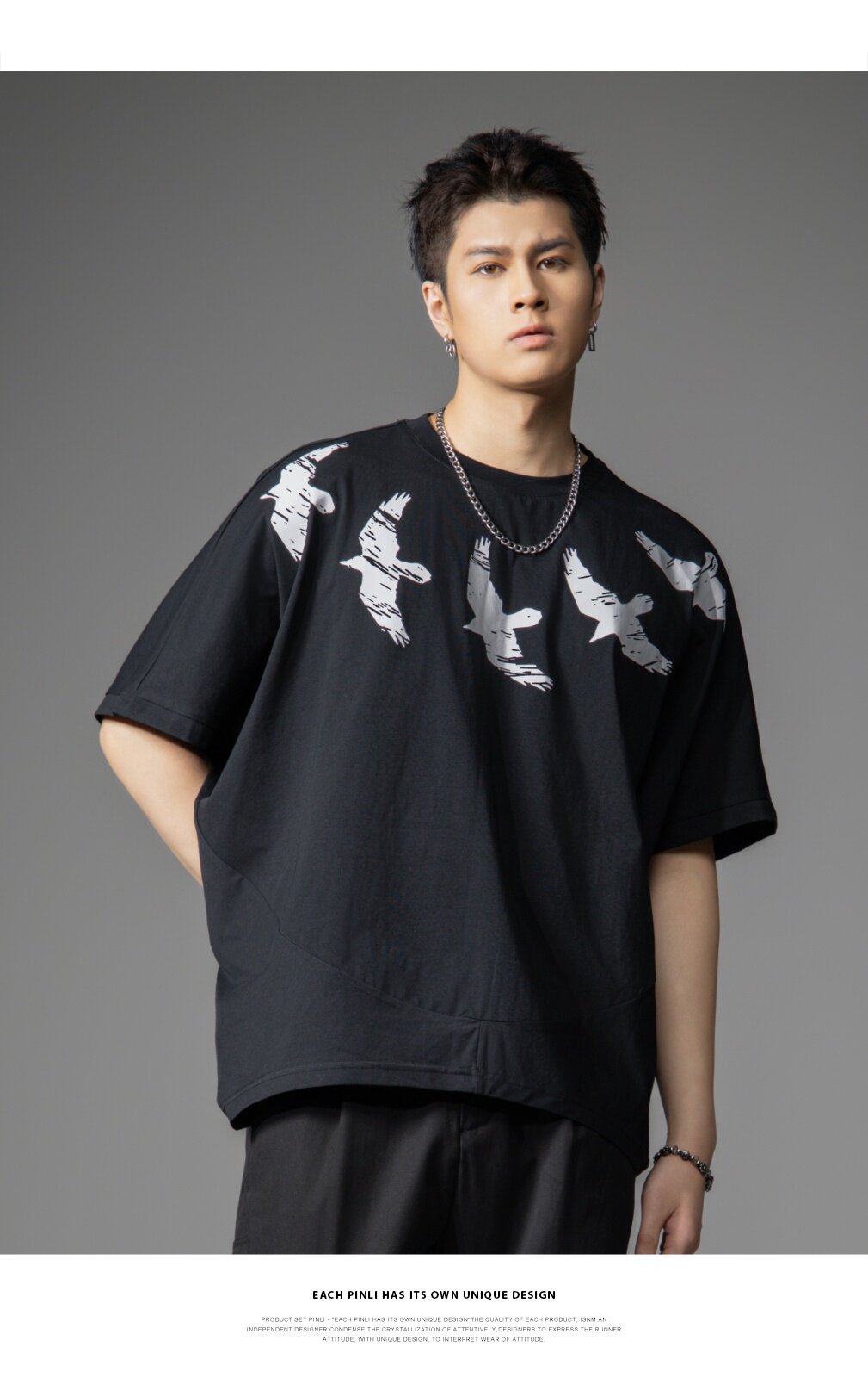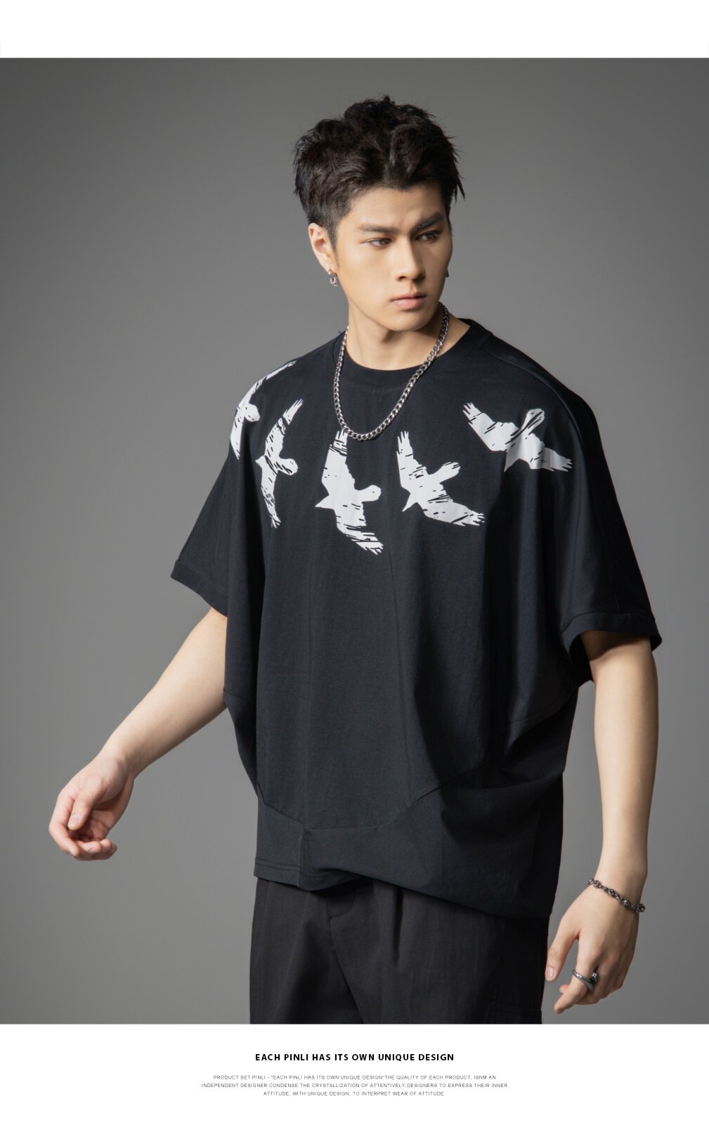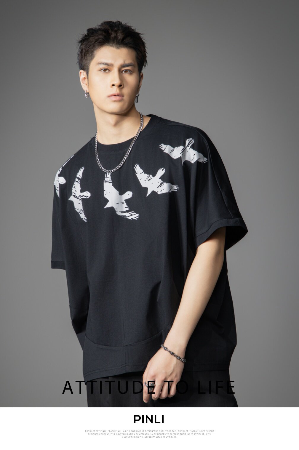 PINLI品立2026春季新款男士宽松插肩袖动物印花圆领短袖T恤潮牌B262111016