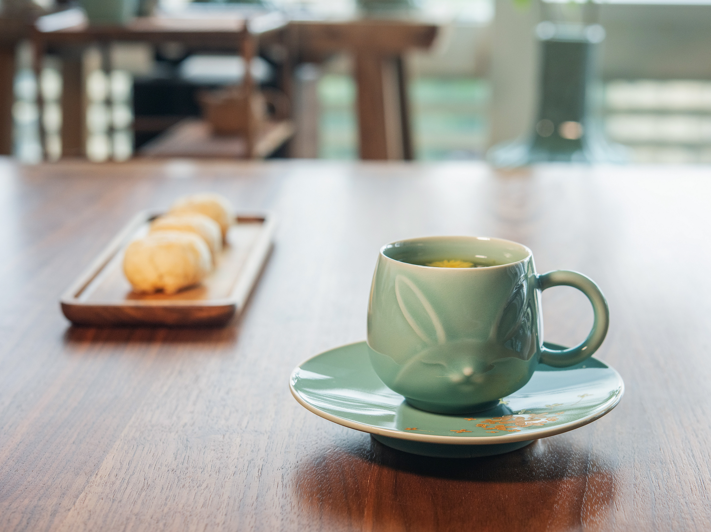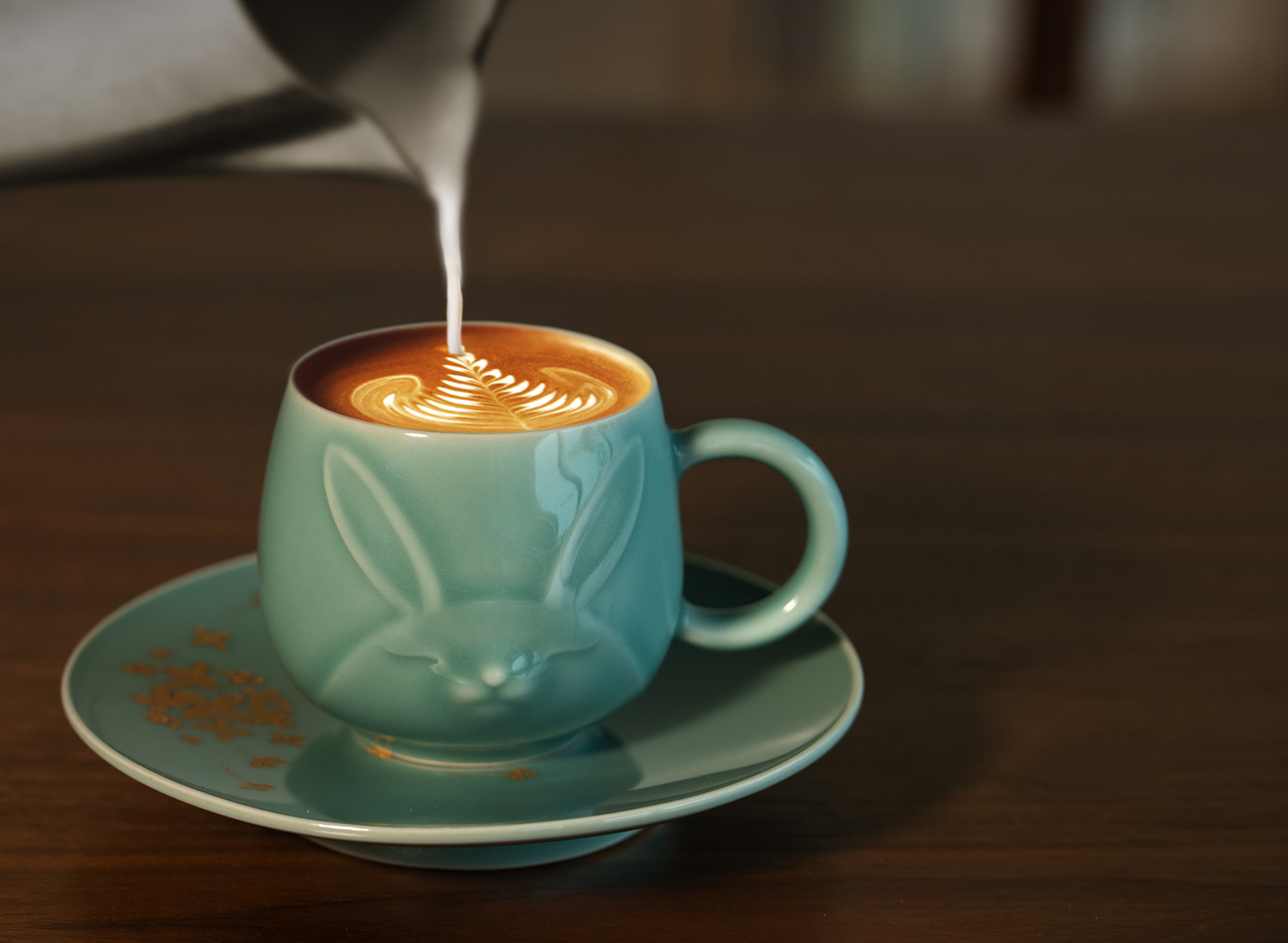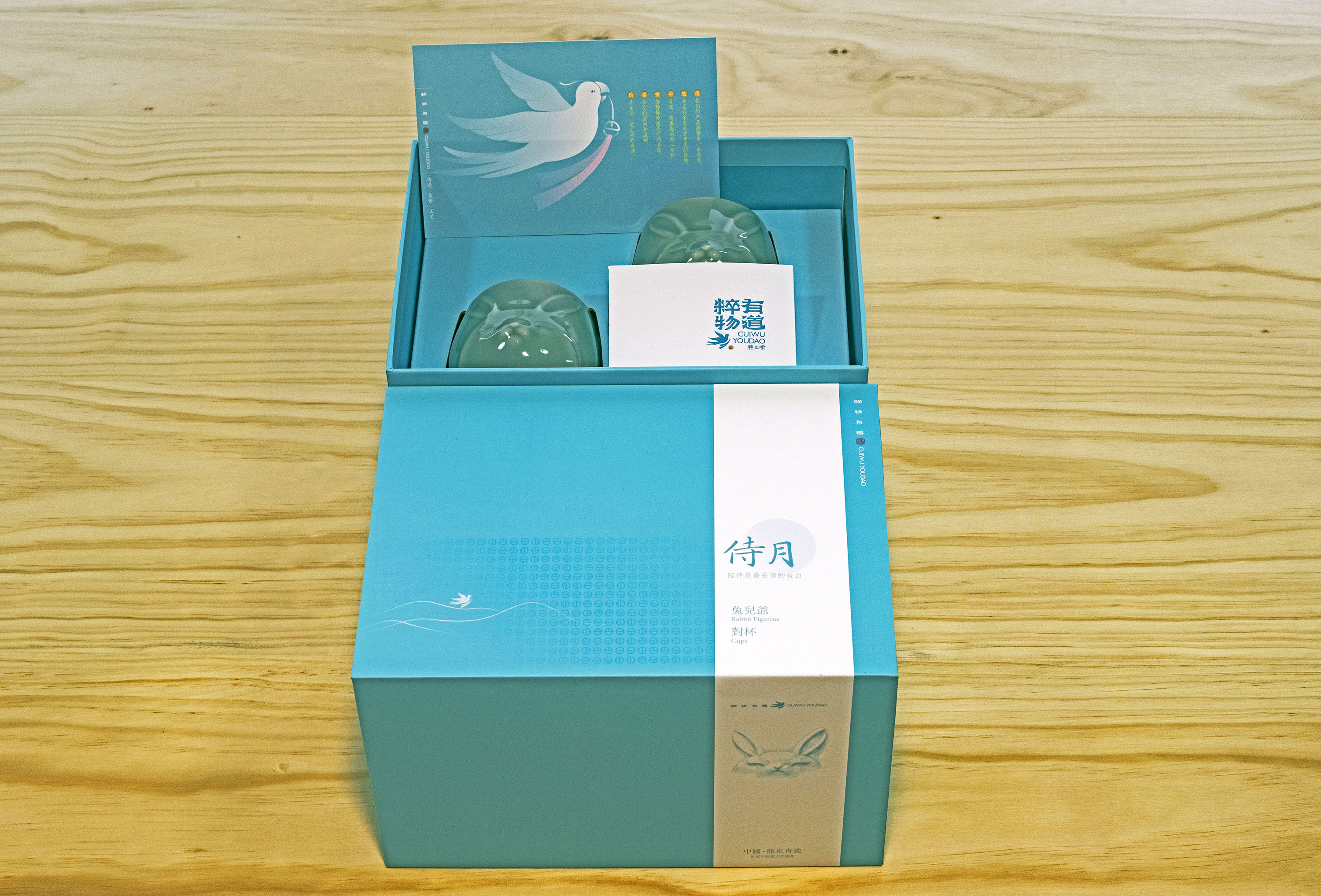 杯型圆融,直口、鼓腹、圈足;杯身上的兔子造型采用浅浮雕的技艺,运用龙泉青瓷“显筋露白”的特点,用简单的线条和釉层深浅来生动地展示来可爱呆萌的兔子形象。仔细看,杯子对称面还有一个兔子尾巴的造型。