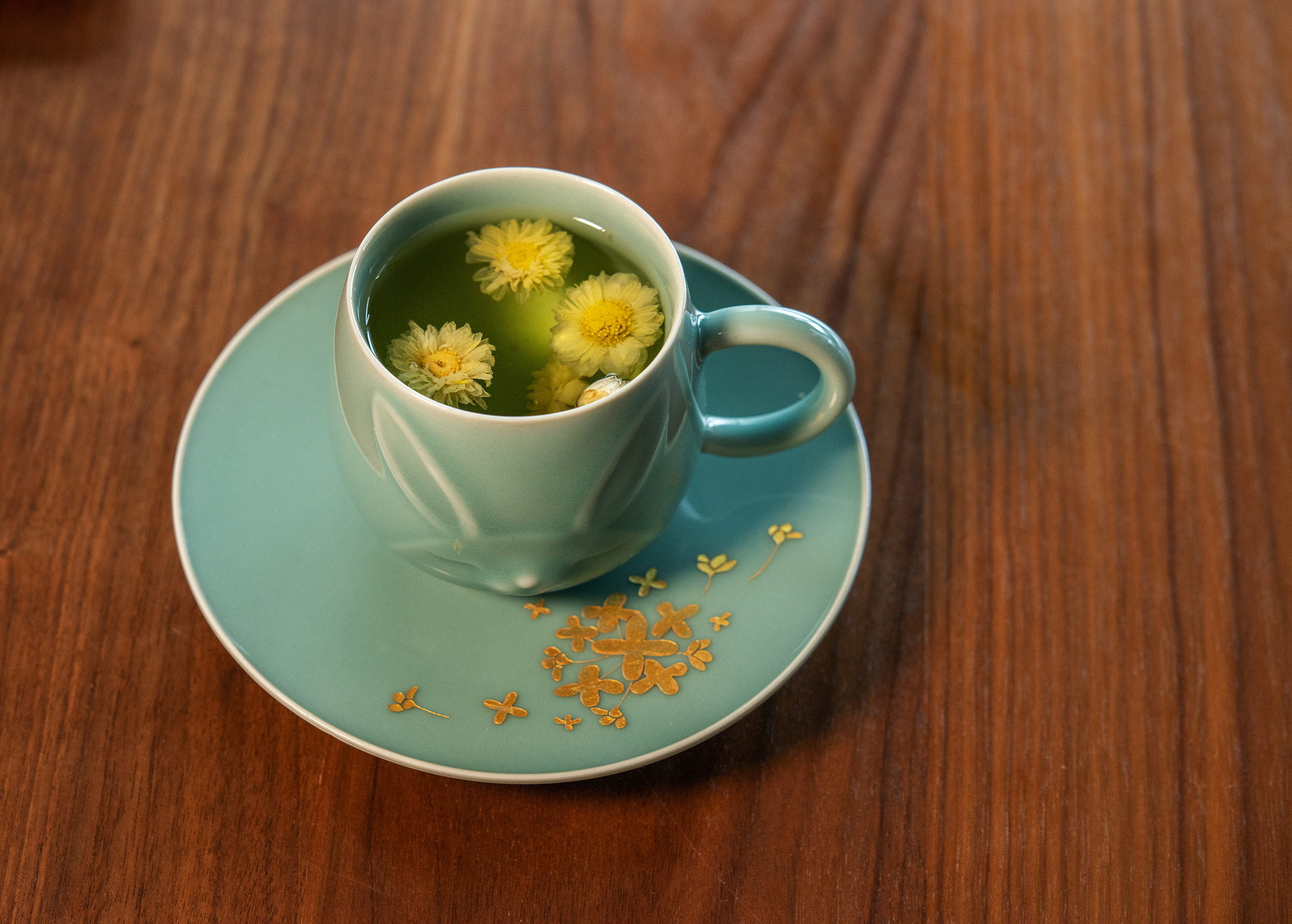 青瓷托盘采用激光雕刻技术点缀了金色桂花图案。杯子采用龙泉弟窑粉青釉烧制,釉色清亮如玉,冰莹美丽,胜似青玉。