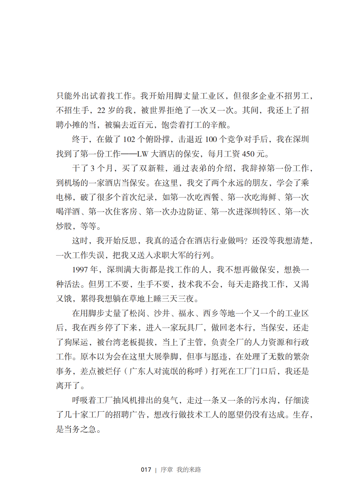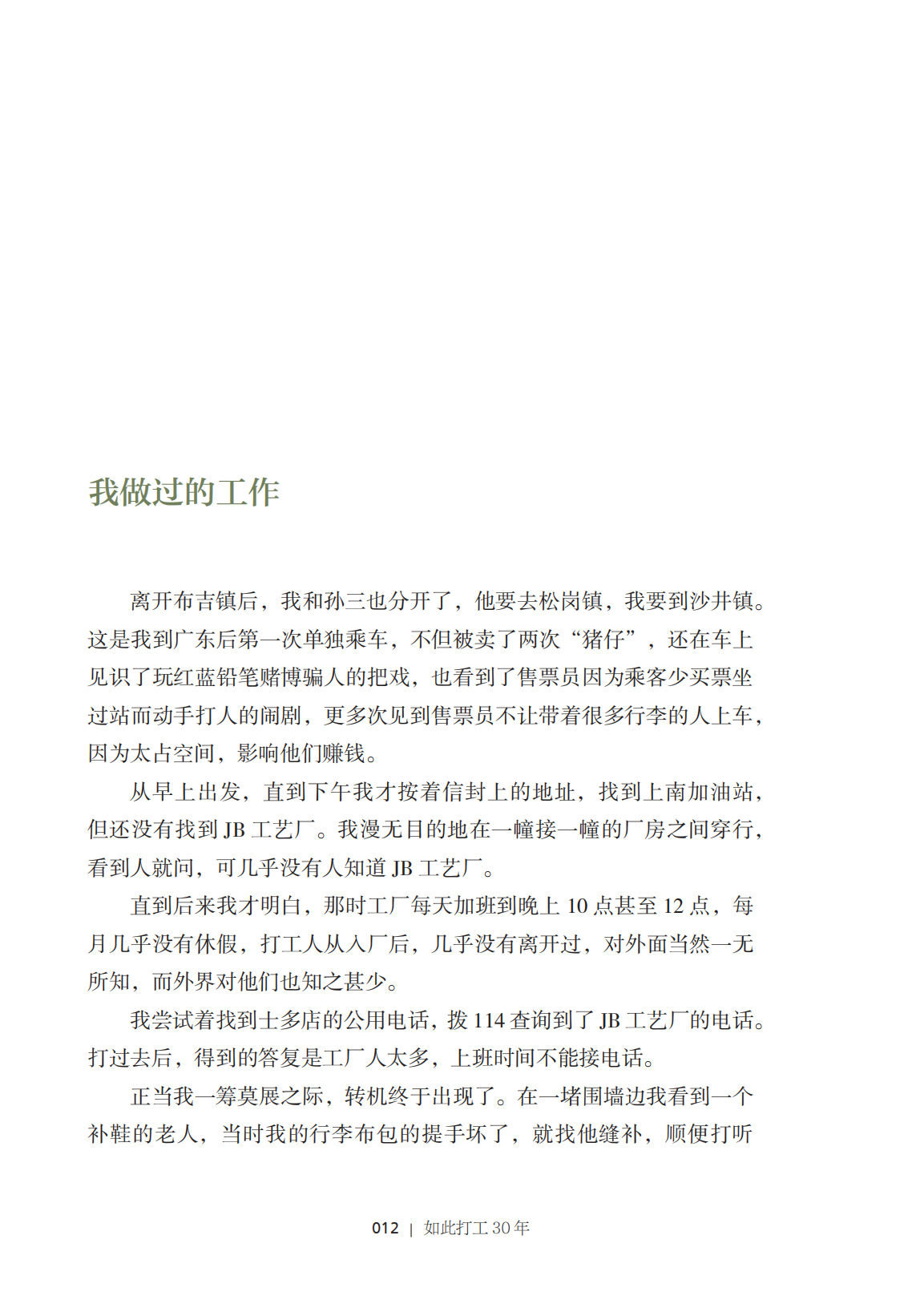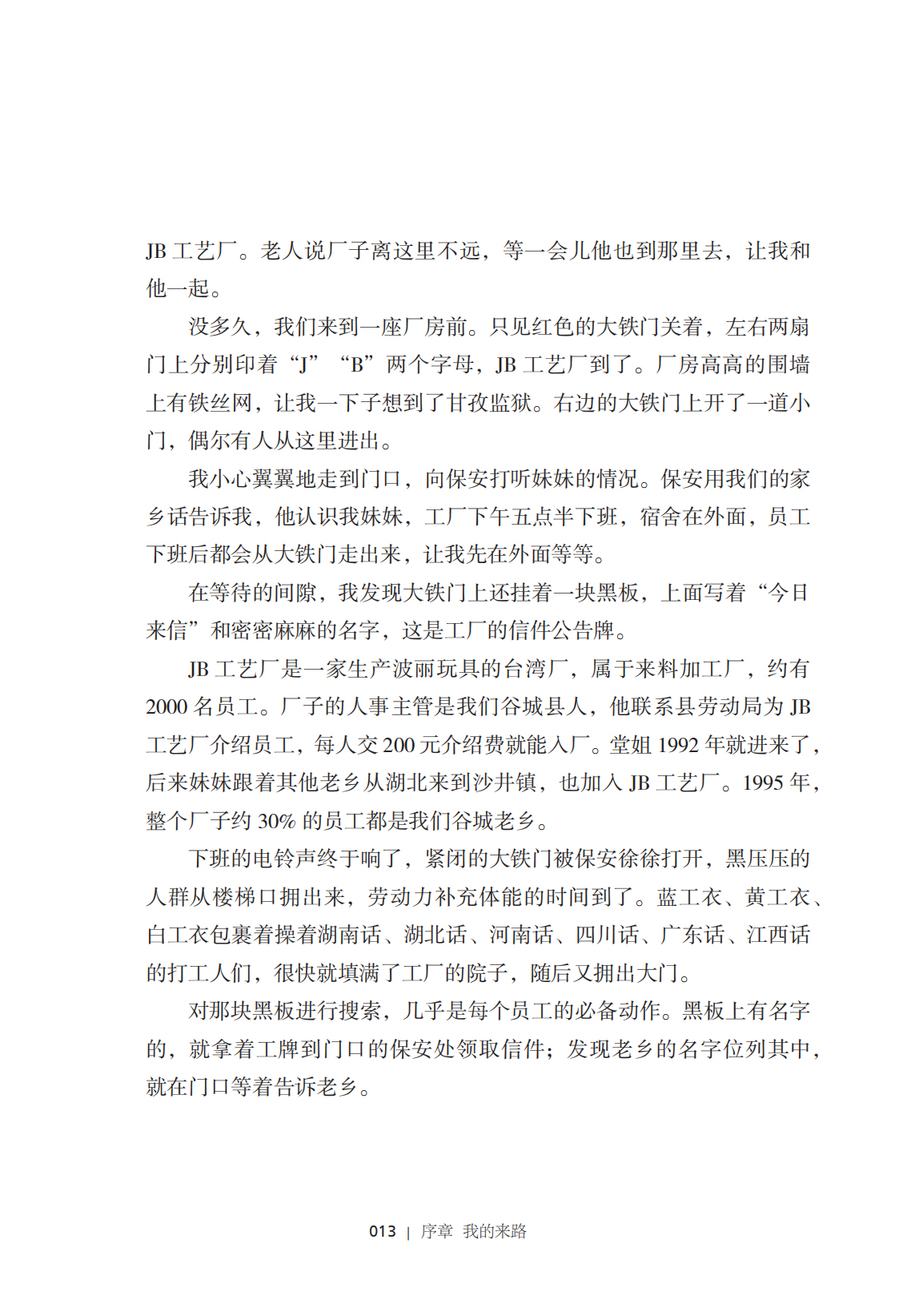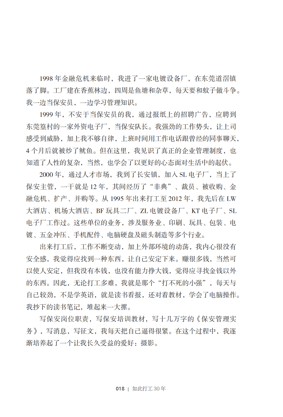 本书作者占有兵就是其中之一。他 1995 年到广东,一待就是 30 年,大部分时间在工厂做保安。他看到打工人们为一个工作机会东奔西走,在车间里忙到昼夜不分,赶着吃饭,赶着上厕所,挤出时间恋爱和补眠。