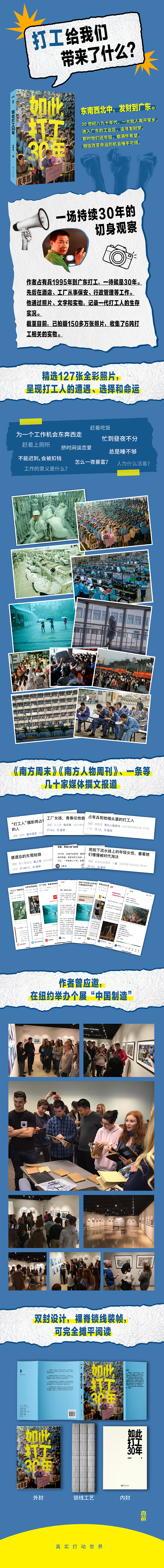 《如此打工 30 年》 打工给我们带来了什么?一场持续 30 年的切身观察,精选 127 张全彩照片,呈现一代打工人的遭遇、选择和命运。