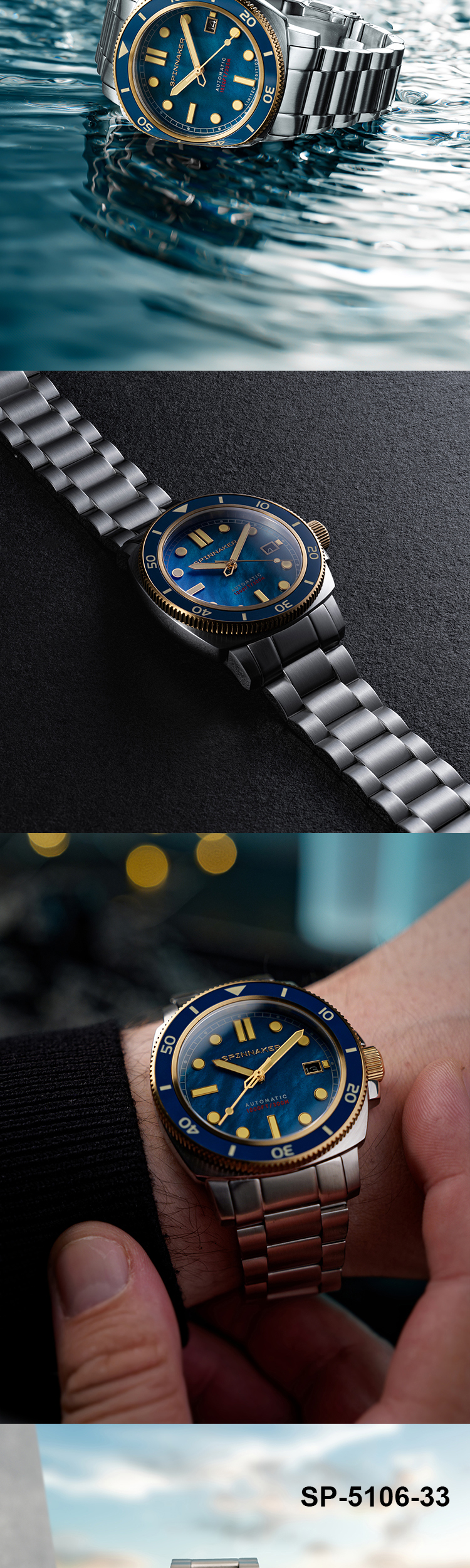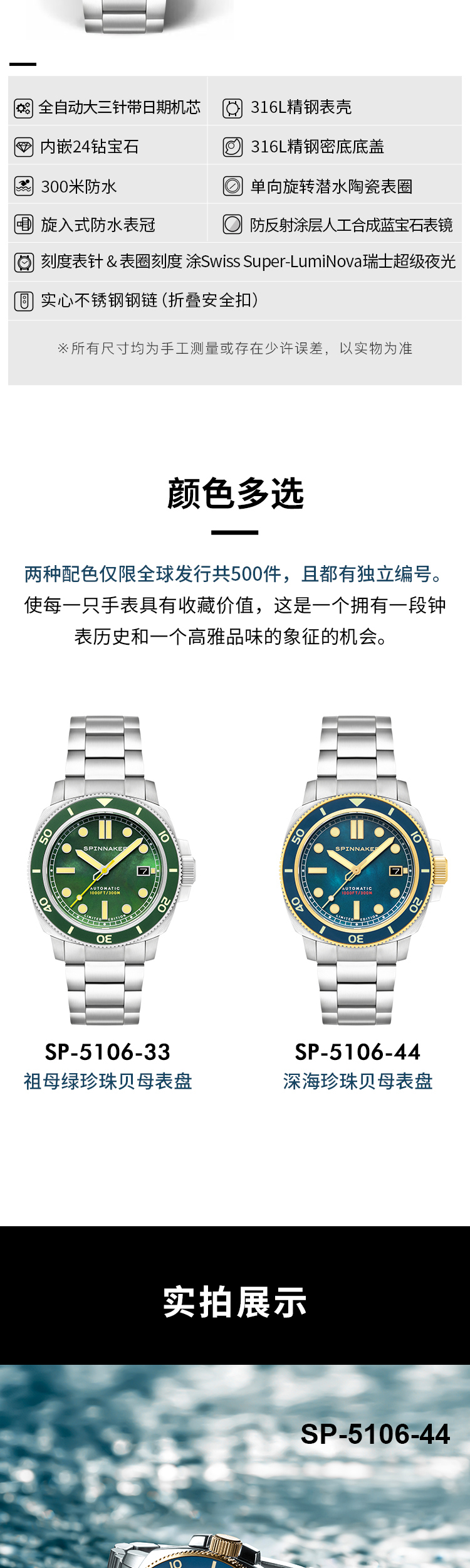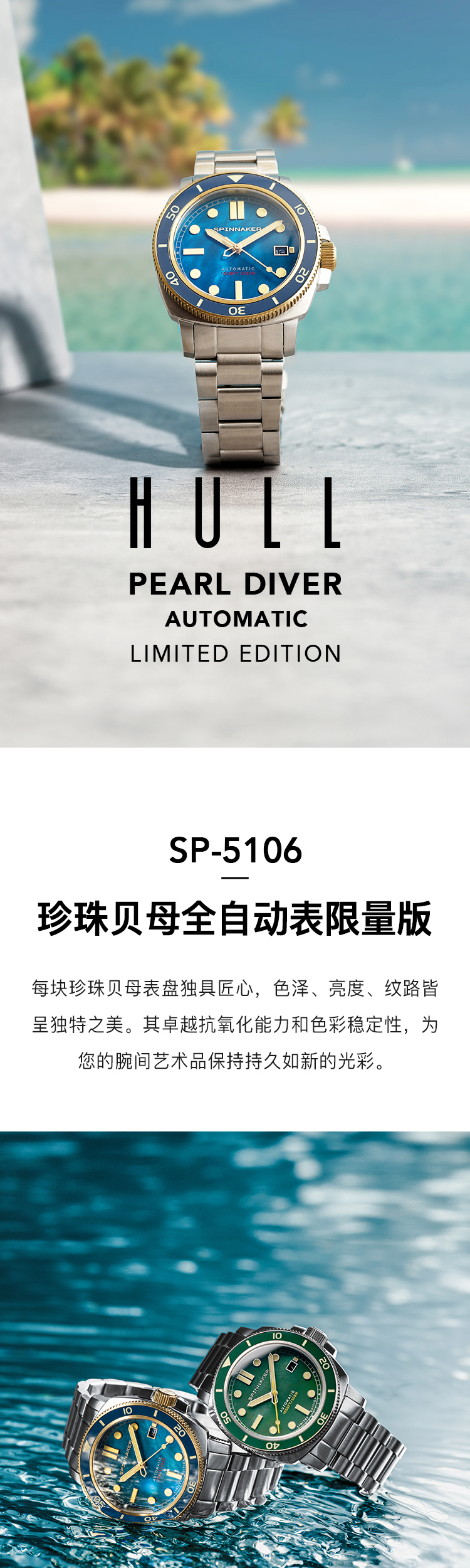 新款SPINNAKER三角帆天然贝母盘自动机械手表限量版夜光防水5106