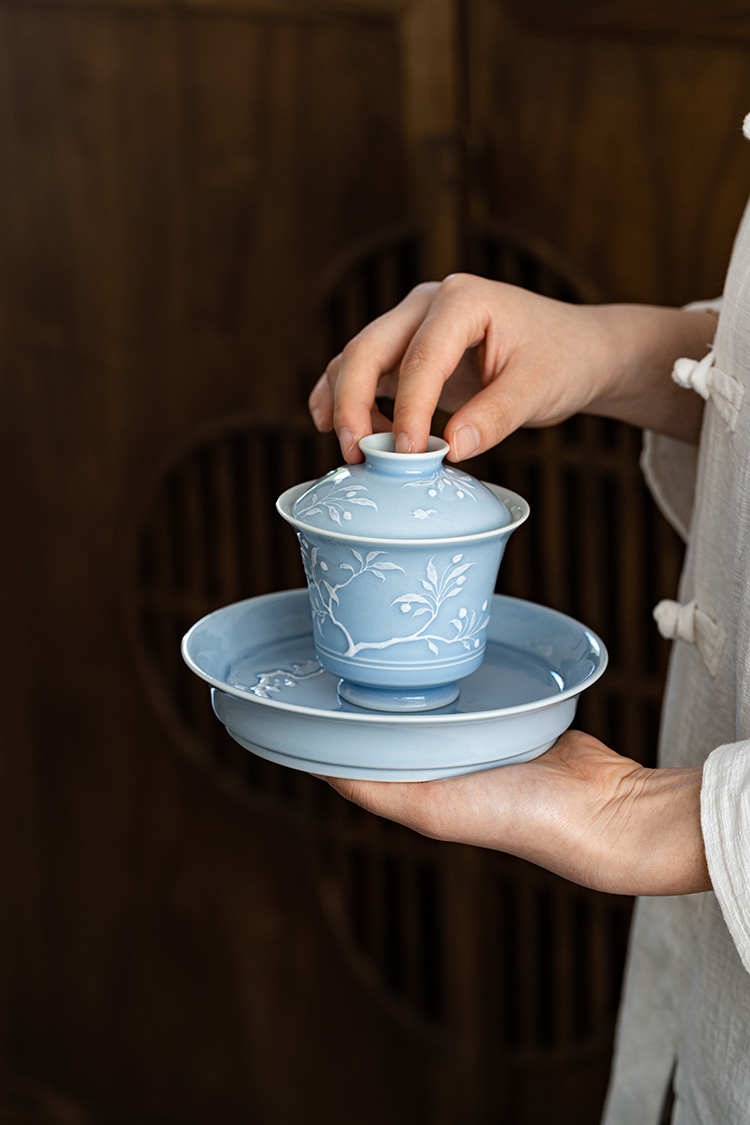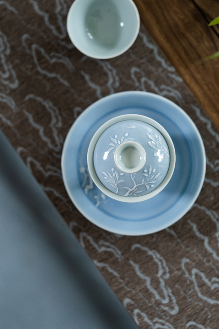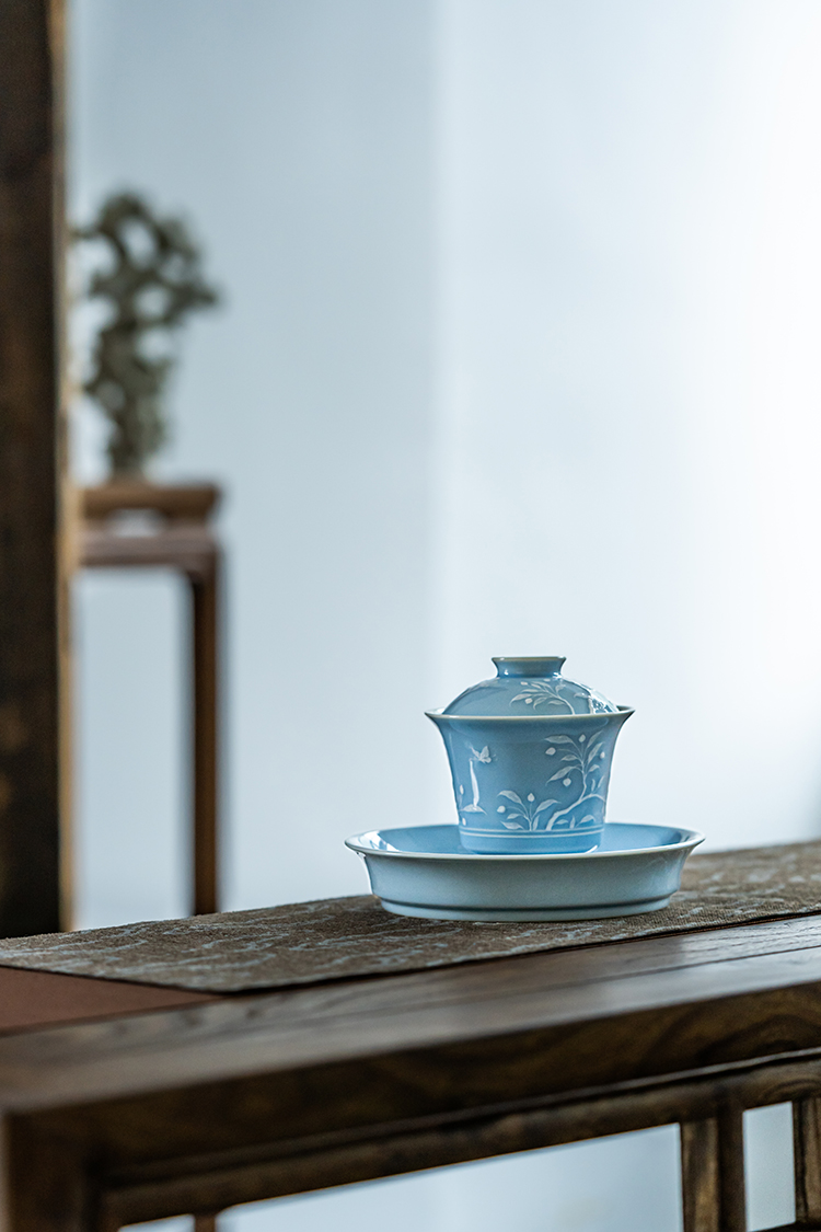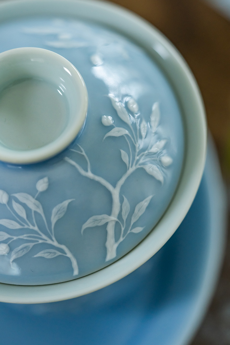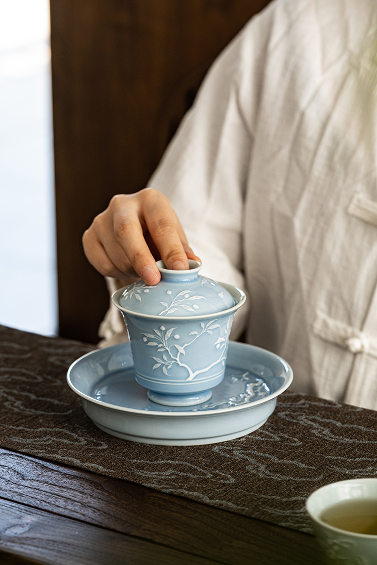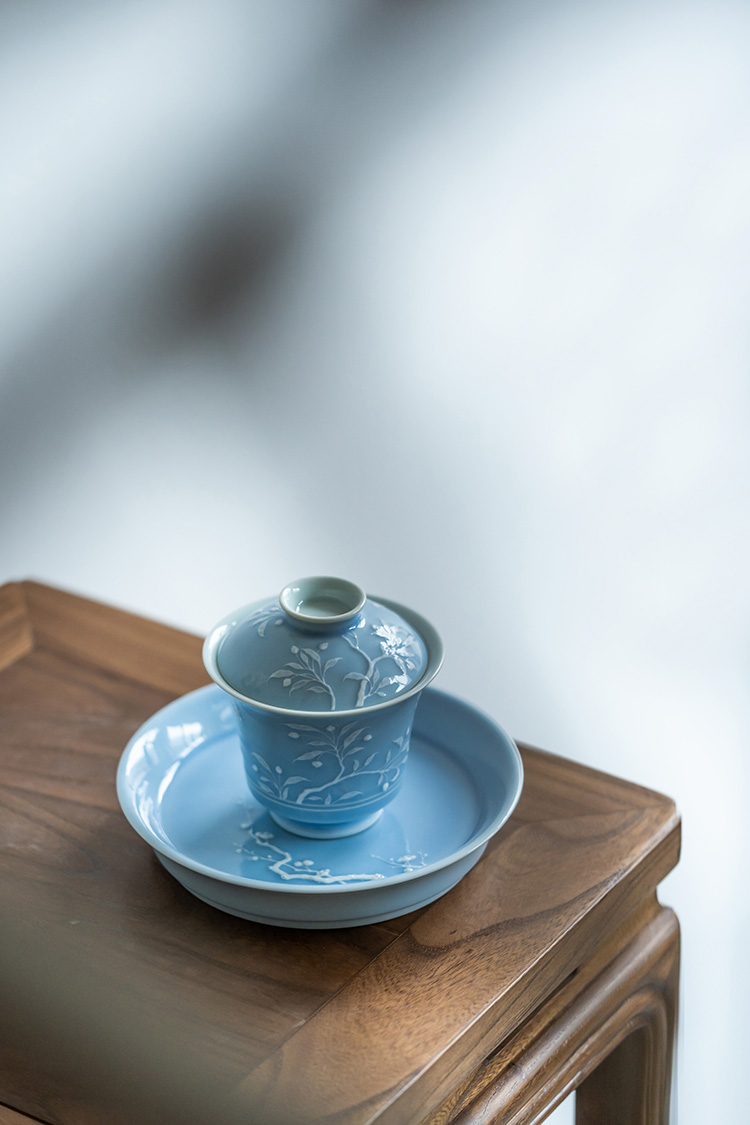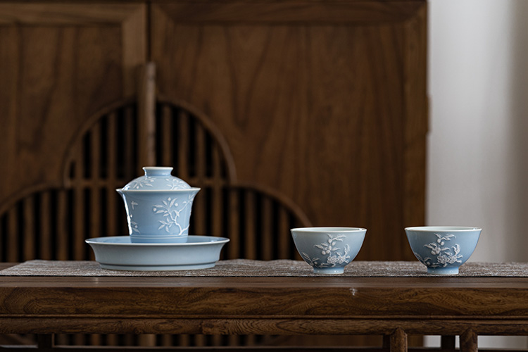寒香慕古 天青釉堆雕花卉盖碗 + 壶承 + 2杯子 (缺货)