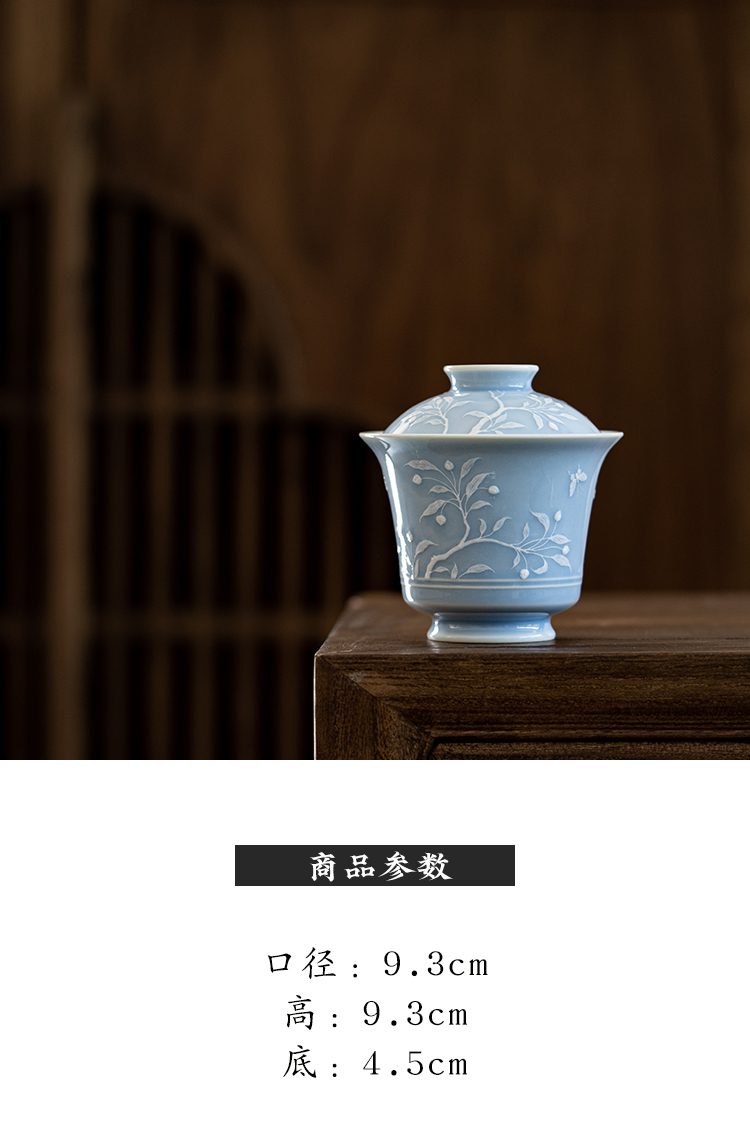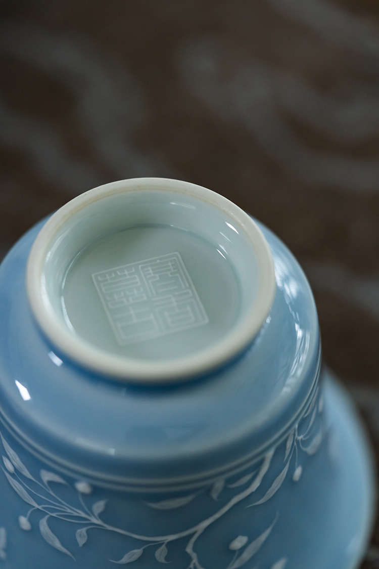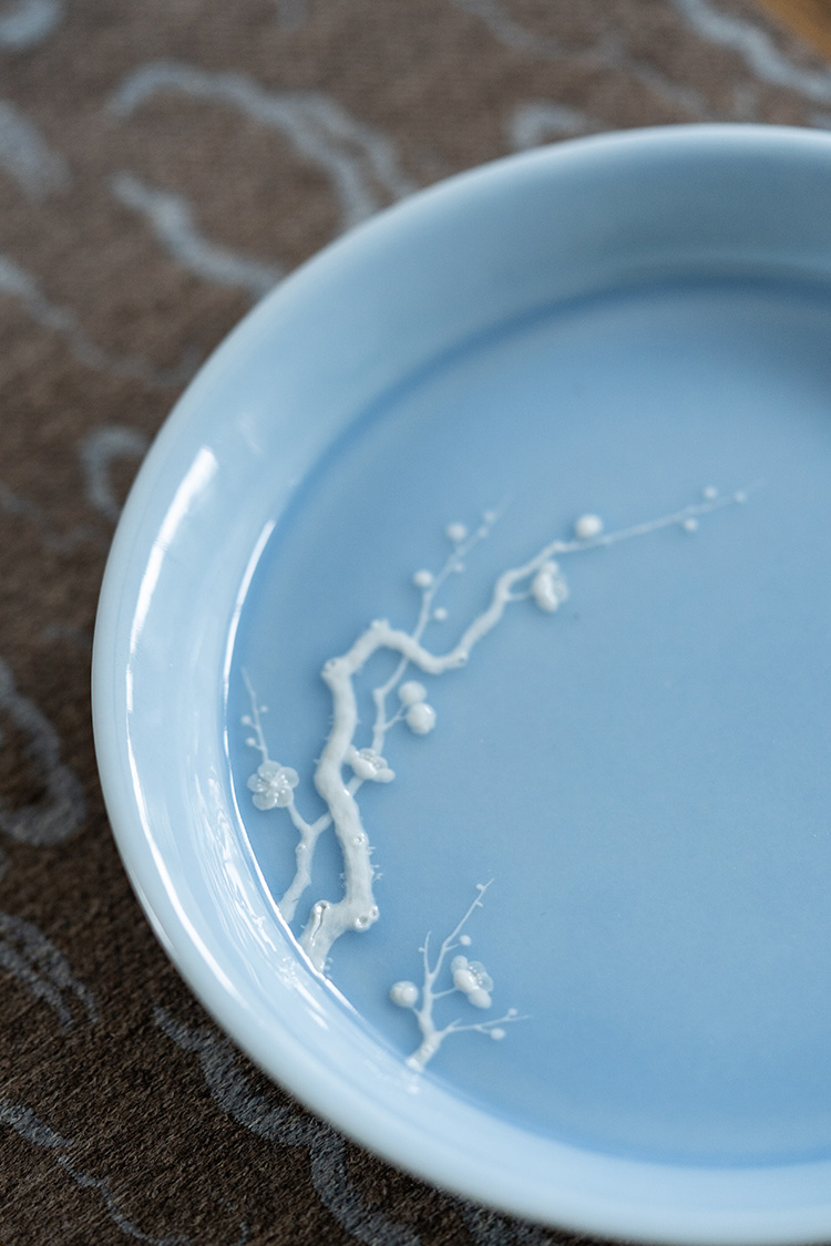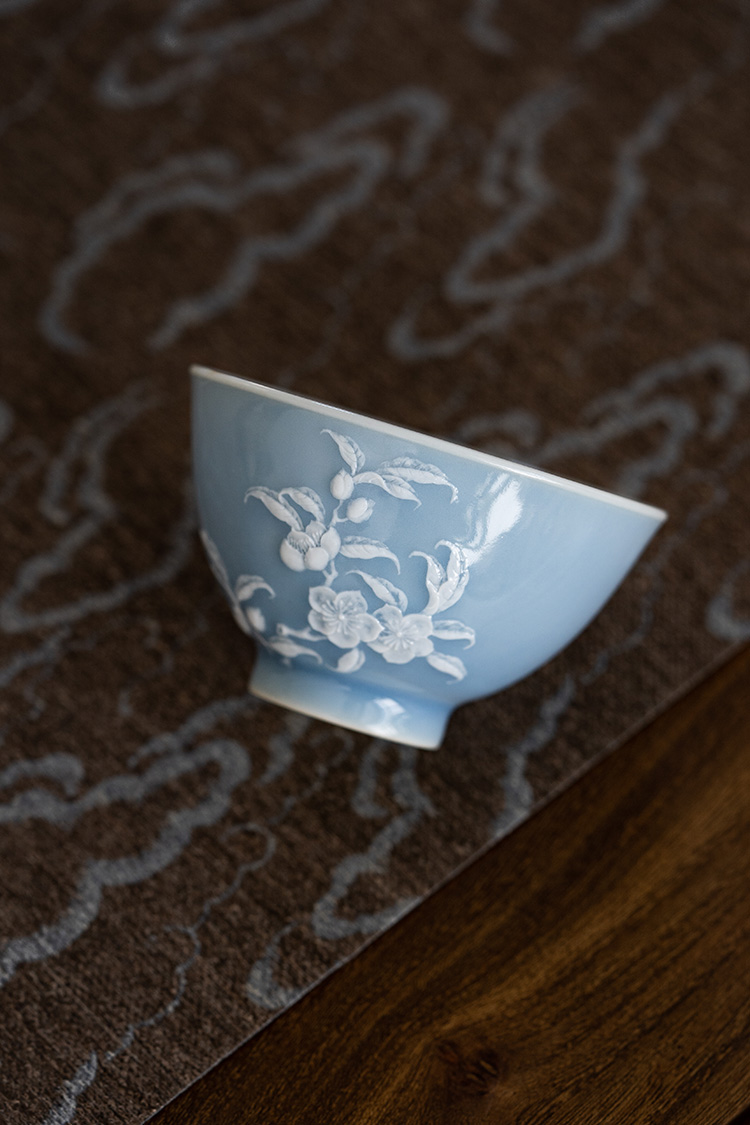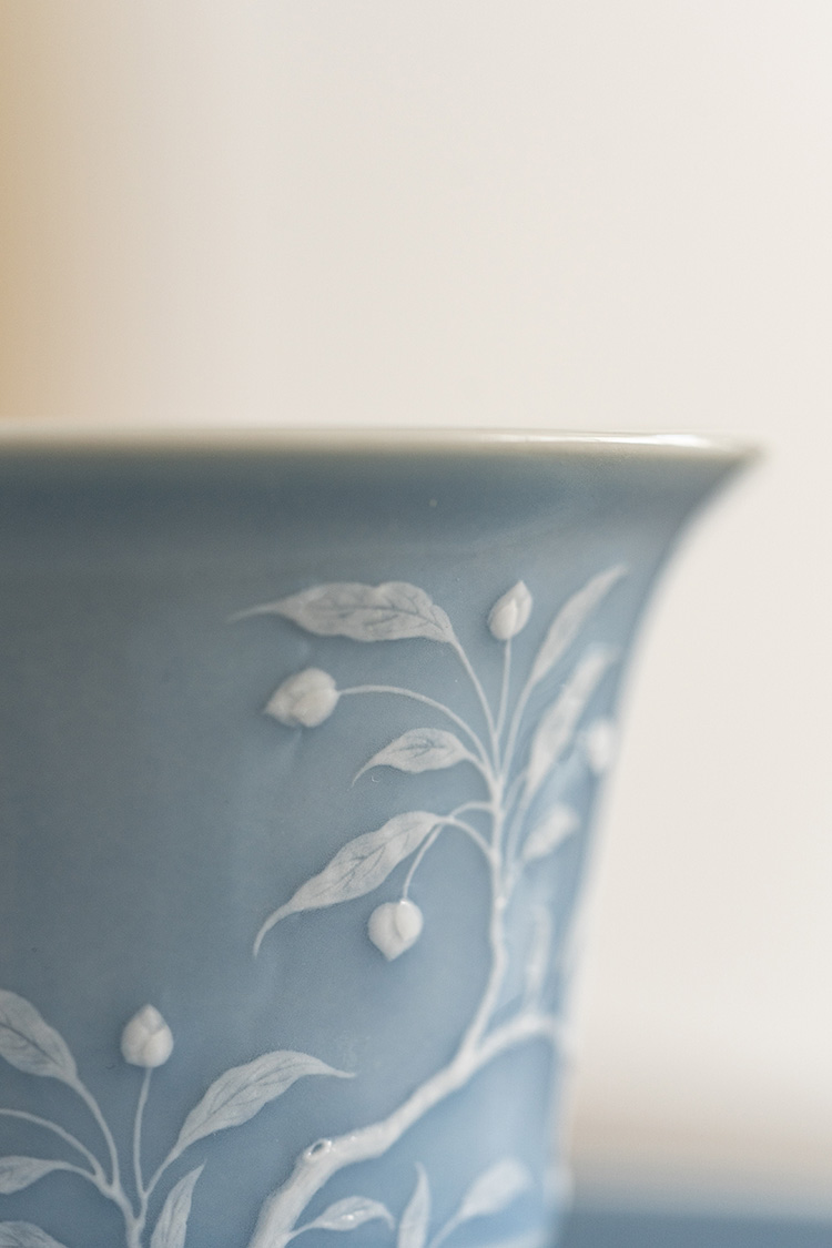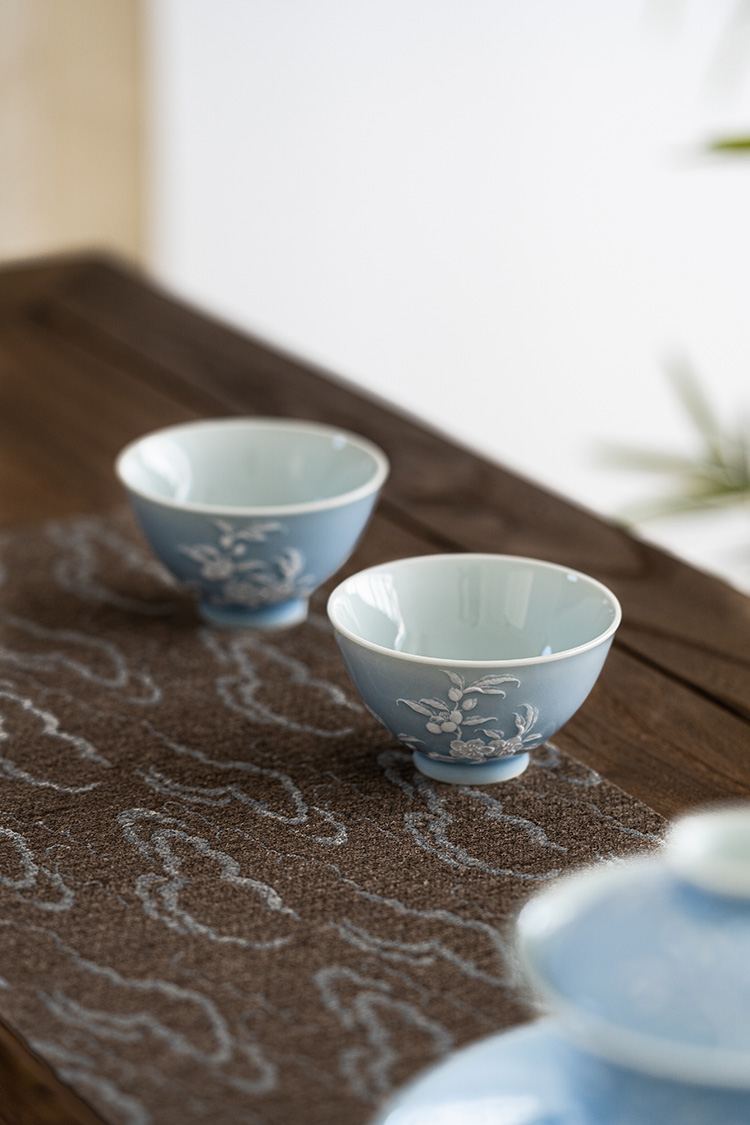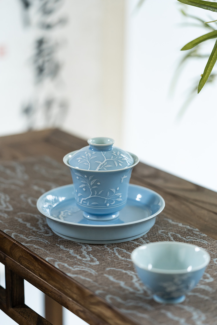 寒香慕古 天青釉堆雕花卉盖碗 + 壶承 + 2杯子 (缺货)