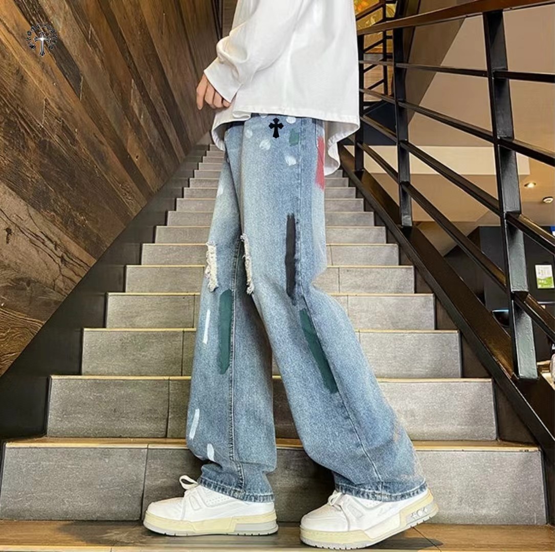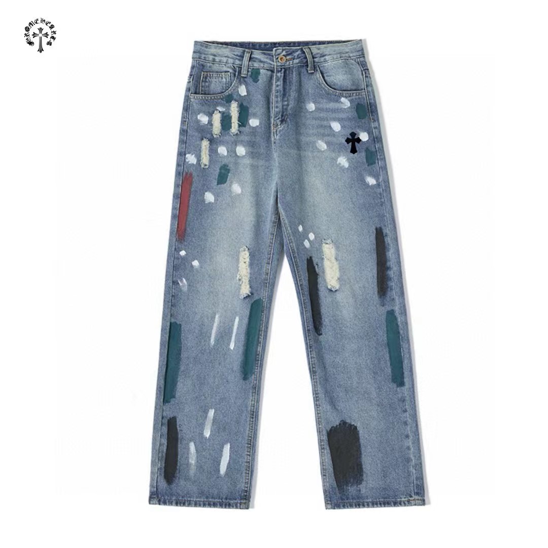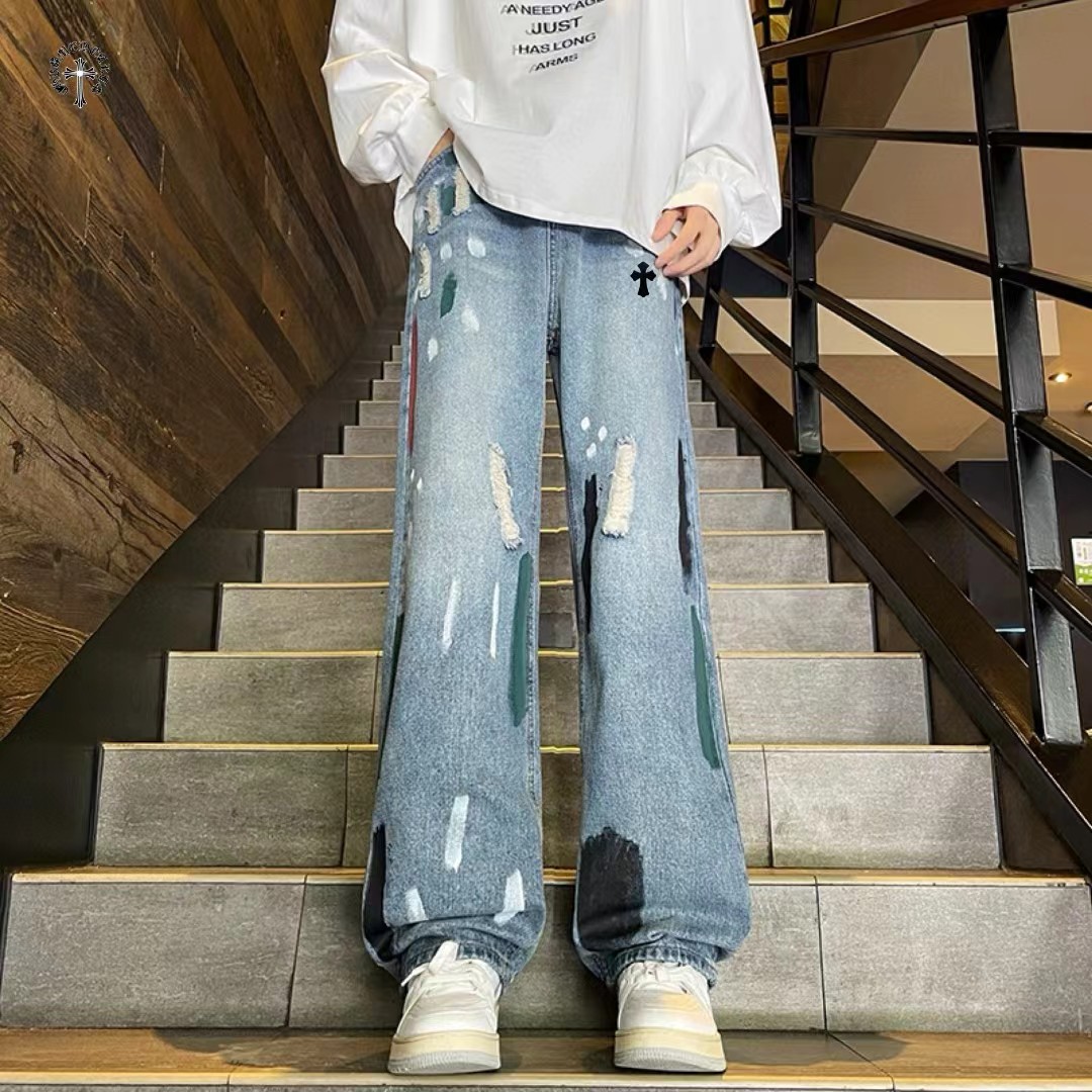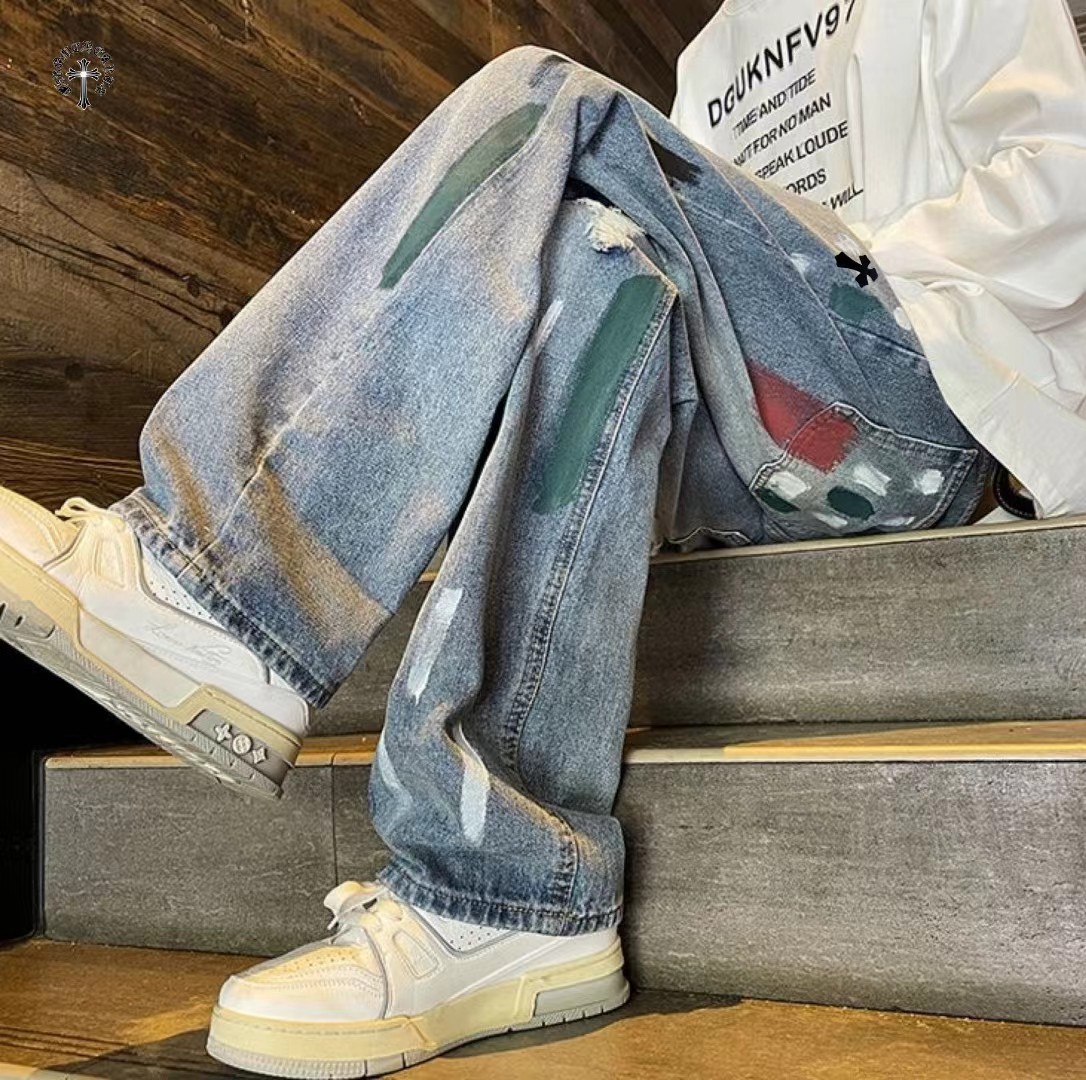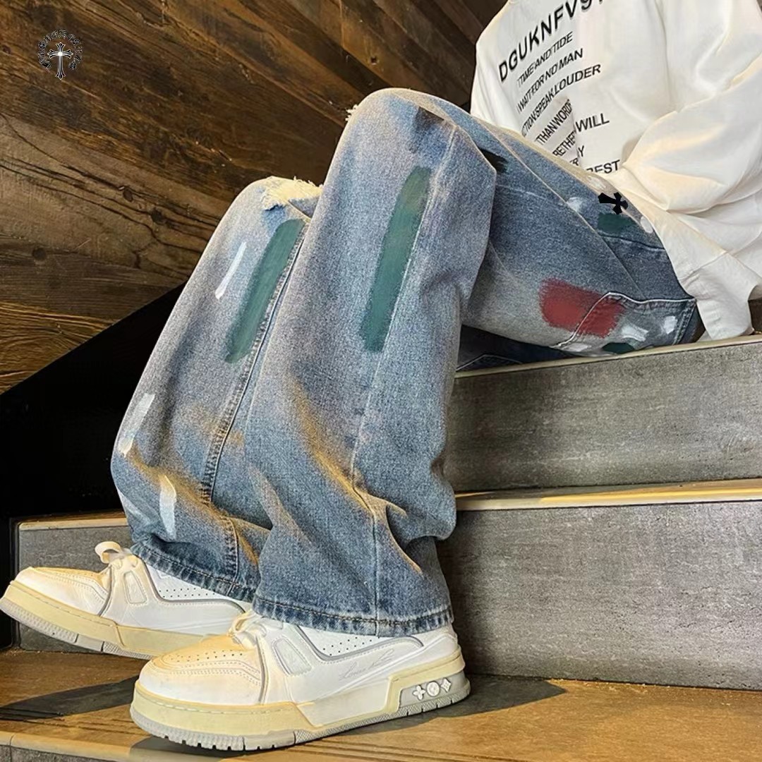 高品质重工水洗刺绣涂鸦美式复古洗旧直筒牛仔裤 裤子版型宽松 水洗牛仔面料耐磨耐脏 立体裁剪宽松版型 进口机器印花反复水洗不会开裂脱落 男女同款情侣款