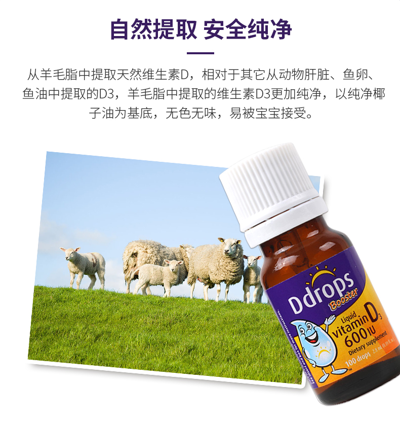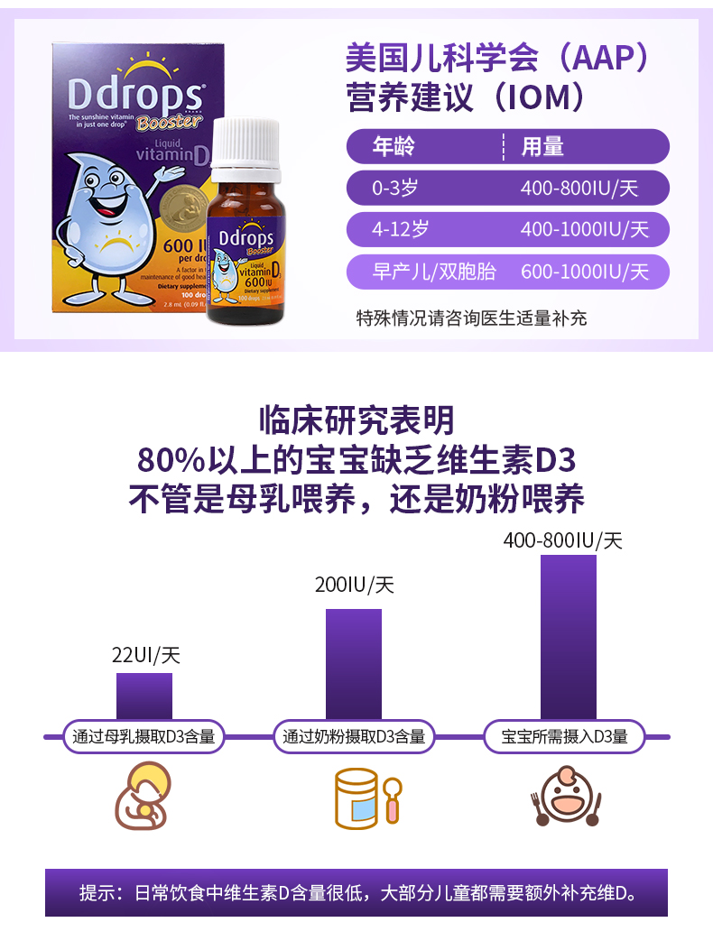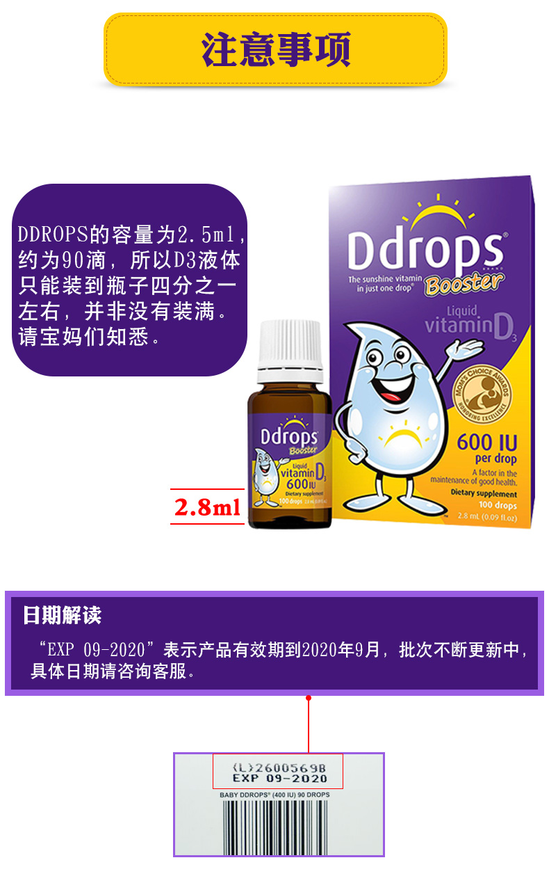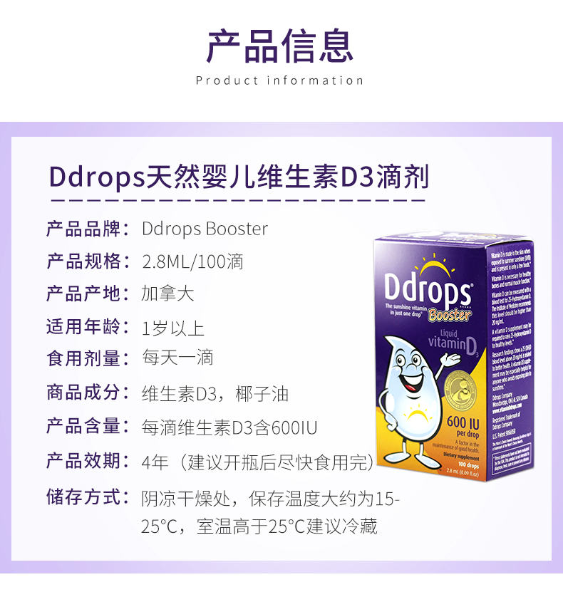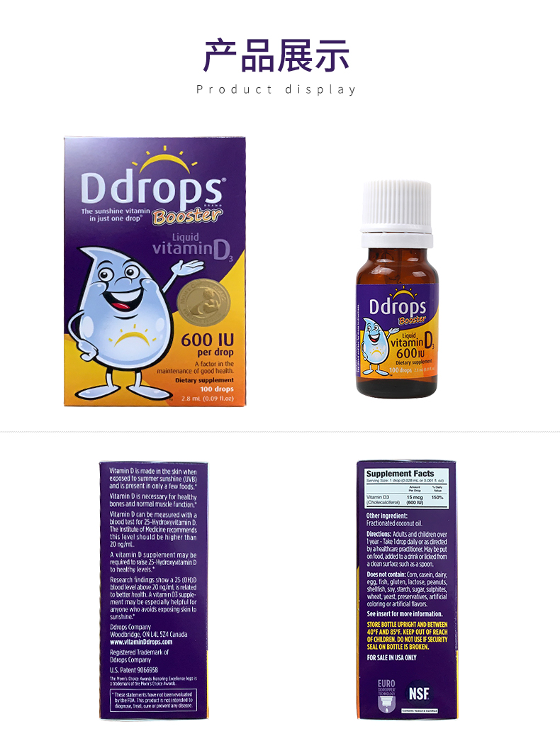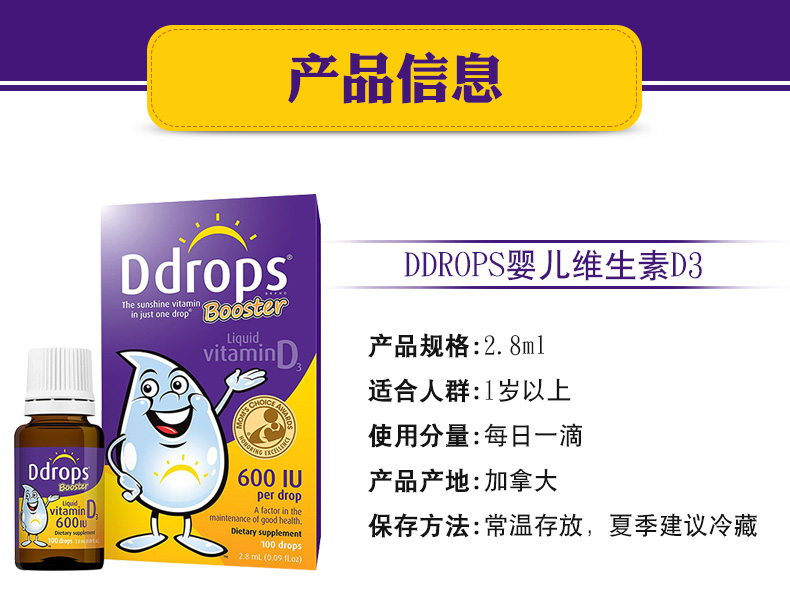 加拿大ddrops维生素D3滴剂婴幼儿600iu液体补钙防佝偻2.8ml