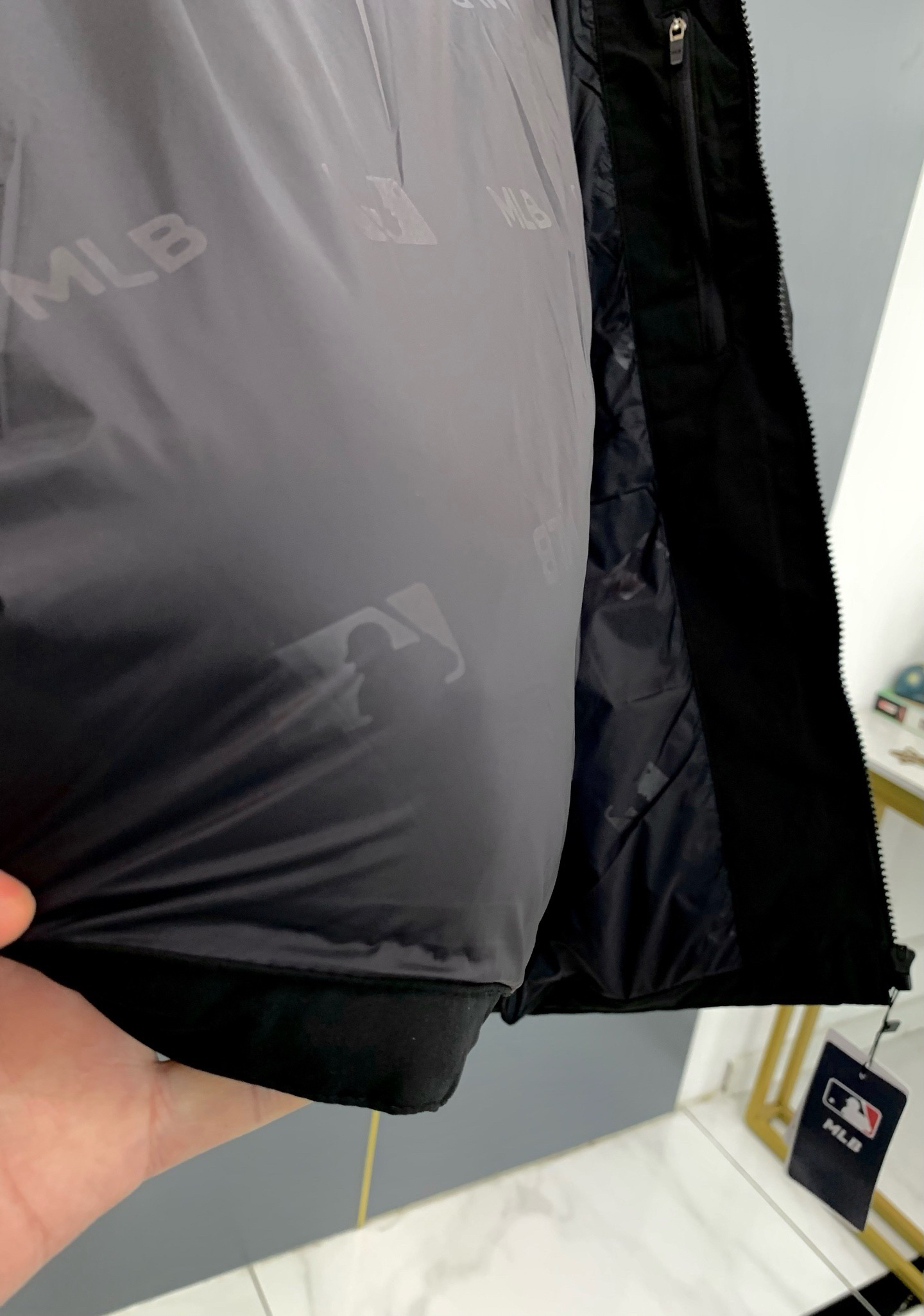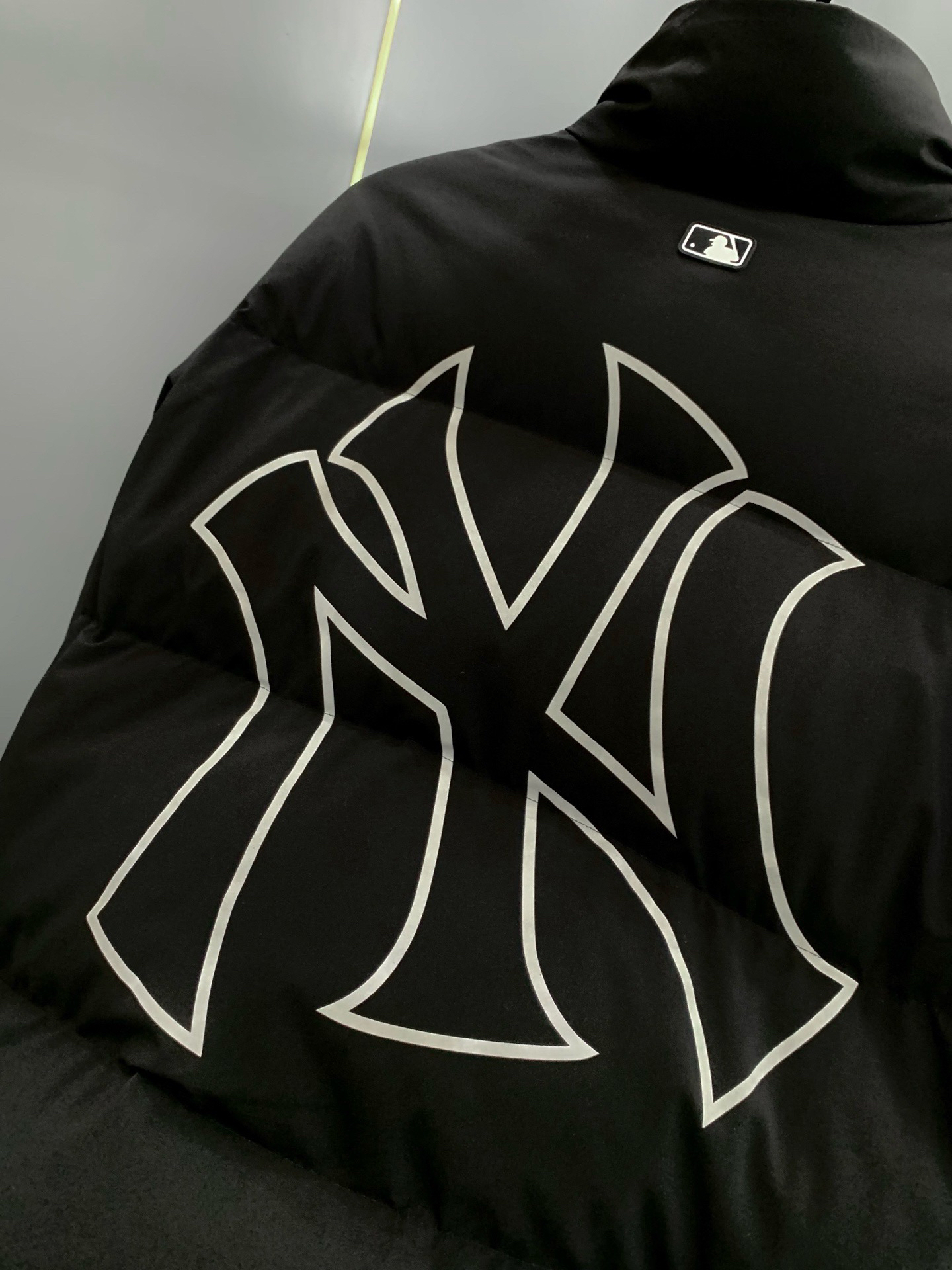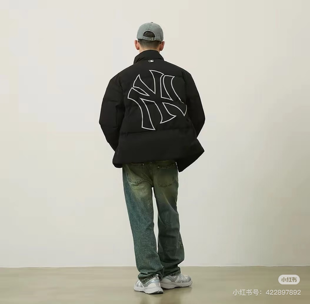 酷飒的立领短款版型颇有些运动风哈,背部大联盟大logo徽标精致撞色描边印花更是看起来韩系风十足