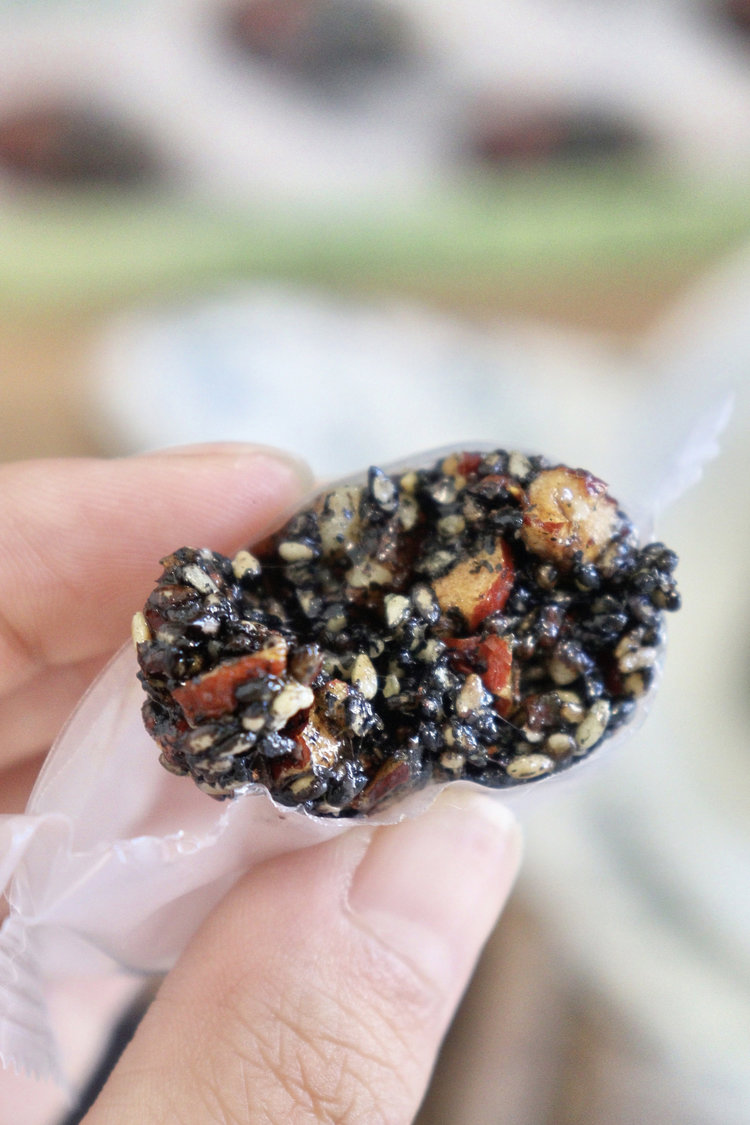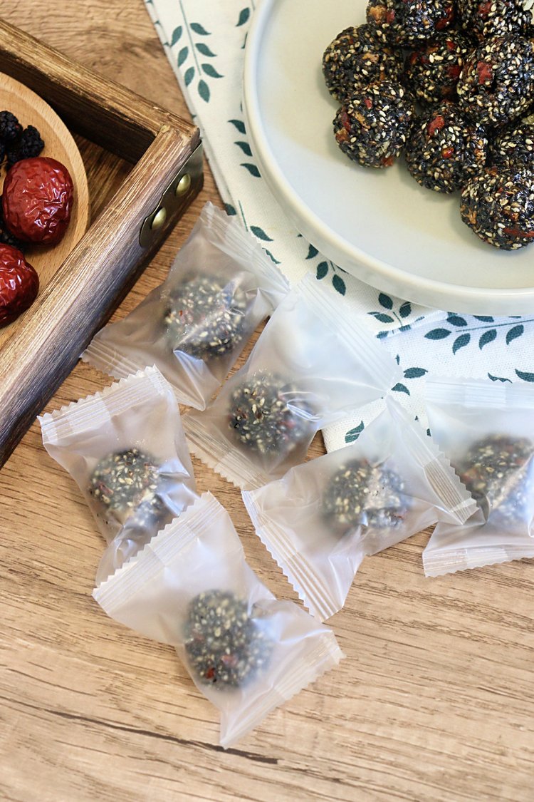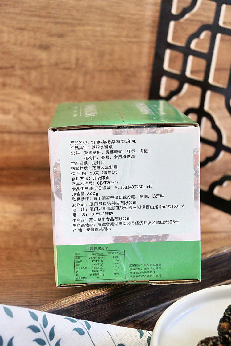 配 料:熟黑芝麻、麦芽糖浆、红枣、枸杞、核桃仁、桑葚、食用植物油
