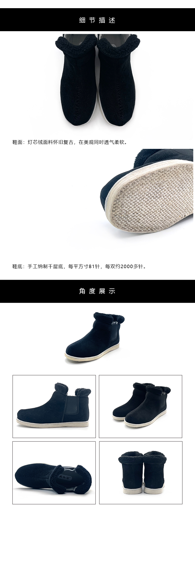 内联升男鞋手工千层底棉鞋冬季羊毛里手工十字纳底牛反绒棉鞋DN8309