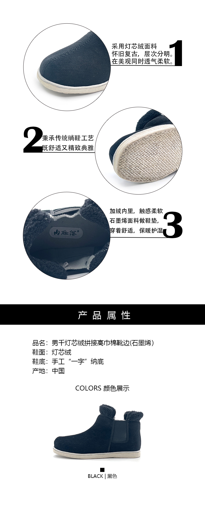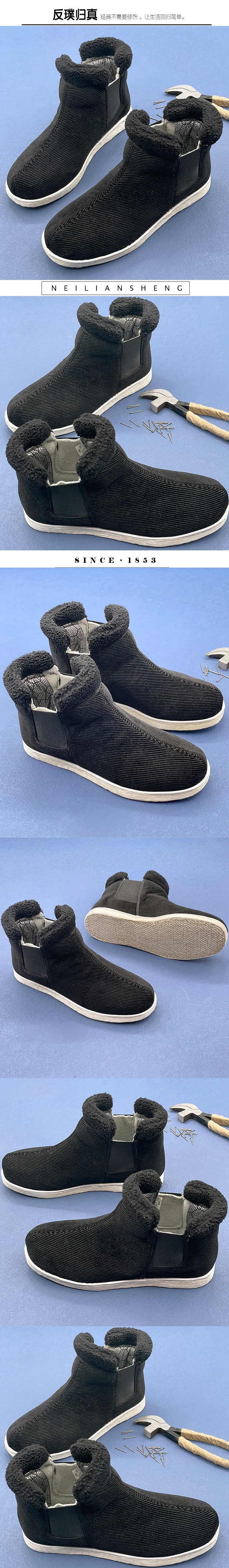 内联升手工高腰男棉鞋千层底灯芯绒拼接棉靴8543A