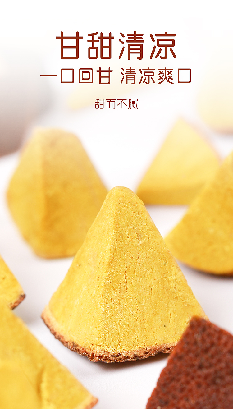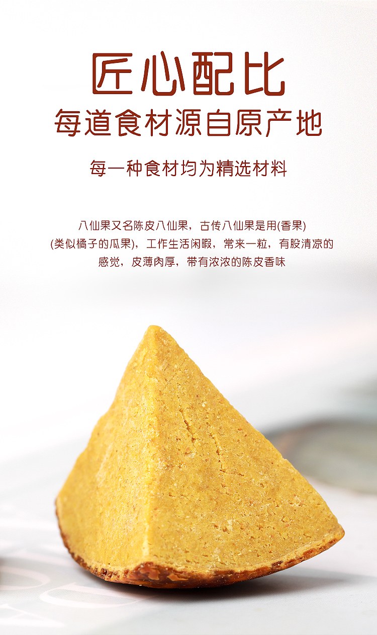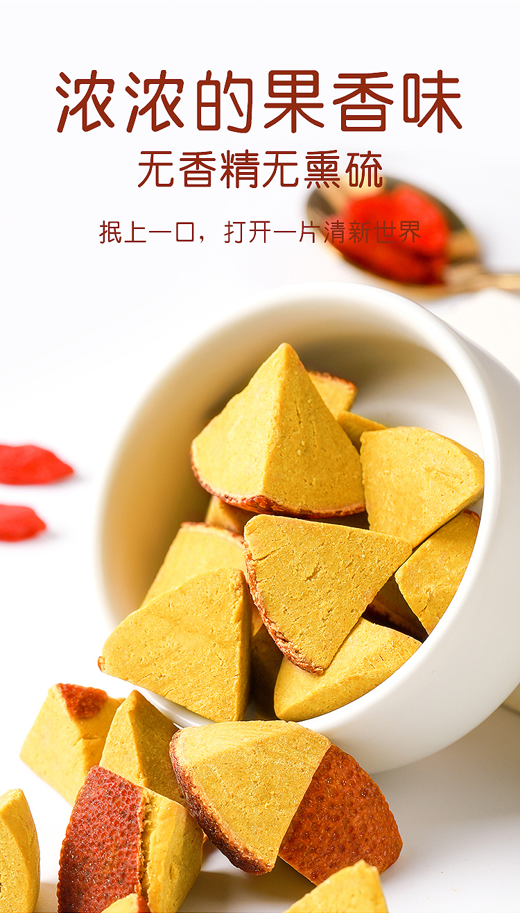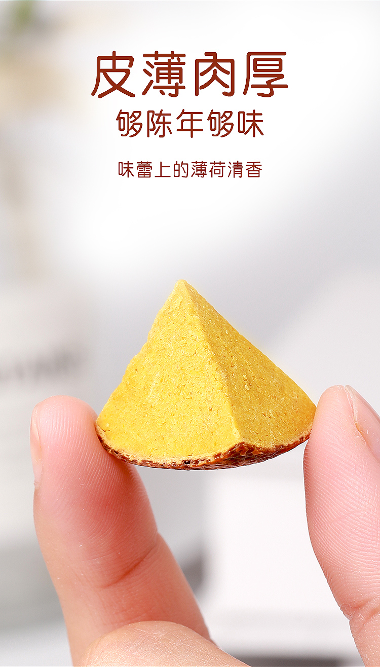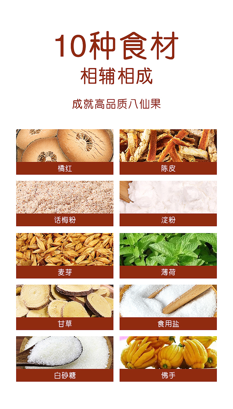 配料:橘红、陈皮、话梅粉、淀粉、麦芽、薄荷、甘草、食用盐、白砂糖、佛手、柠檬酸、甜蜜素