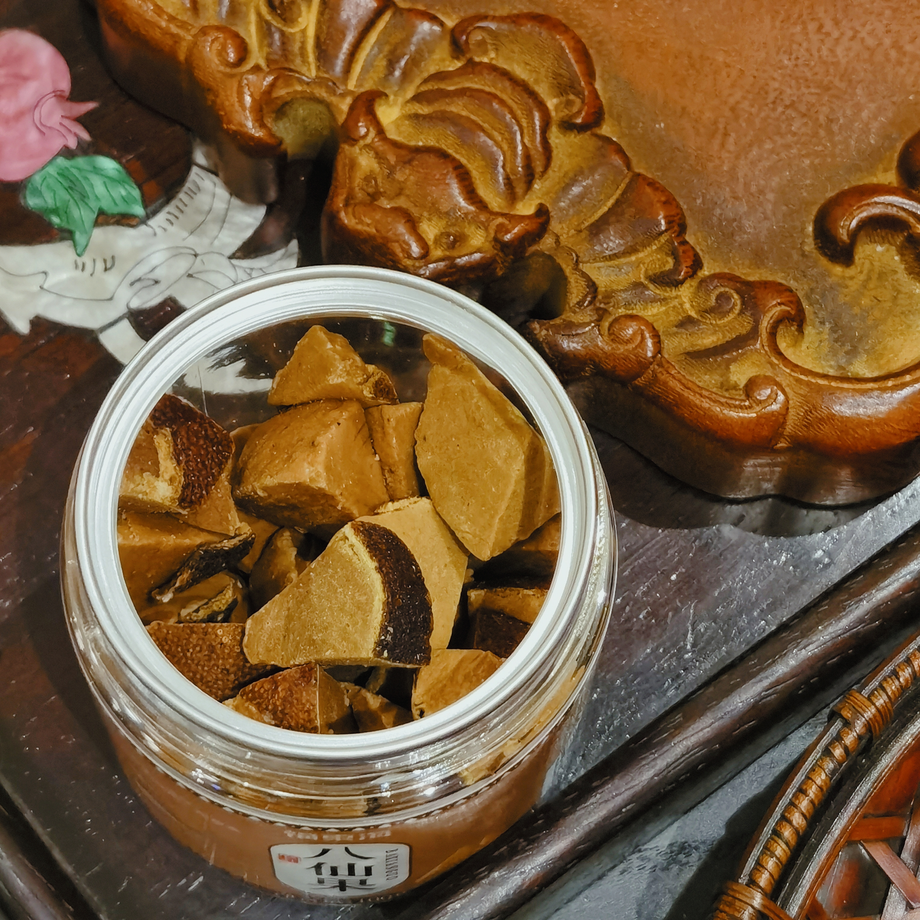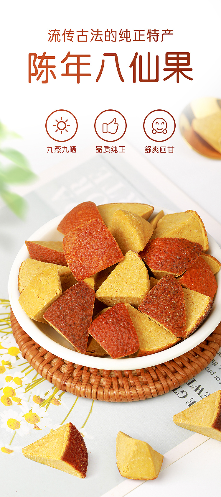 说到橘红,也许大家都不太了解,它是在柚子成熟时采摘,剥去果皮,去掉橘皮内的白色部分,晒干后,就叫做橘红。橘红的主要作用是化痰止咳,风寒咳嗽就可以喝它。福东海的橘红八仙果,核心成分是有中国“止咳喉宝”美誉的化州陈年橘红,搭配有理气、健胃、燥湿、祛痰的功效的新会陈皮以及甘草、佛手、梅粉、麦芽、薄荷等润喉化痰食材,采用古法工艺制成。整个过程需先将草本配方熬汁淀粉成型,再九蒸九制九烘,层层历练每道工序,造就陈年够味的八仙果。