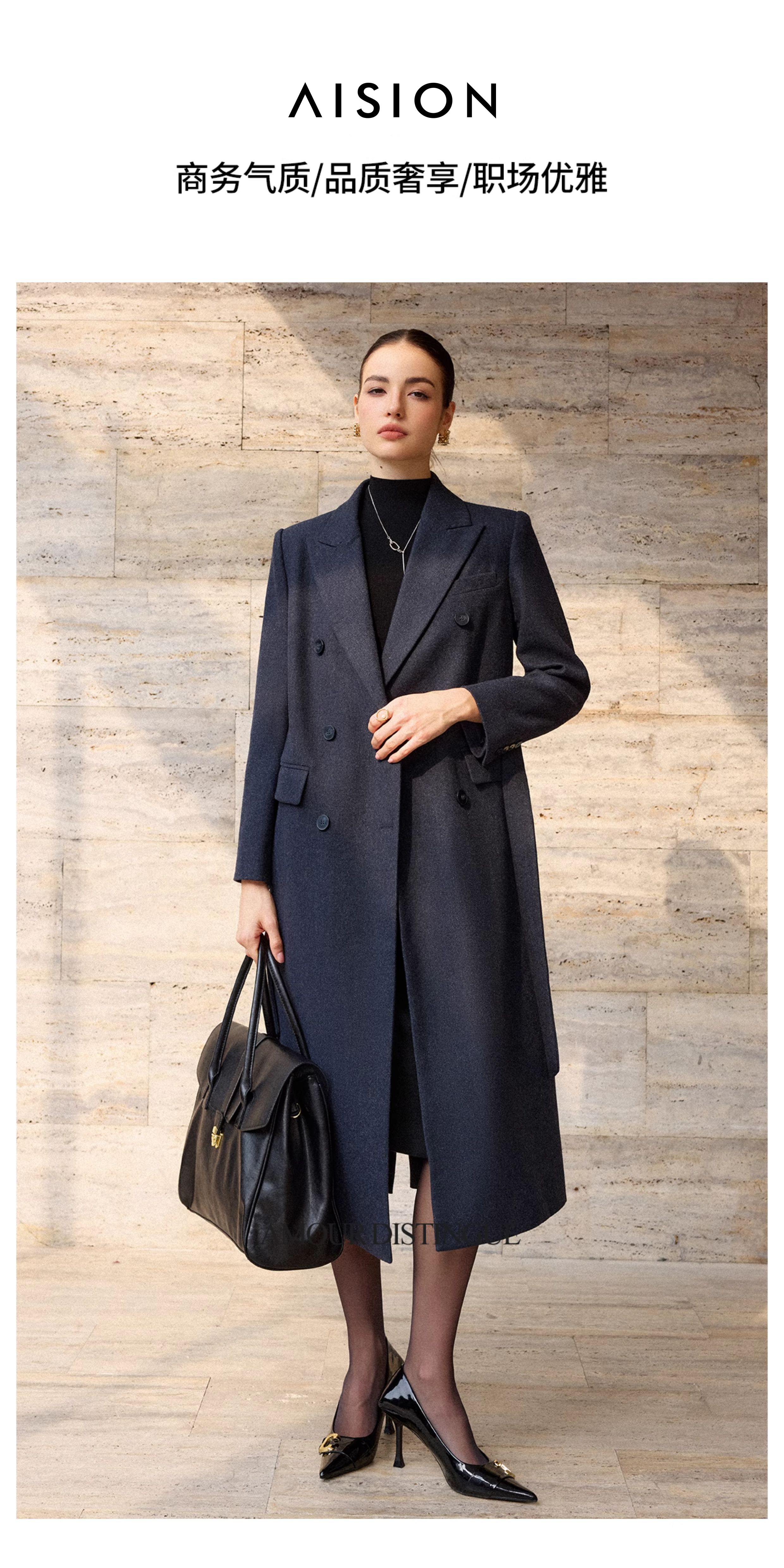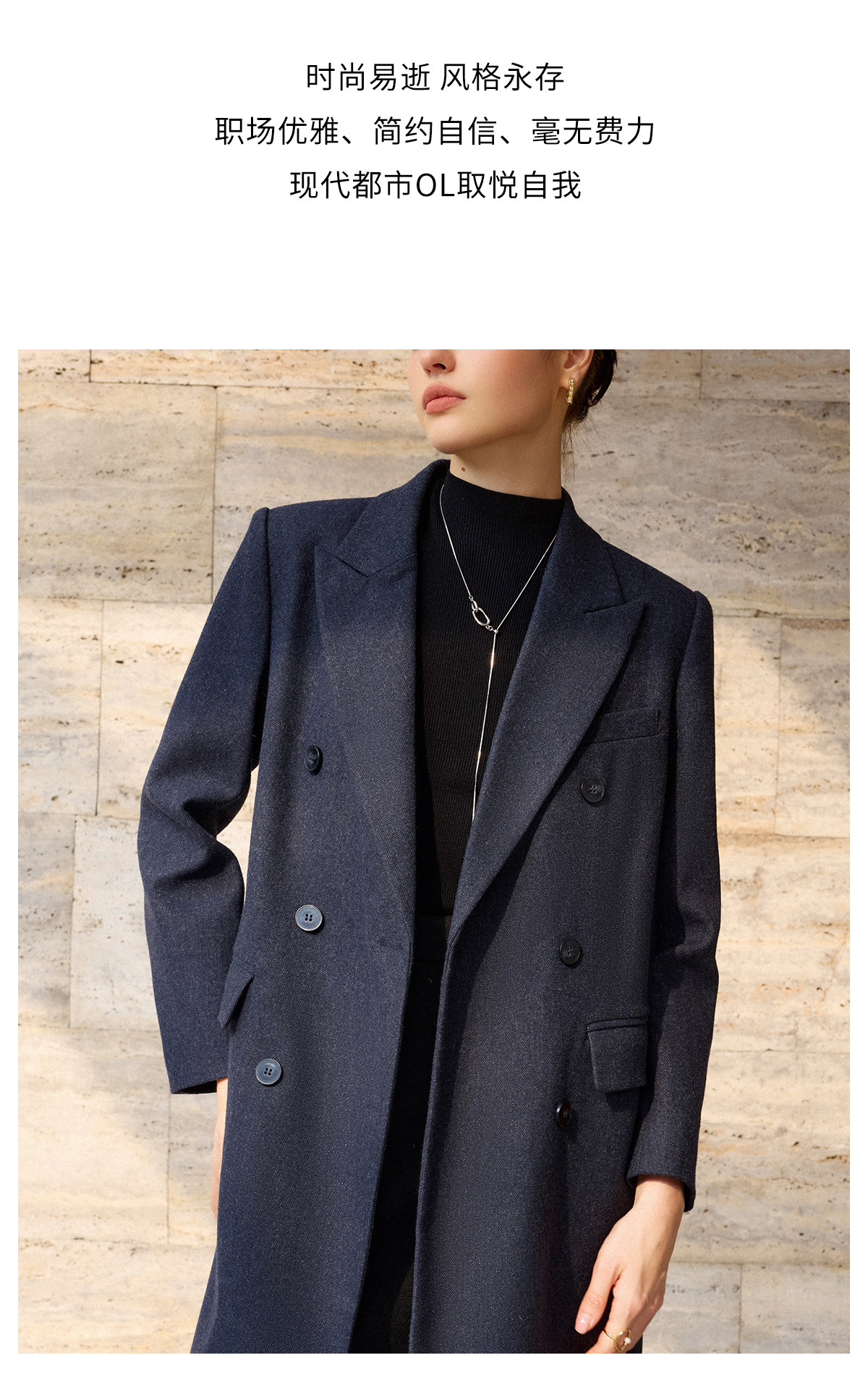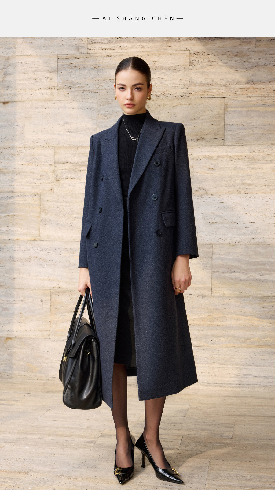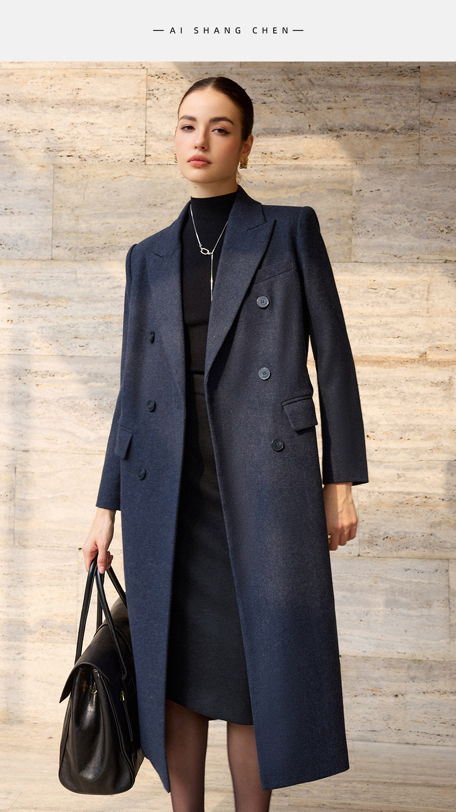 艾尚臣羊毛大衣女冬藏青色毛呢外套中长款通勤职场西装双排扣长款