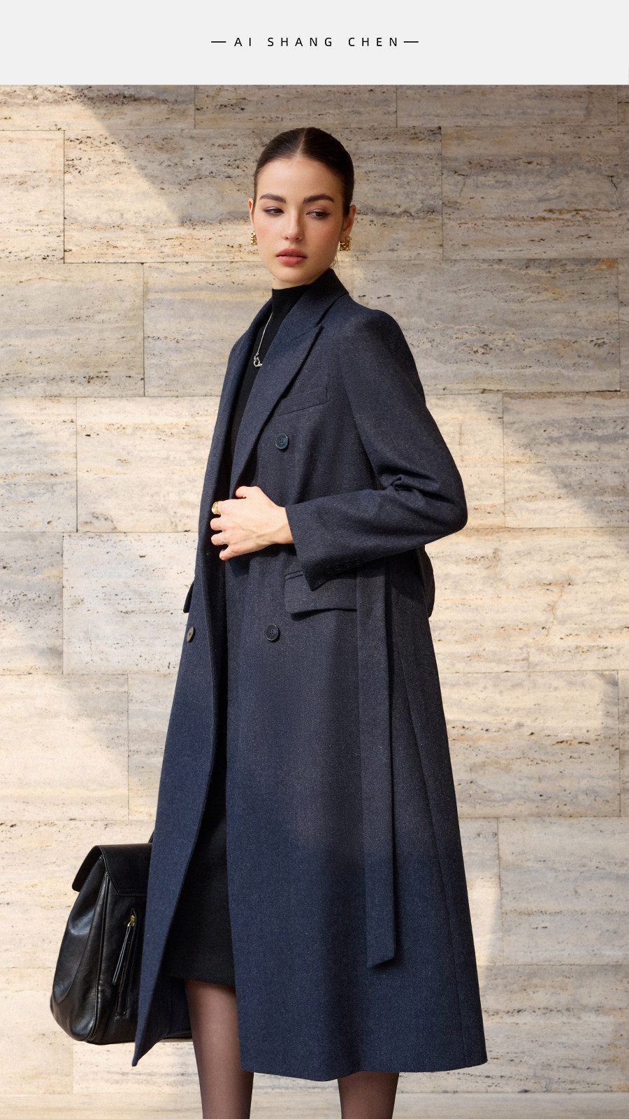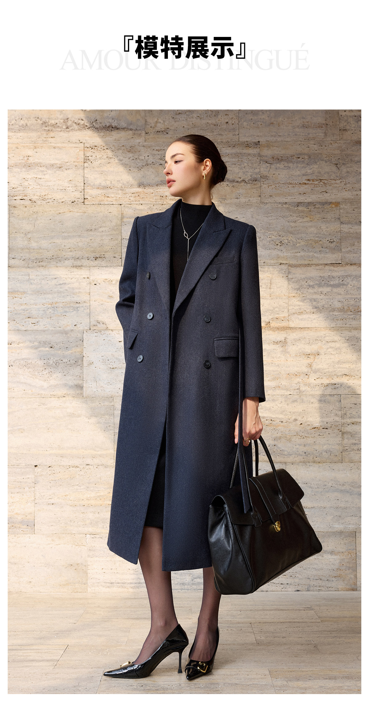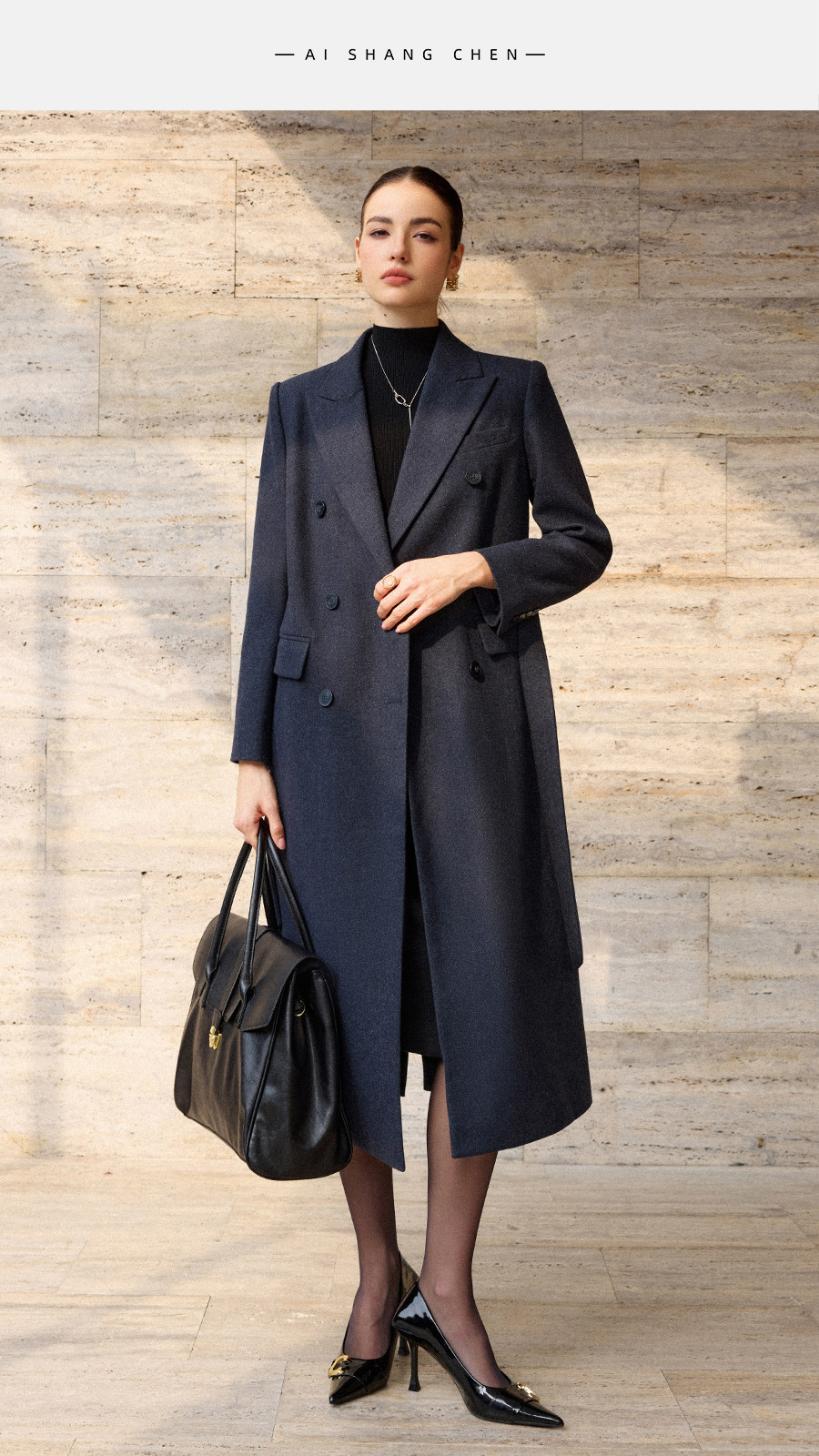艾尚臣羊毛大衣女冬藏青色毛呢外套中长款通勤职场西装双排扣长款