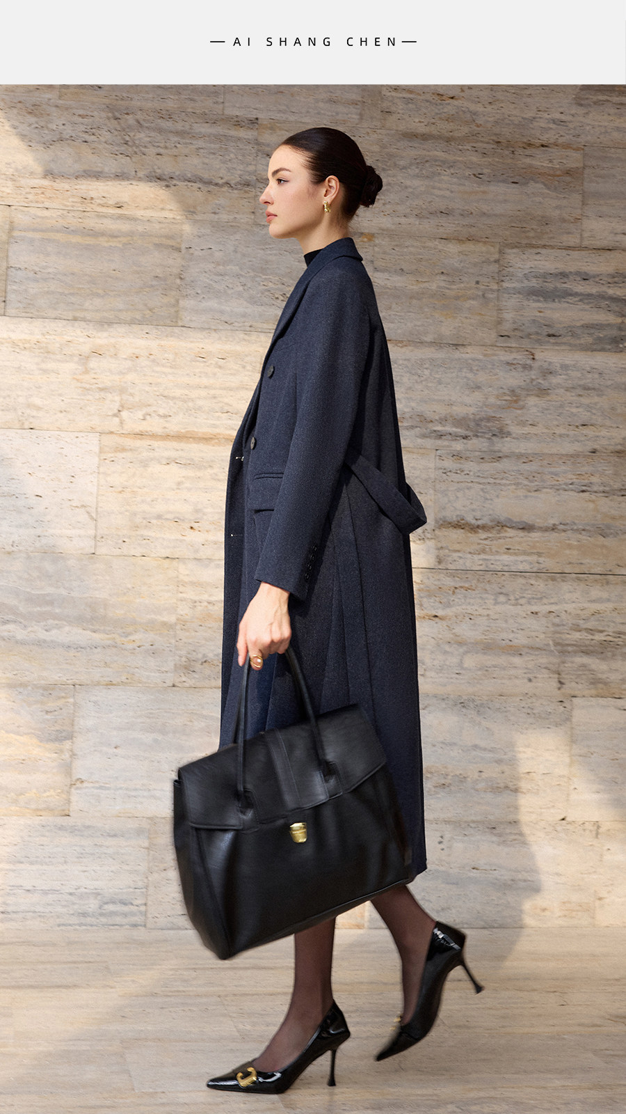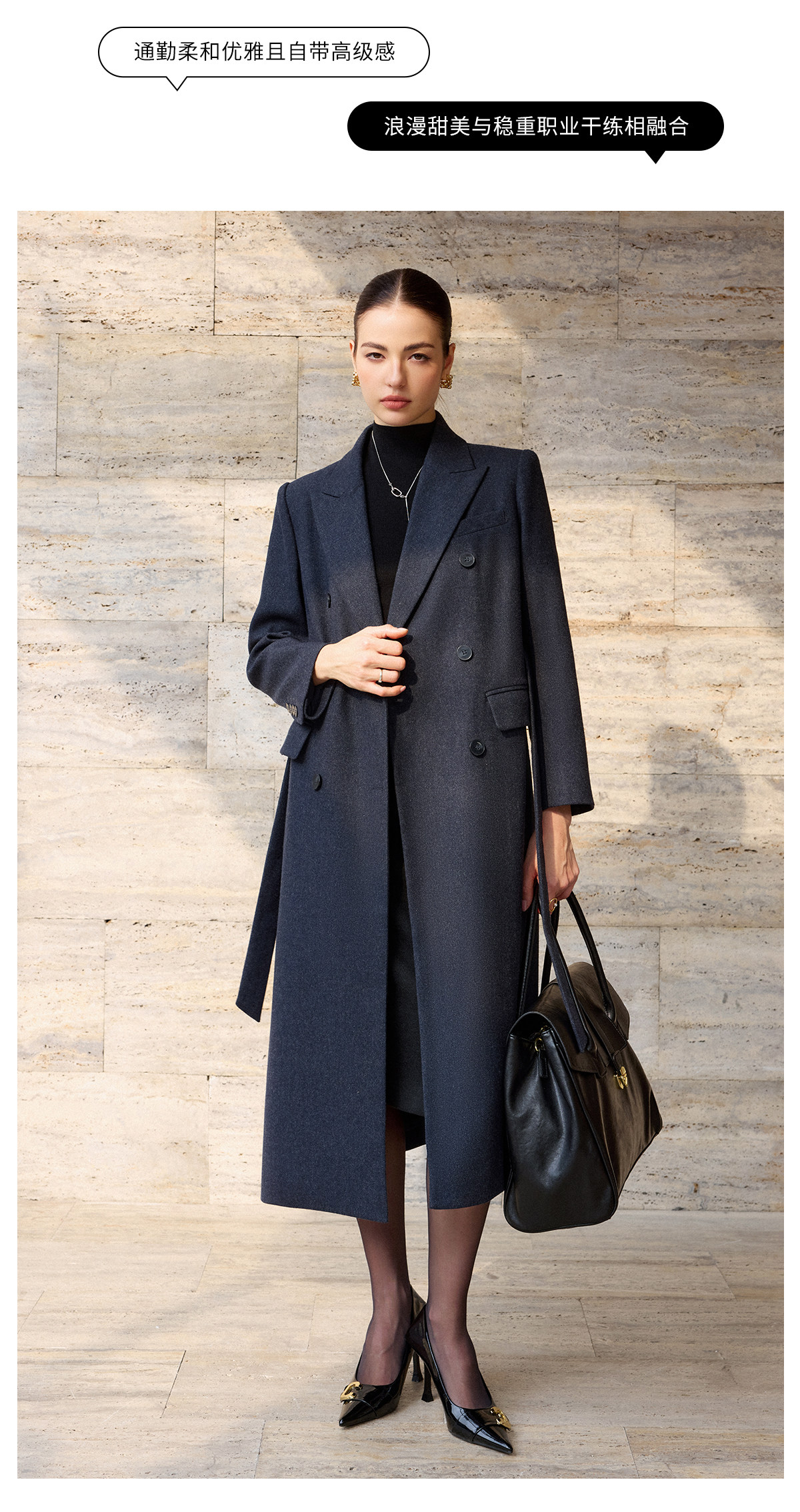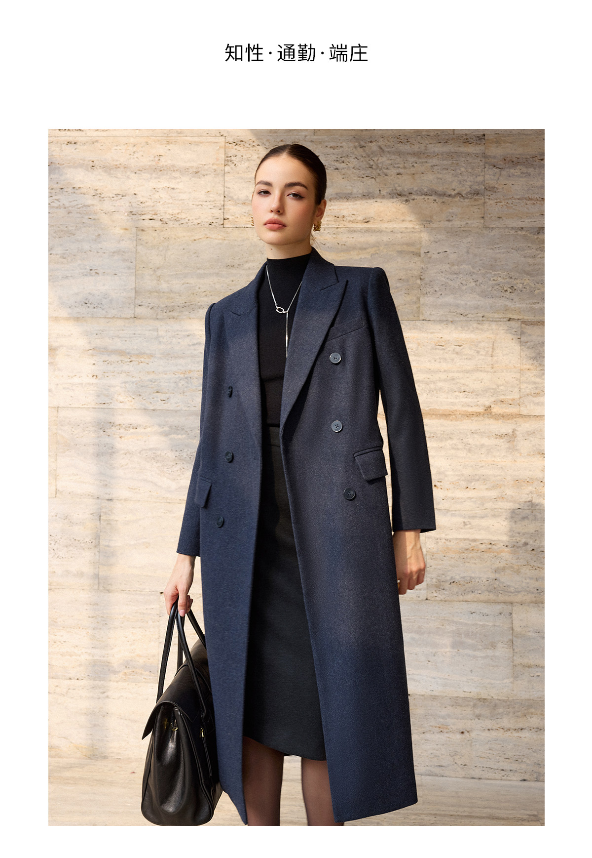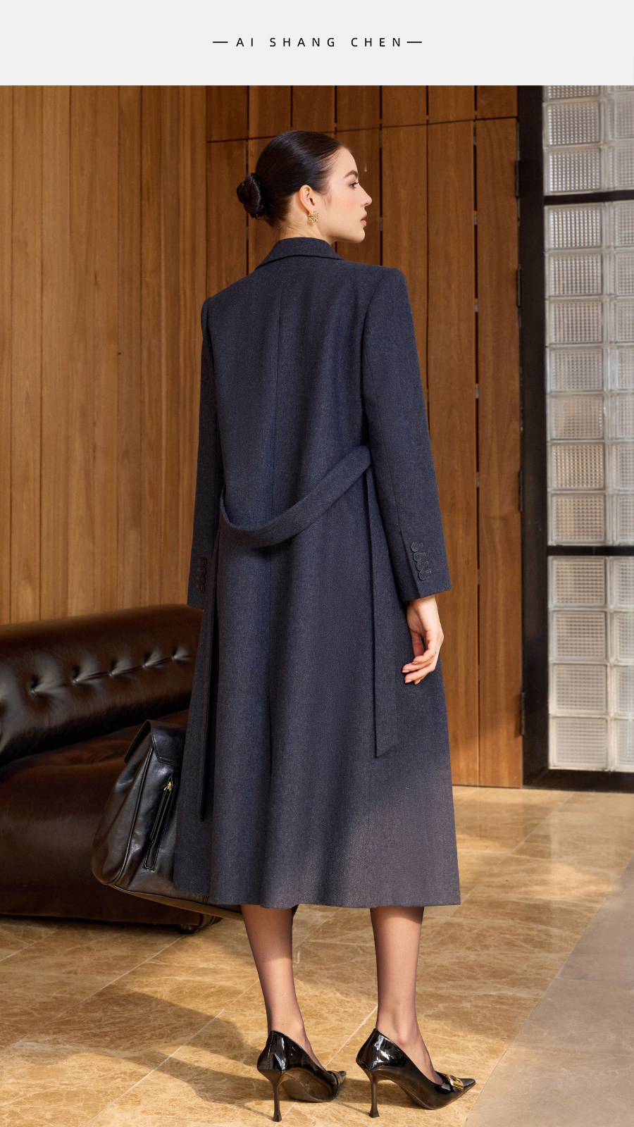 艾尚臣羊毛大衣女冬藏青色毛呢外套中长款通勤职场西装双排扣长款