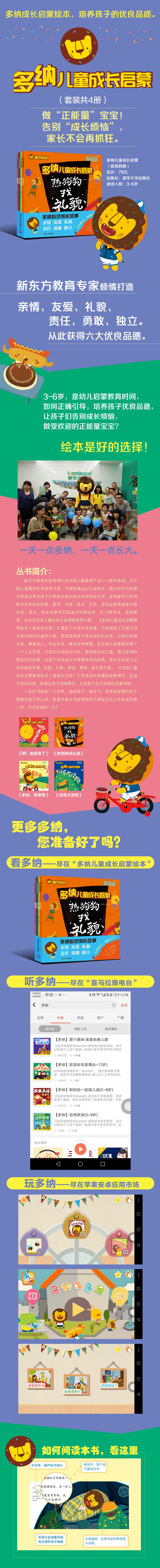 《多纳儿童成长启蒙》通过多纳和朋友们的故事,向孩子讲述成长中需要培养的特质,其中涉及孩子必须具备的亲情、友爱、礼貌、责任、勇敢、独立等方面。