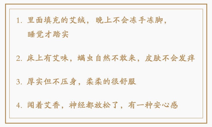 现在细细想来,老祖宗传下来的东西,还真有它的智慧在。就像这艾绒被,舒服、还能养身,简单又实用。把自己身体养好了,这比什么都强。