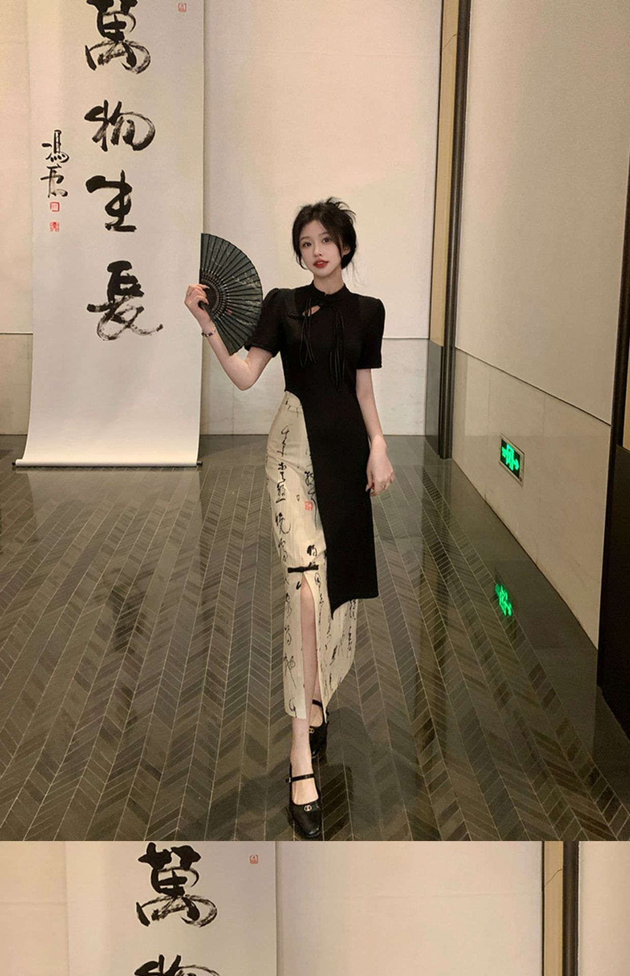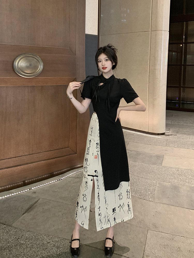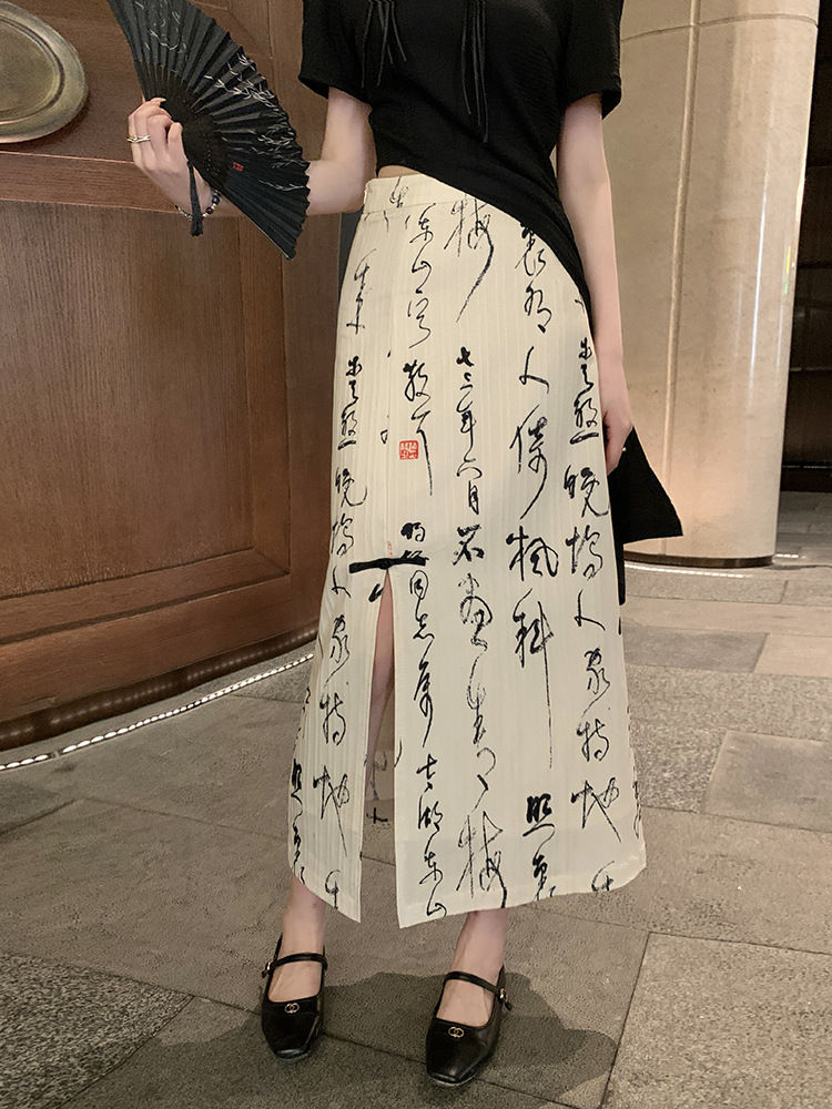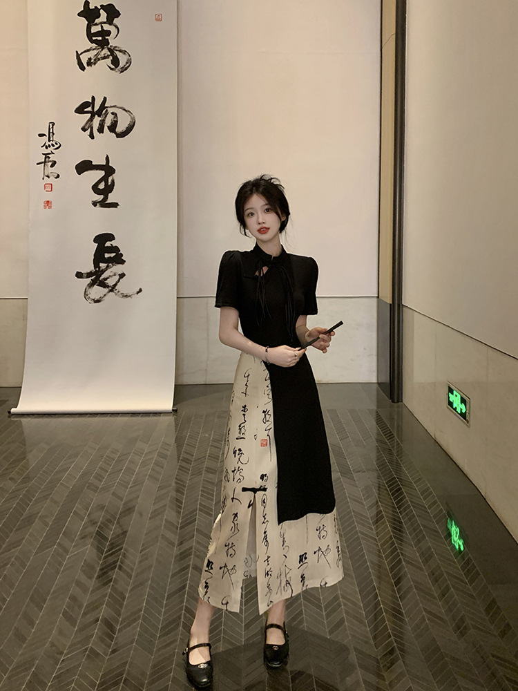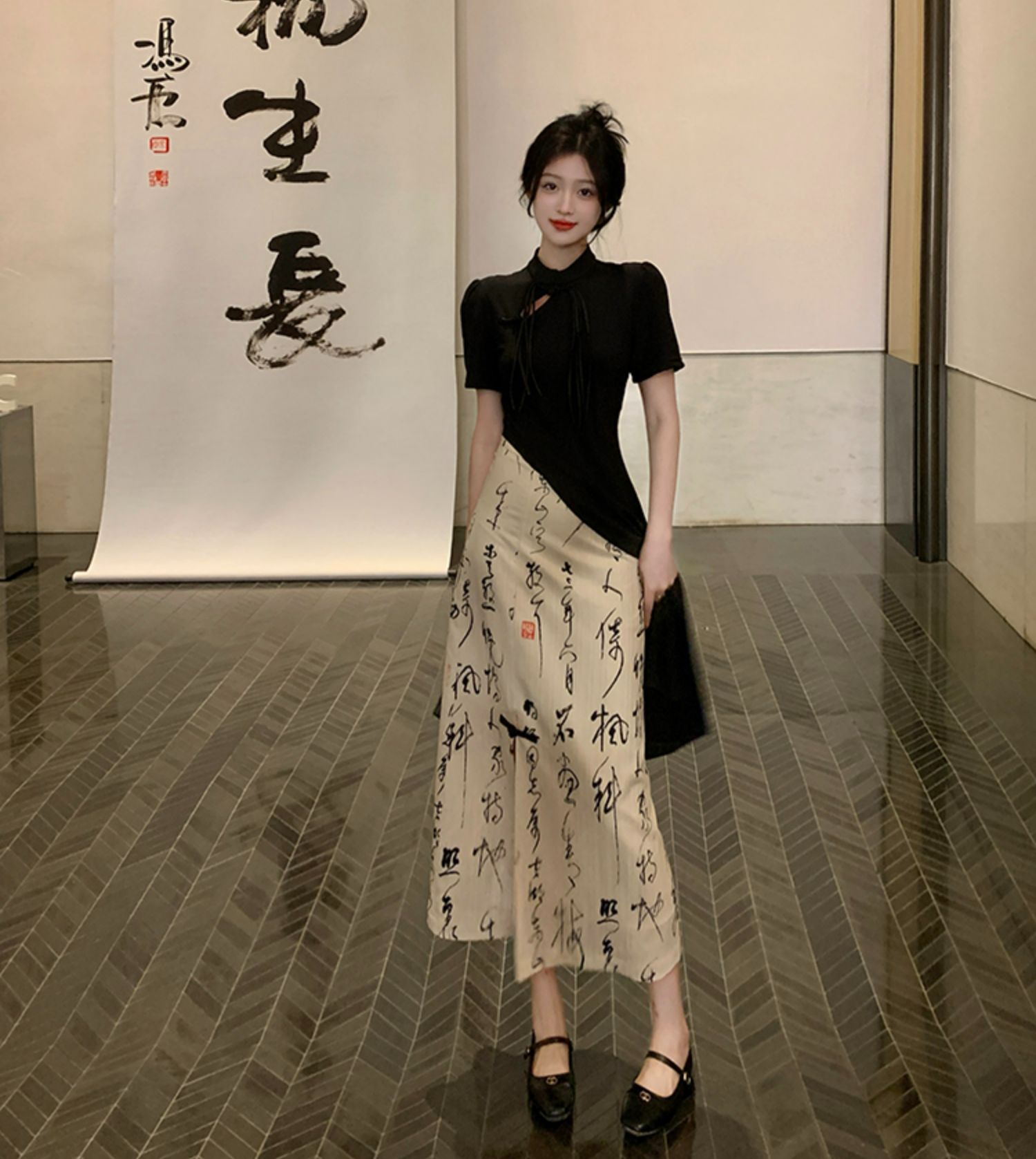 新中式国风复古高级感不规则书法半身裙时尚旗袍两件套装裙女夏季_HLY