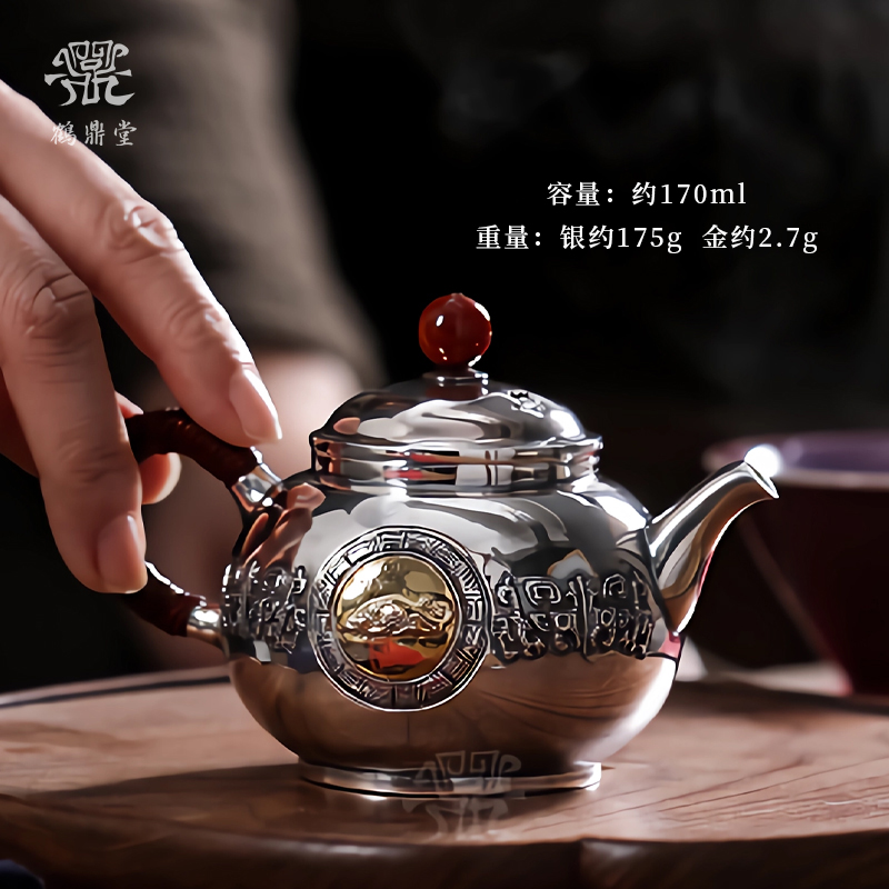 鹤鼎堂银壶闻天系列镶金犀牛錾刻饕餮纹急须(银色)(缺货)