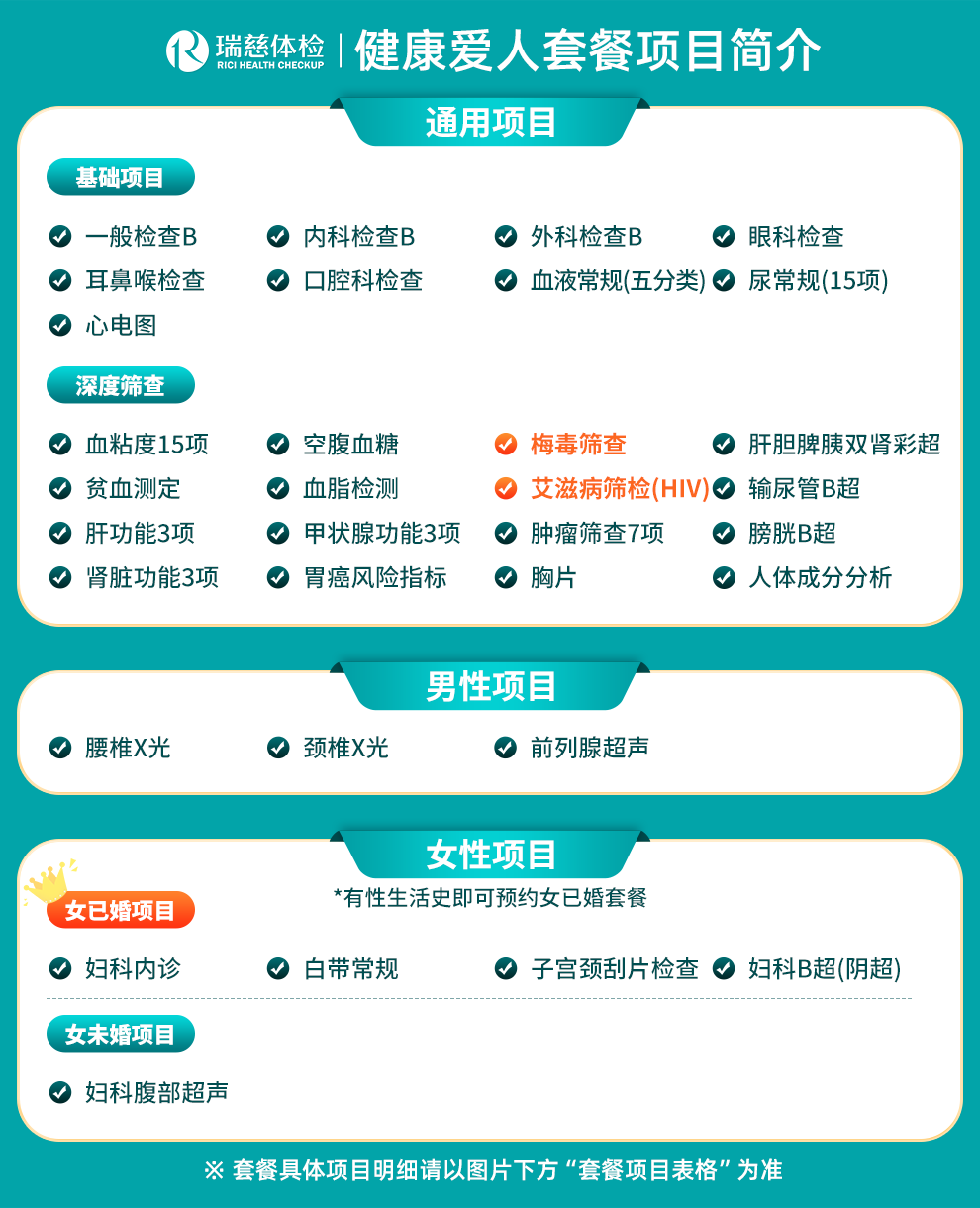 | 【口腔科检测】常州、成都、上海松江不做该项目;【性病筛查项目】湖州/南京/成都/徐州/北京/浙江/烟台做梅毒甲苯胺红不加热血清试验(Trust);【艾滋病筛检(HIV)项目】南京不做 | |||||