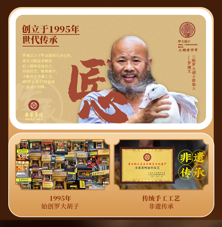 - 熏鸭之于三明,犹如烤鸭之于京城、烧鹅之于广州。“罗大胡子”熏鸭始创于1995年,是三明熏鸭创始品牌。