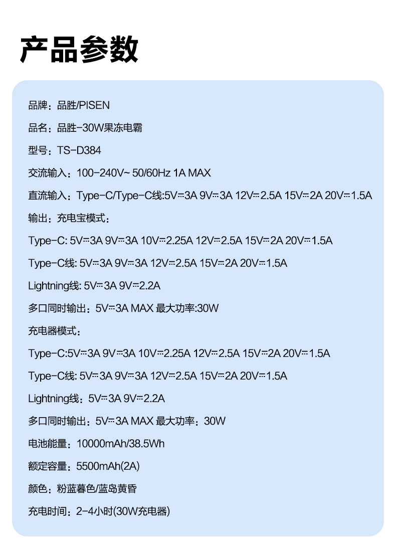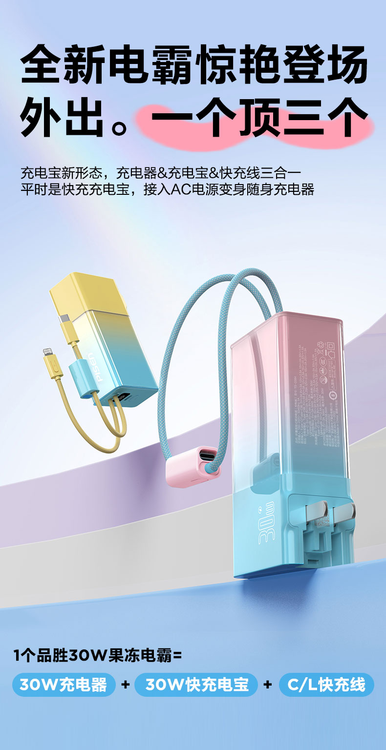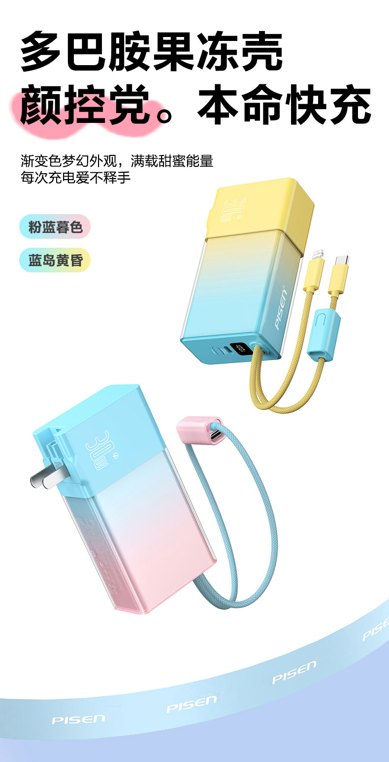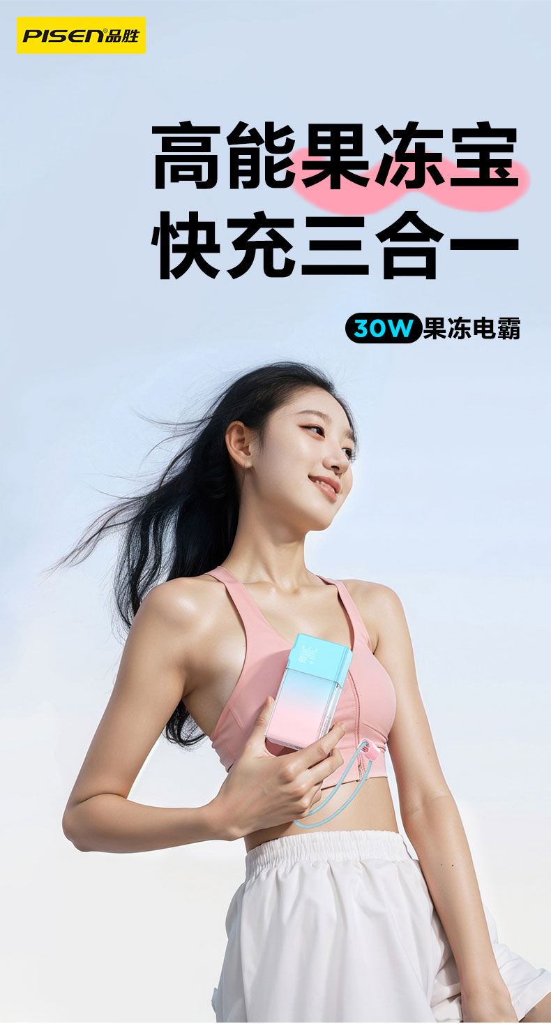品胜 30W果冻电霸10000毫安移动电源 PD30W快充自带Type-C/Lightning输出口 支持苹果小米华为 充电宝