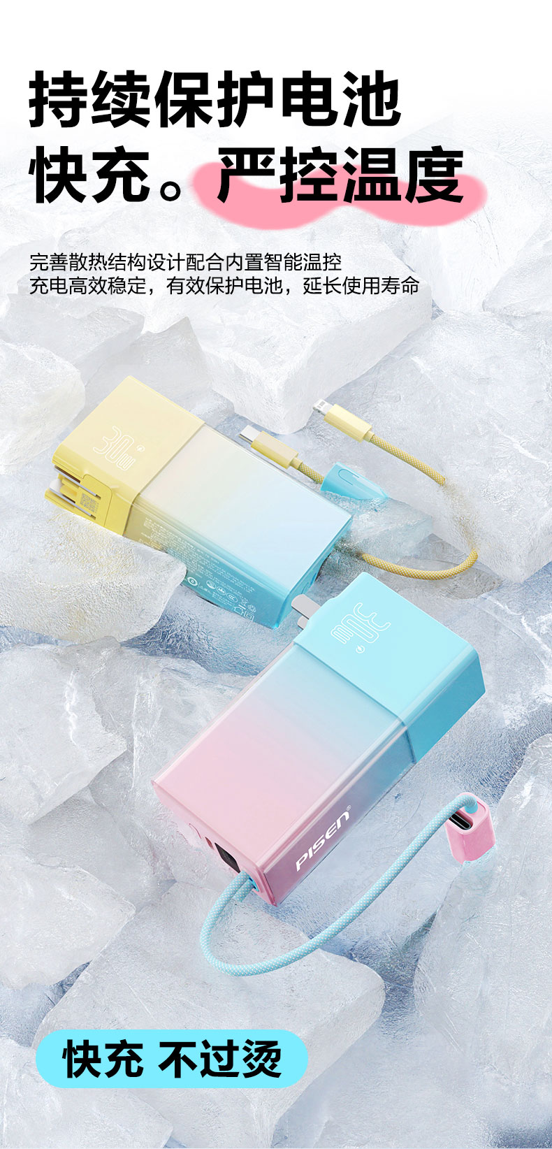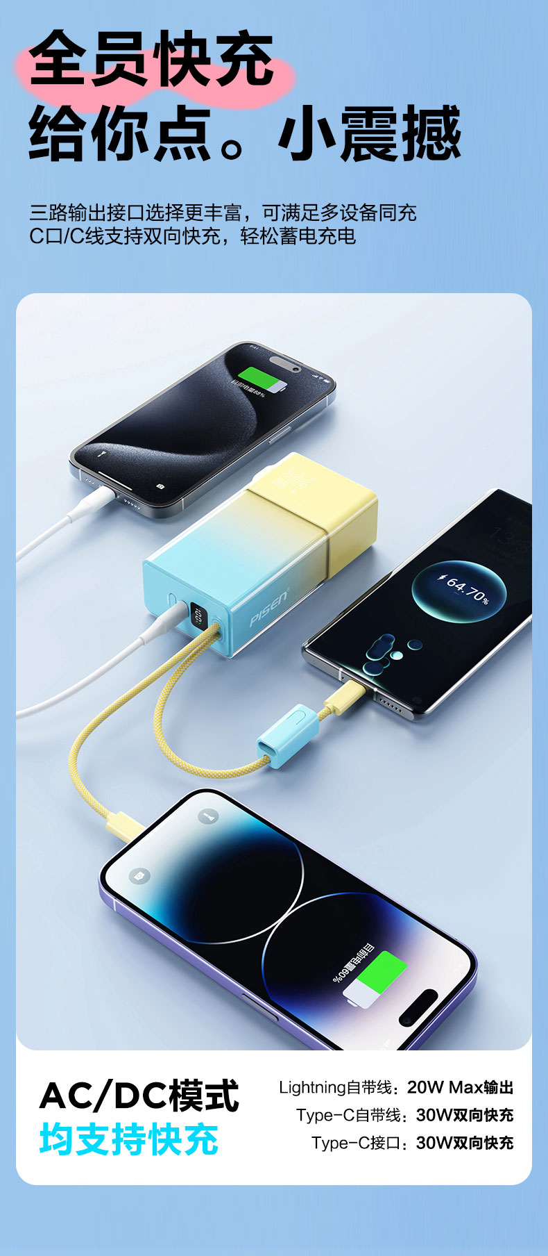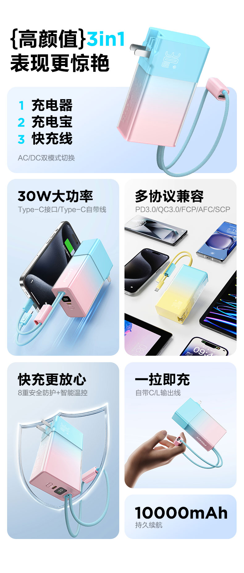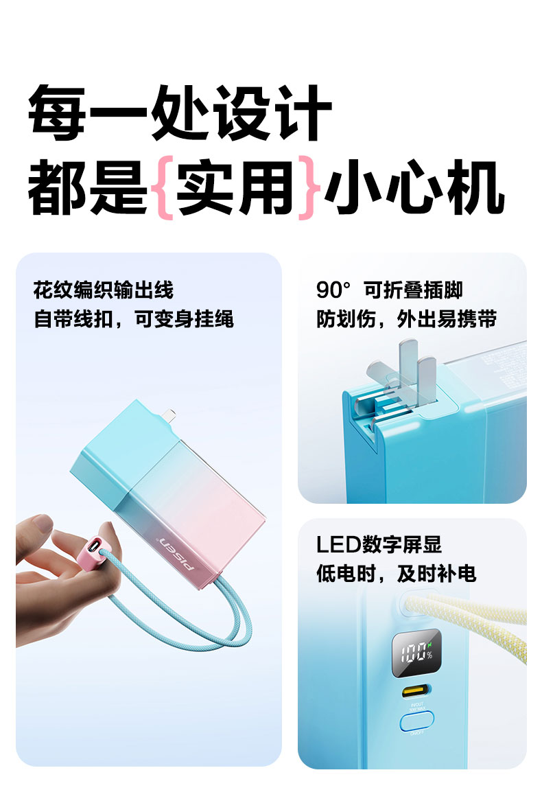品胜 30W果冻电霸10000毫安移动电源 PD30W快充自带Type-C/Lightning输出口 支持苹果小米华为 充电宝