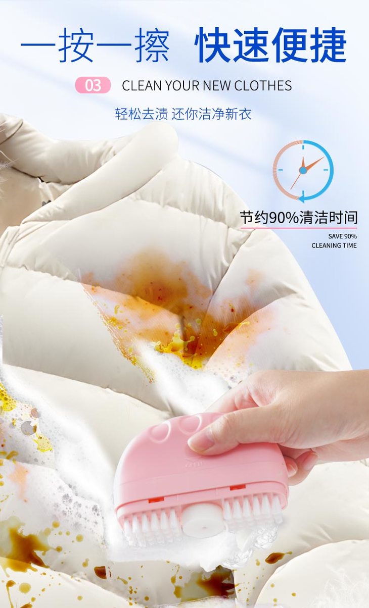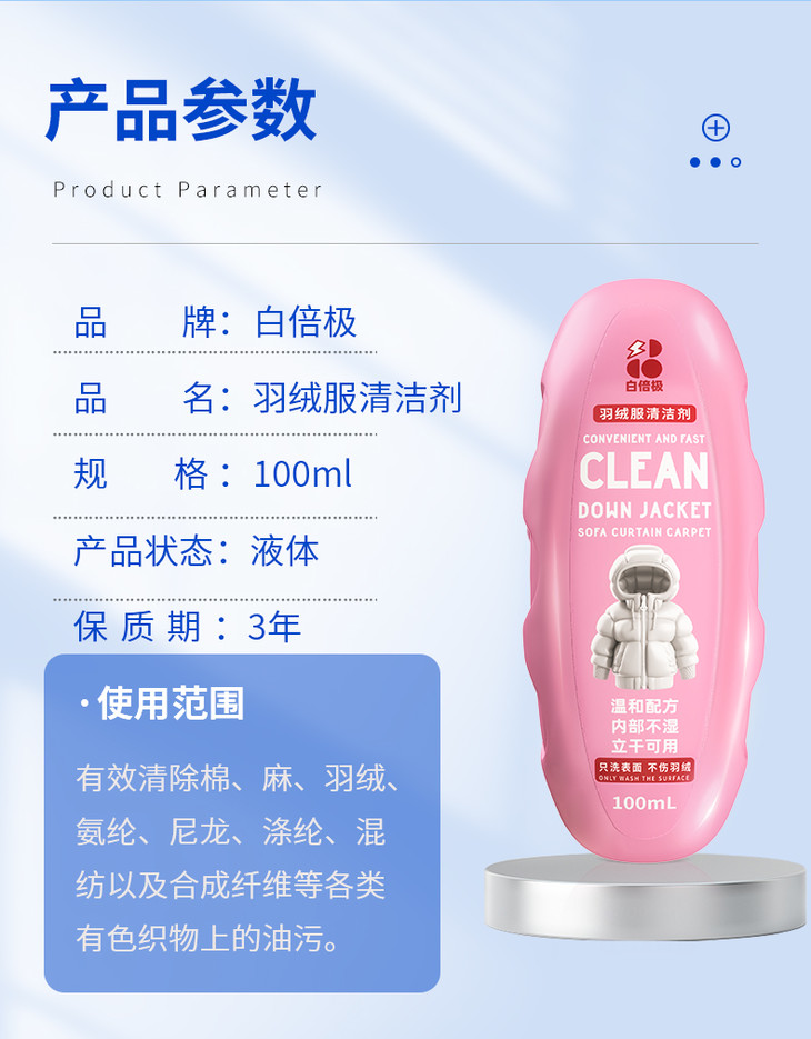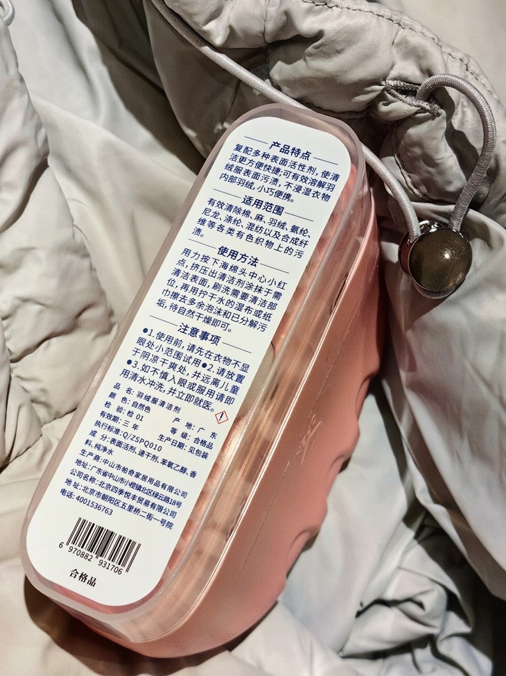 以前也是用过很多羽绒服清洁剂了,使用起来非常繁琐,需要先稀释、再浸湿羽绒服、最后擦拭。而白倍极则完全不同,它是自带清洁剂、气泡海绵和浓密软毛刷的,实现“一体式清洁”!使用时,只要按下海绵头中心的小红点,清洁剂就会均匀挤出,搭配软毛刷摩擦起沫,轻松去除污渍,不需要额外准备水哦,最后用拧干水的湿布或纸巾擦掉多余的泡沫和污渍,等待自然干燥就行。而且,白倍极羽绒服清洁剂采用的是天然植物萃取液,既不伤手也不会损坏衣物表面。在深入瓦解油渍、污渍的同时,给宝宝使用也更安全放心。此外,它还通过了相关检测,确保产品质量和安全性。