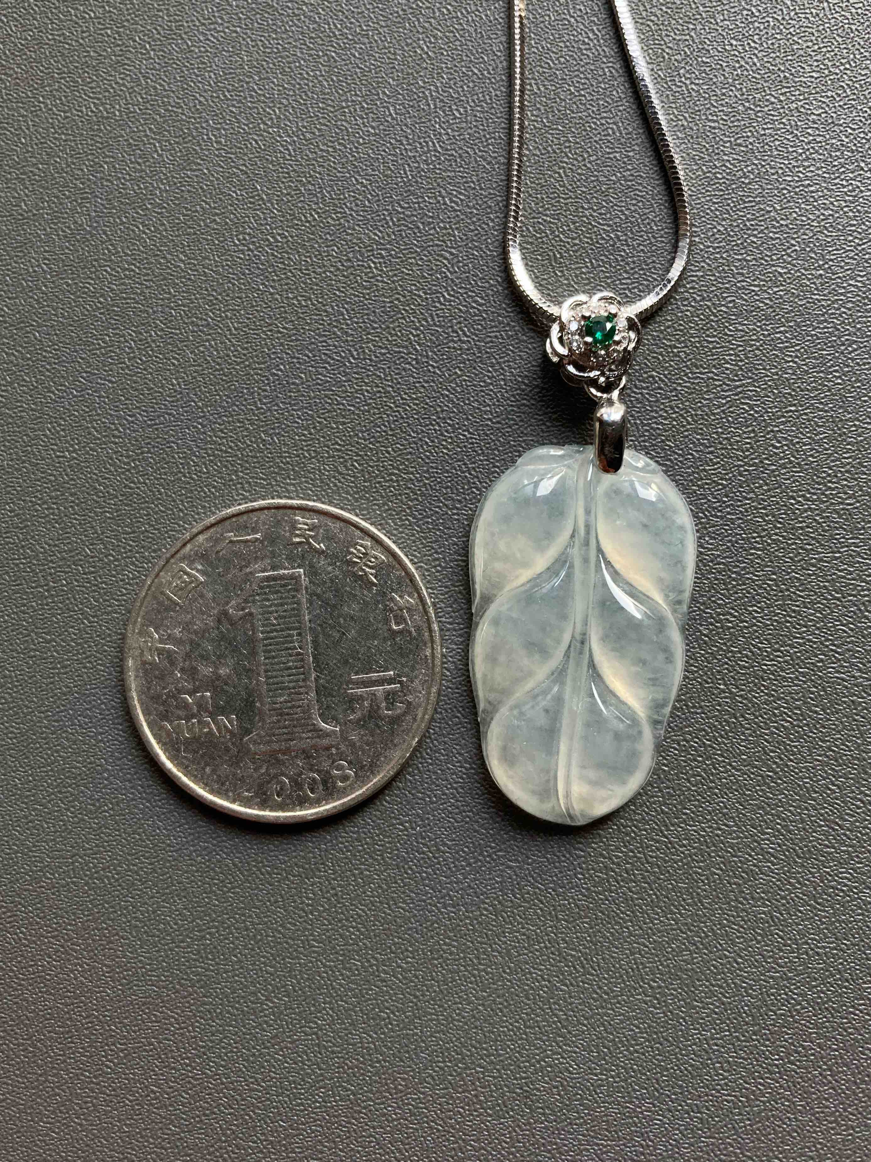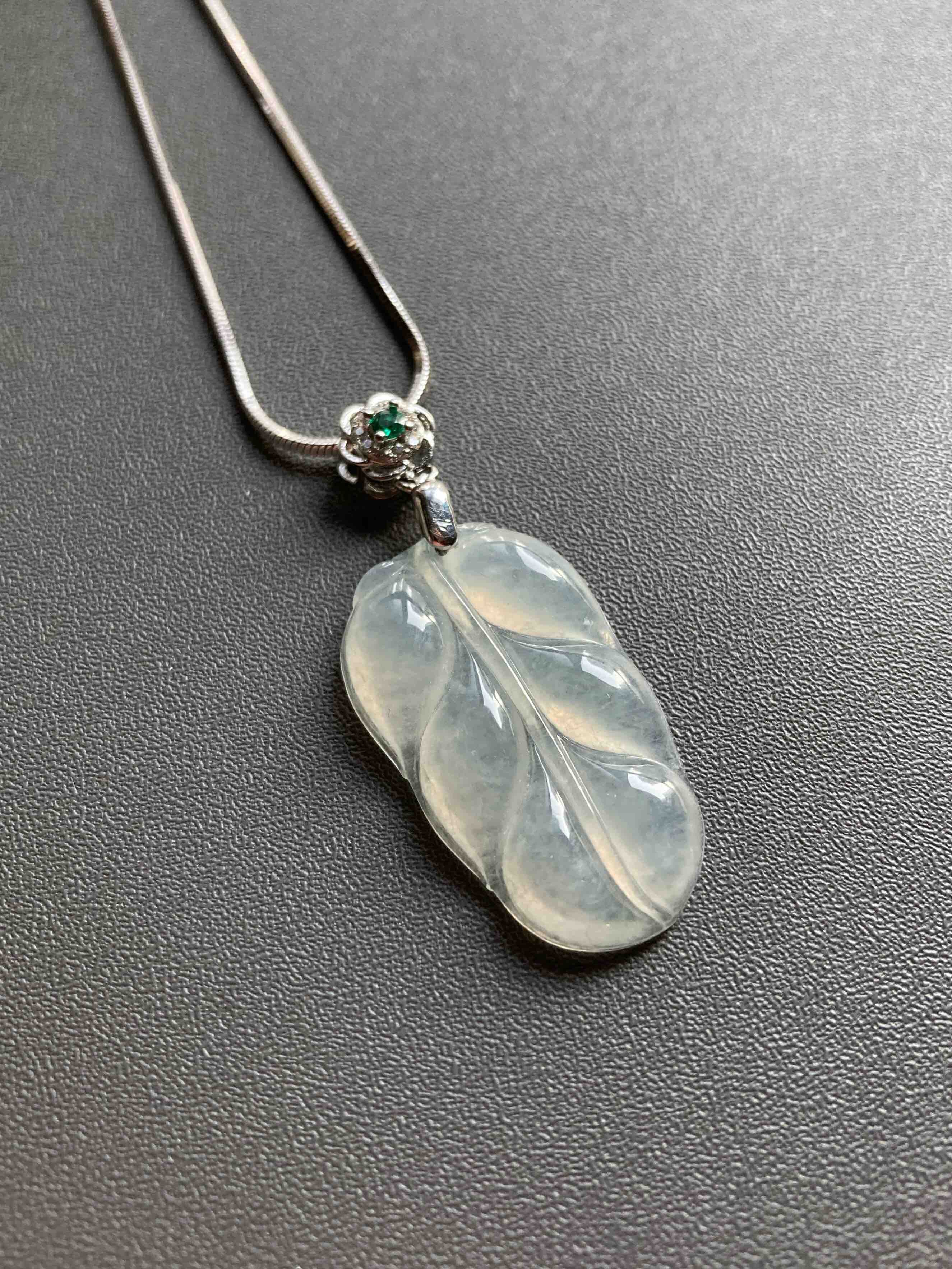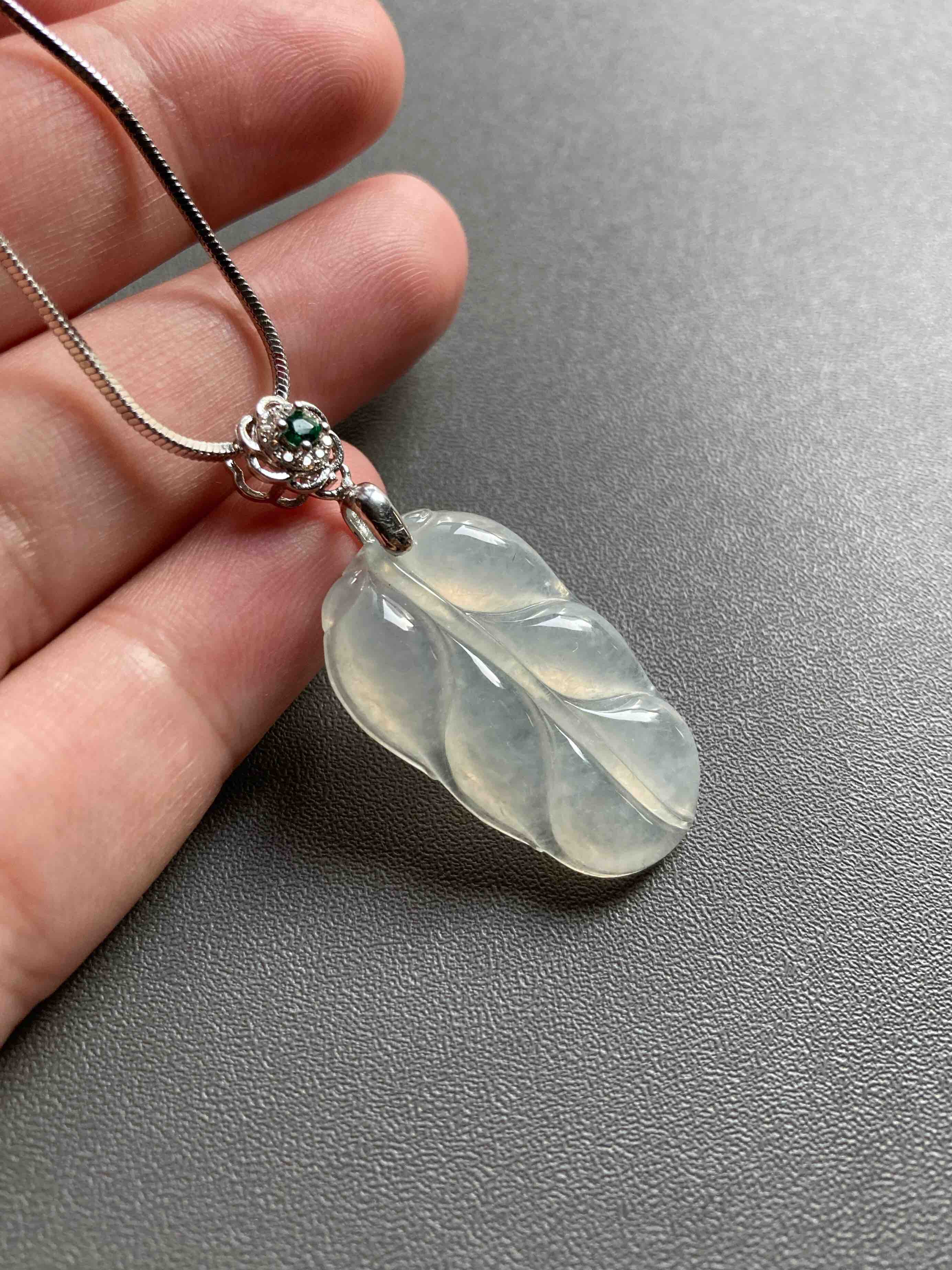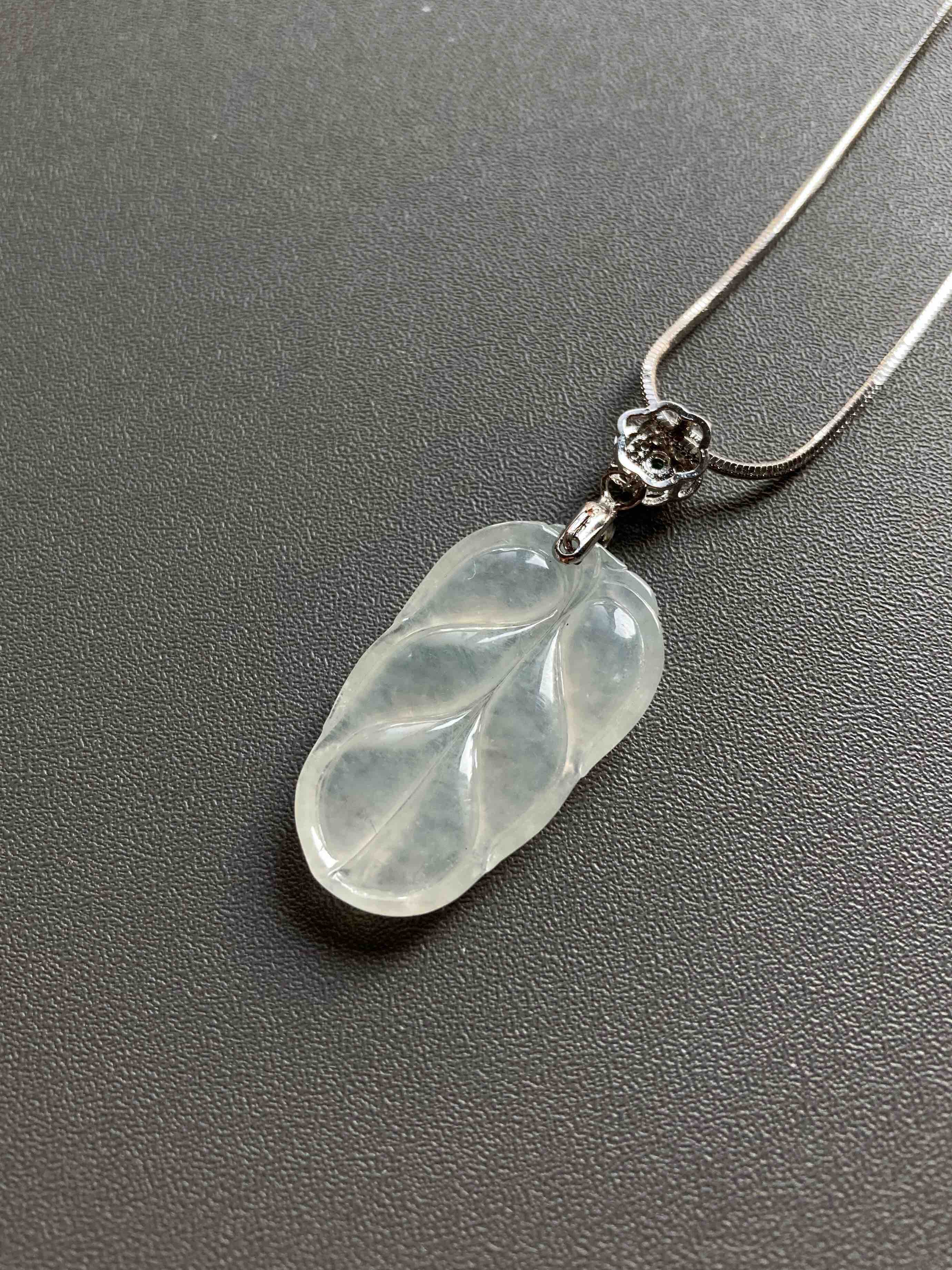 冰种翡翠叶子,28.9×17.3×4.3mm,种水晶莹剔透,冰清玉洁,叶子尺寸很棒,厚实饱满,肥美大方,佩戴叶子寓意事业有成,性价比绝了,再送价值100的银镀白金扣头和项链一套