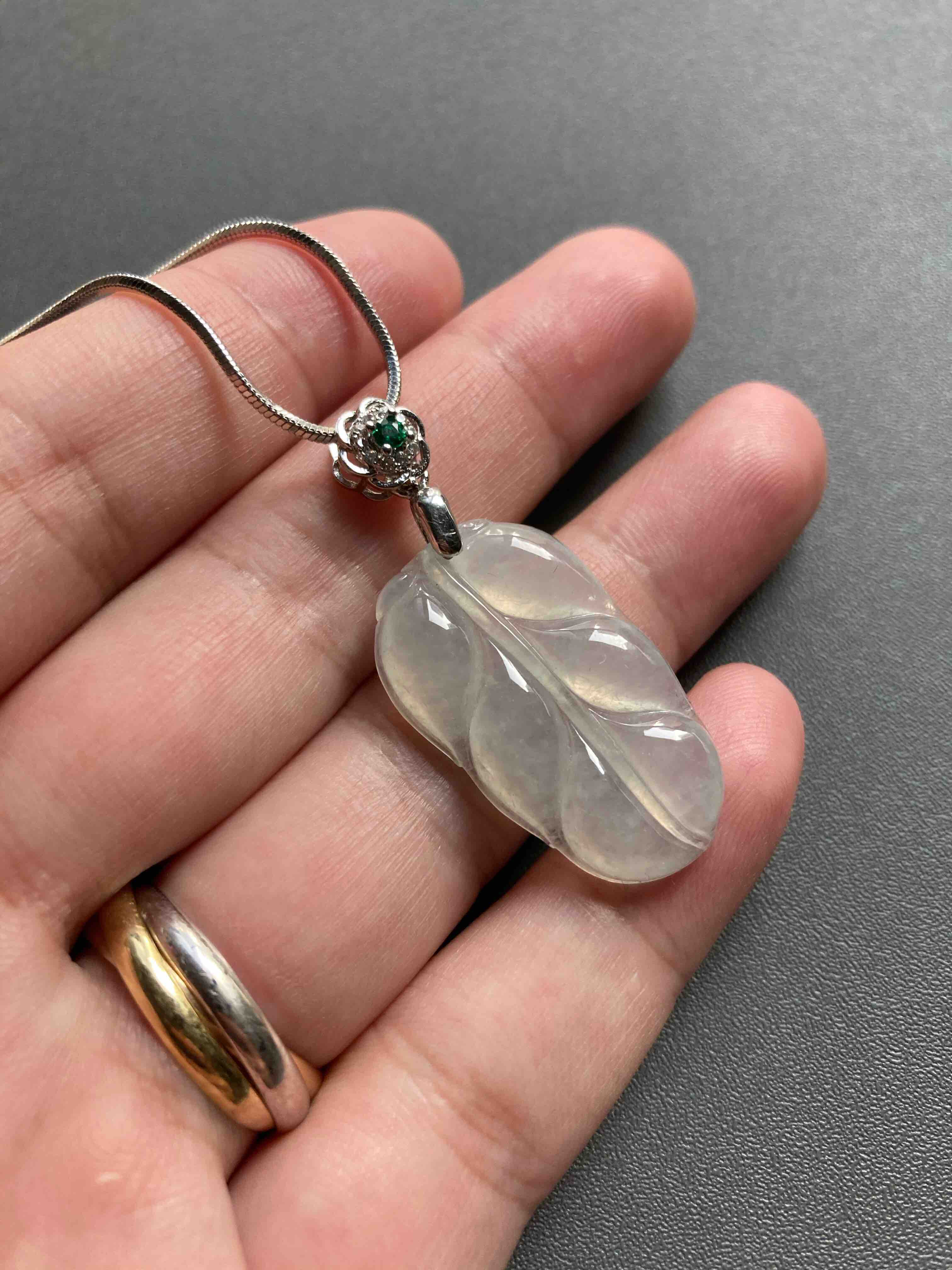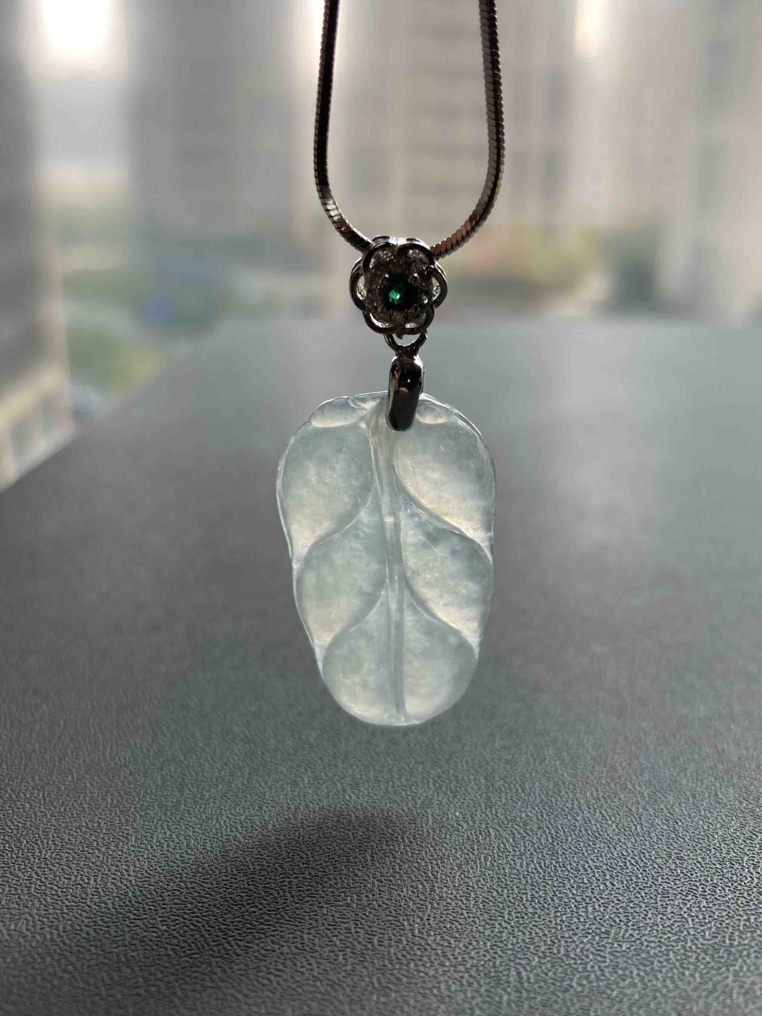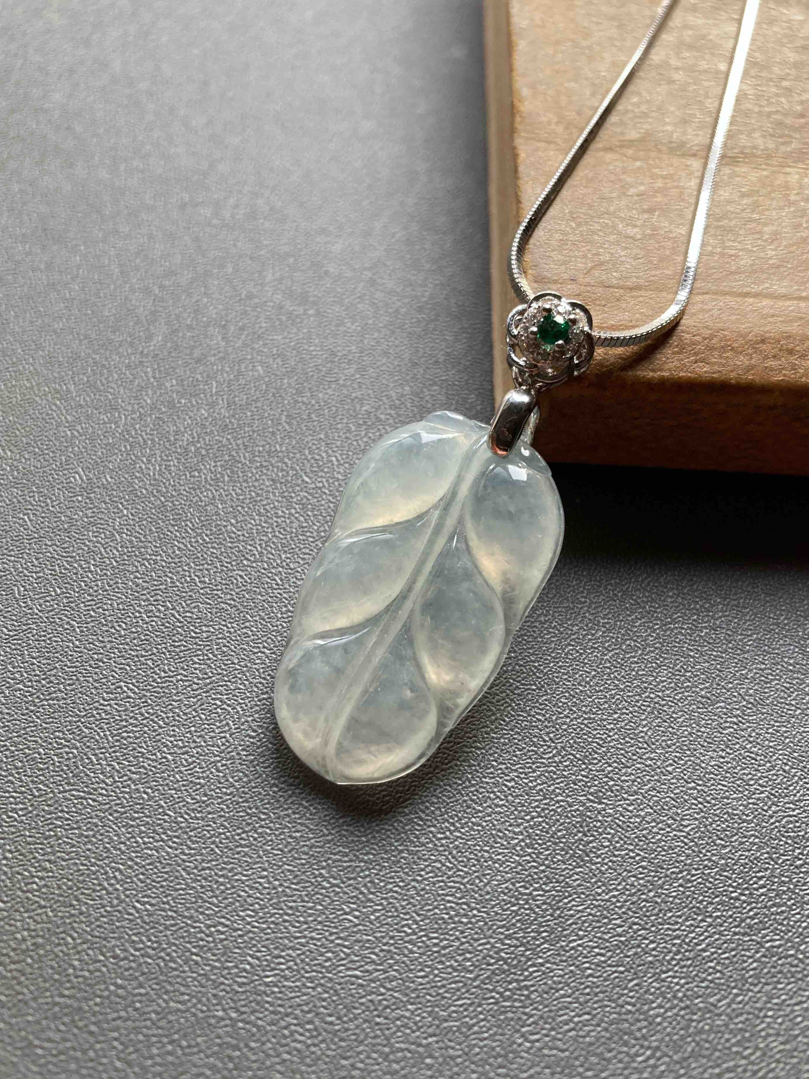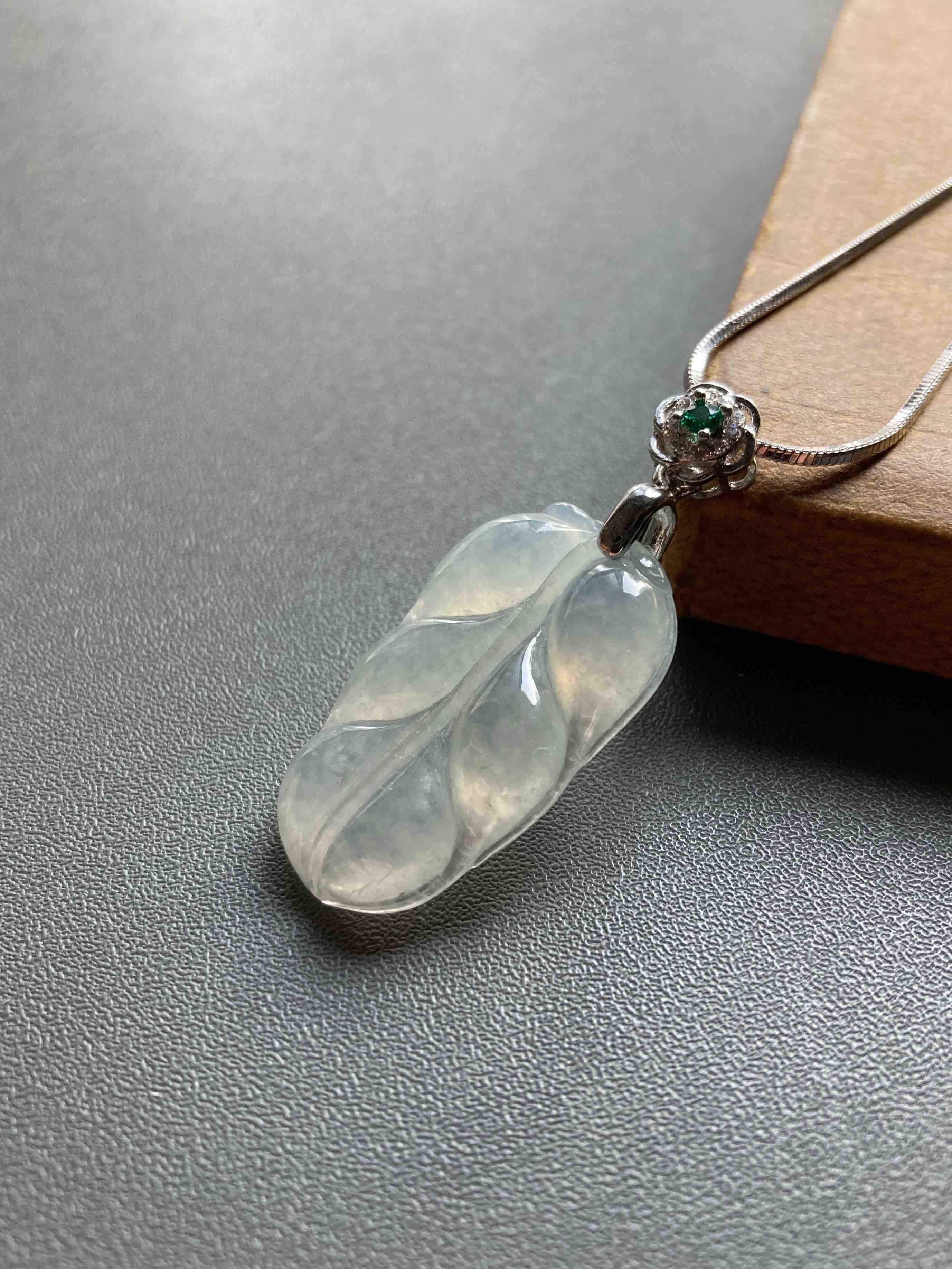冰种翡翠叶子,28.9×17.3×4.3mm,种水晶莹剔透,冰清玉洁,叶子尺寸很棒,厚实饱满,肥美大方,佩戴叶子寓意事业有成,性价比绝了,再送价值100的银镀白金扣头和项链一套