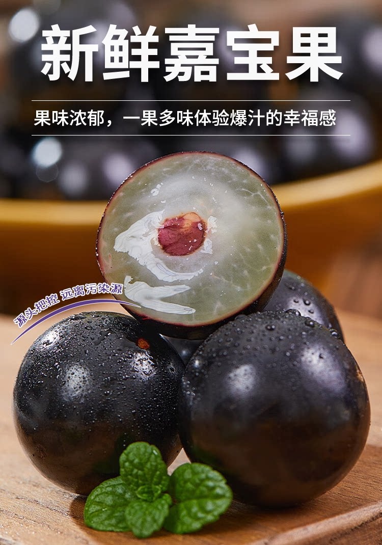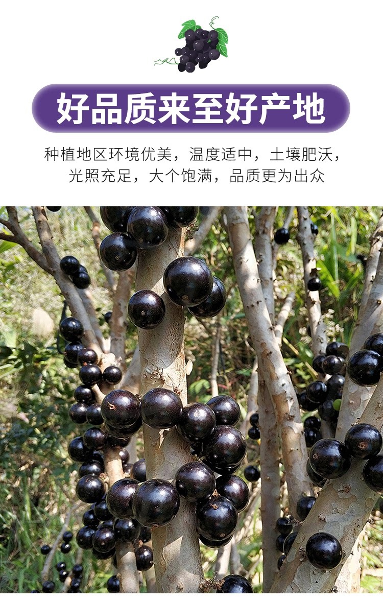嘉宝果原产于巴西、阿根廷等南美国家,如今在我国福建、广东、广西、云南等南方地区及台湾省广泛引种。依托得天独厚的自然条件,阳光雨露充沛、土壤疏松肥沃,为嘉宝果的生长提供了绝佳环境,也让结出的果实颗颗饱满、果香浓郁、甜度在线。而且,每颗嘉宝果都是新鲜现摘,严格挑选紫黑成熟的优质果实,剔除破损果、生果,全程锁鲜,收到时还保留着原产地的鲜甜。