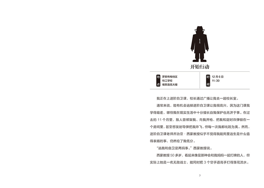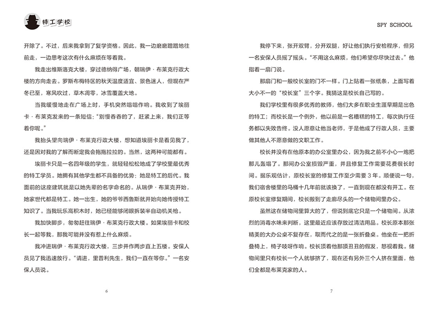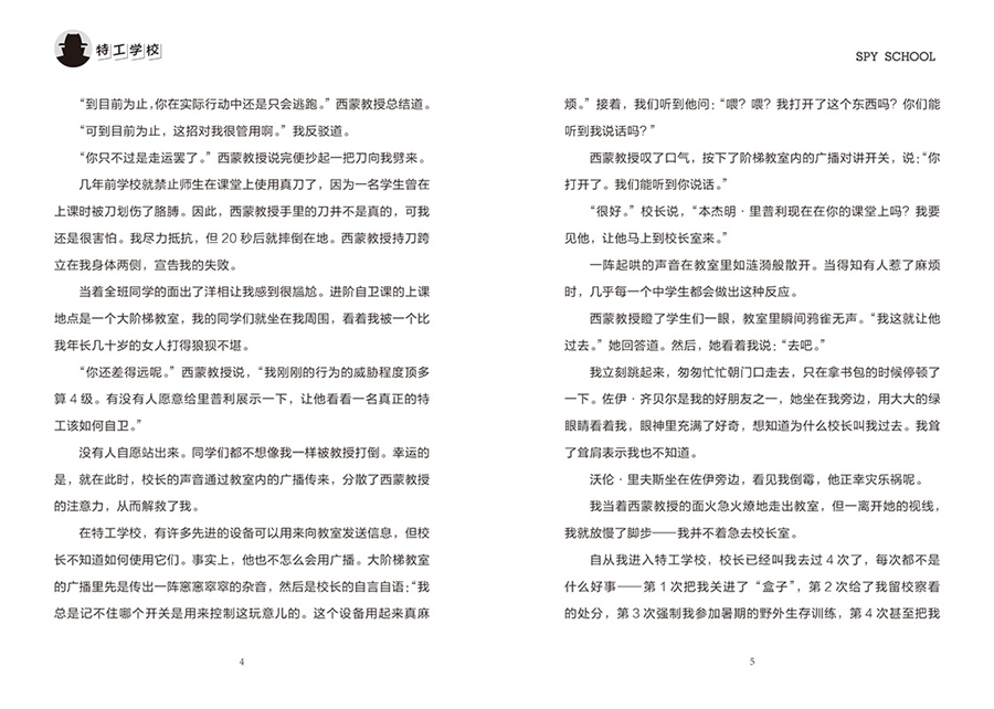 【免费在线读】我正在上进阶自卫课,校长通过广播让我去一趟校长室。通常来说,能有机会逃掉进阶自卫课让我很高兴,因为这门课我学得最差,哪怕我在现实生活中十分擅长自我保护也无济于事。在过去的 11 个月里,敌人曾绑架我、向我开枪、把我和定时炸弹锁在一个房间里,甚至想发射导弹把我炸飞,但每一次我都化险为夷。然而,进阶自卫课老师乔治亚西蒙教授似乎不觉得我能死里逃生是什么值得表扬的事,仍然给了我低分。;逃跑和自卫是两码事。西蒙教授说。西蒙教授 50 多岁,看起来像是那种会和我妈妈一起打牌的人,但实际上她是一名无敌战士,能同时把 3 个空手道高手打得落花流水。;到目前为止,你在实际行动中还是只会逃跑。西蒙教授总结道。;可到目前为止,这招对我很管用啊。我反驳道。;你只不过是走运罢了。西蒙教授说完便抄起一把刀向我劈来。几年前学校就禁止师生在课堂上使用真刀了,因为一名学生曾在上课时被刀划伤了胳膊。因此,西蒙教授手里的刀并不是真的,可我还是很害怕。我尽力抵抗,但 20 秒后就摔倒在地。西蒙教授持刀跨立在我身体两侧,宣告我的失败。当着全班同学的面出了洋相让我感到很尴尬。进阶自卫课的上课地点是一个大阶梯教室,我的同学们就坐在我周围,看着我被一个比我年长几十岁的女人打得狼狈不堪。;你还差得远呢。西蒙教授说,;我刚刚的行为的威胁程度顶多算 4 级。有没有人愿意给里普利展示一下,让他看看一名真正的特工该如何自卫。没有人自愿站出来。同学们都不想像我一样被教授打倒。幸运的是,就在此时,校长的声音通过教室内的广播传来,分散了西蒙教授的注意力,从而解救了我。在特工学校,有许多先进的设备可以用来向教室发送信息,但校长不知道如何使用它们。事实上,他也不怎么会用广播。大阶梯教室的广播里先是传出一阵窸窸窣窣的杂音,然后是校长的自言自语:;我总是记不住哪个开关是用来控制这玩意儿的。这个设备用起来真麻烦。接着,我们听到他问:;喂?喂?我打开了这个东西吗?你们能听到我说话吗?西蒙教授叹了口气,按下了阶梯教室内的广播对讲开关,说:;你打开了。我们能听到你说话。;很好。校长说,;本杰明里普利现在在你的课堂上吗?我要见他,让他马上到校长室来。一阵起哄的声音在教室里如涟漪般散开。当得知有人惹了麻烦时,几乎每一个中学生都会做出这种反应。西蒙教授瞪了学生们一眼,教室里瞬间鸦雀无声。;我这就让他过去。她回答道。然后,她看着我说:;去吧。