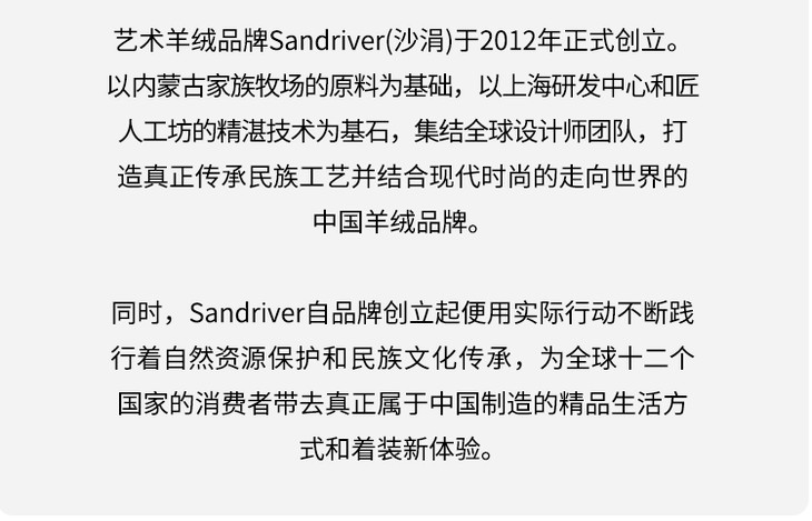历年在巴黎时装周亮相,享誉世界的艺术羊绒品牌[Sandriver 沙涓]由羊绒布道者郭秀玲女士创立。阿拉善自有牧场纯种羔羊绒,日本国宝设计师小筱顺子,上海自有基地精工细作。承载羊绒情怀,坚持匠人品质。