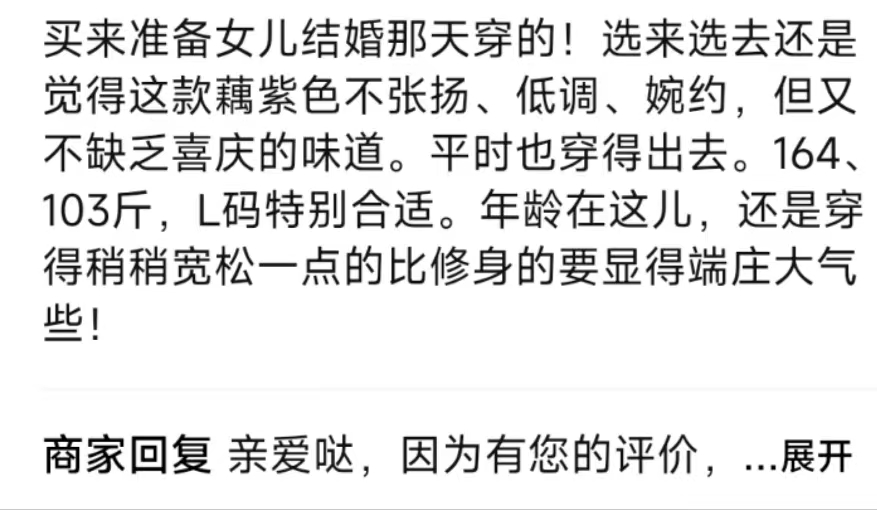 1.买来参加女儿婚礼。选来选去还是觉得这款藕紫色不张扬飞,低调婉约,但又不缺乏喜庆的味道。最重要平时也穿得出去。
