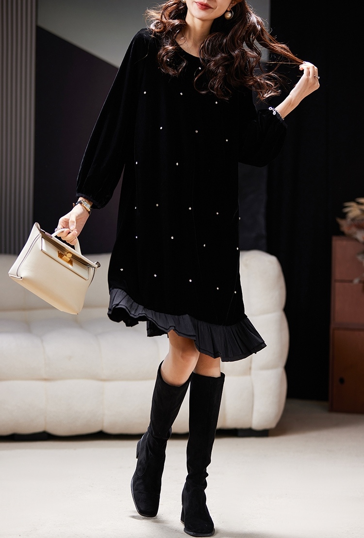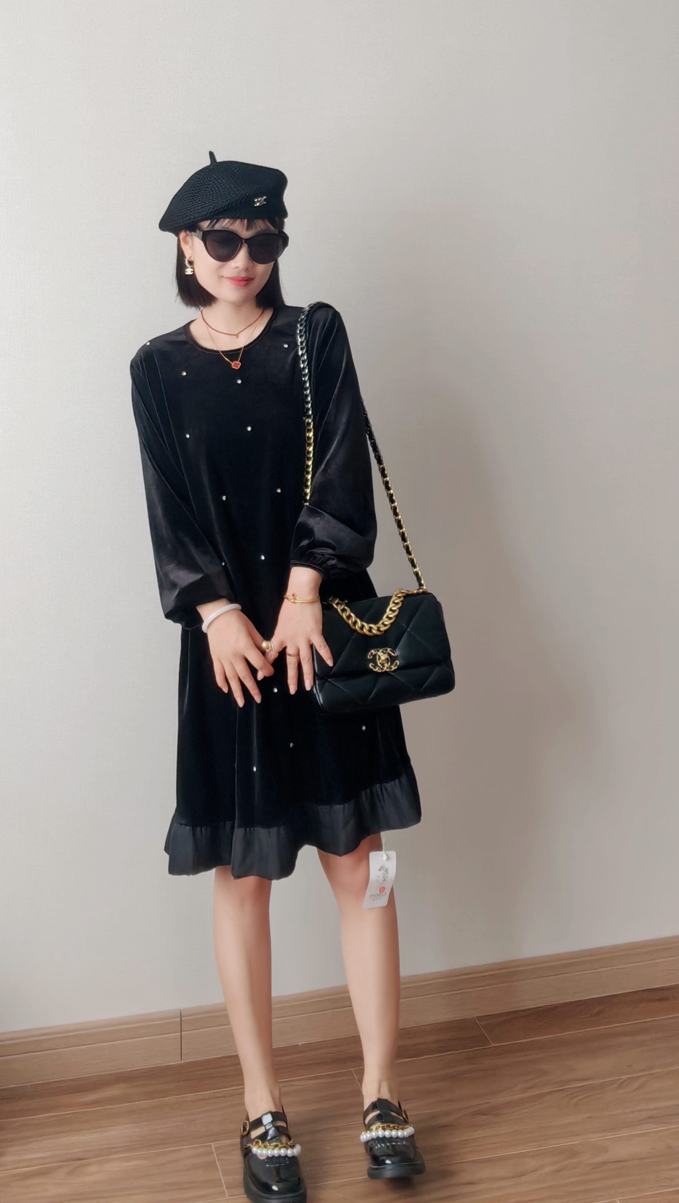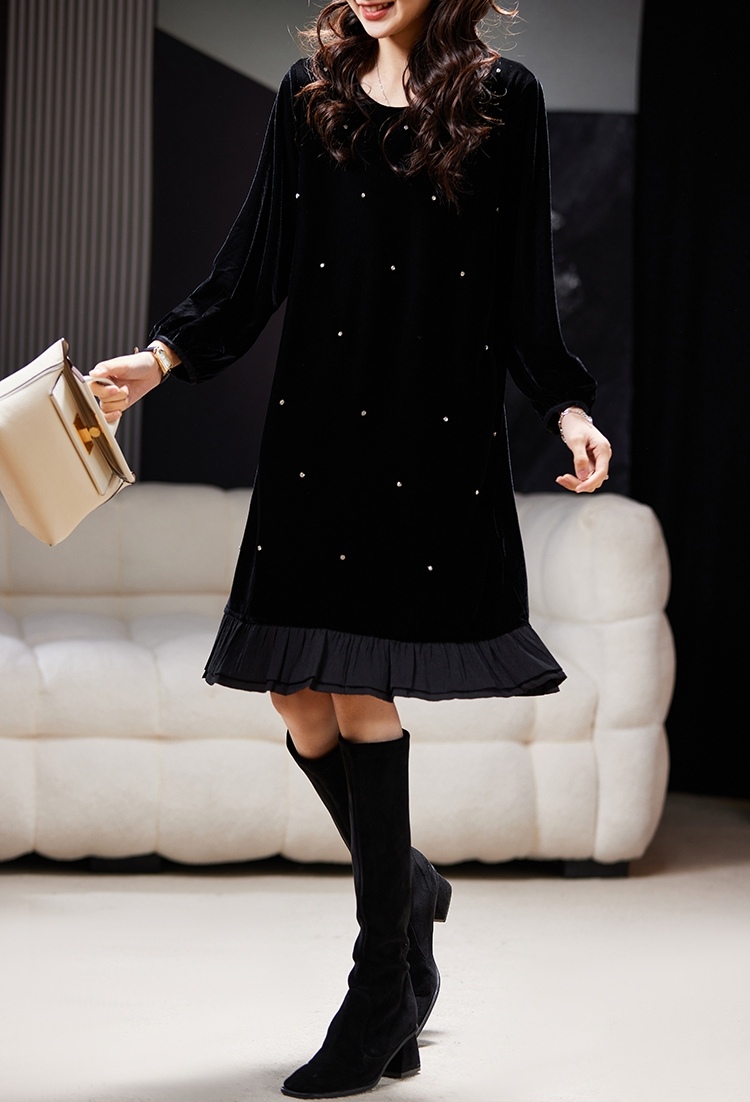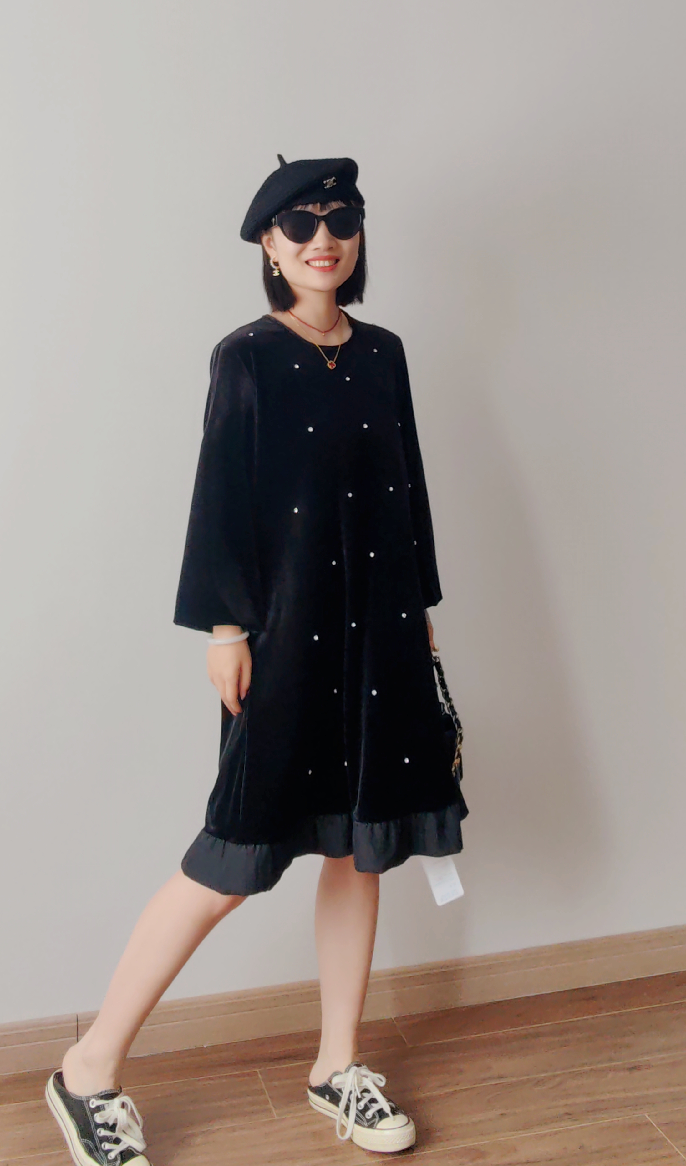 简约气质的重工钉钻丝绒拼接连衣裙,经典大气圆领领型,气质简约高级,视觉上拉长脖颈线条,裙身重工钉钻设计,亮眼吸睛,尽显细节重工高品质感,下摆鱼尾裙摆拼接撞色款式,尽显气质女人味宽松的版型,轻松藏肉,适合各种身材的朋友们~