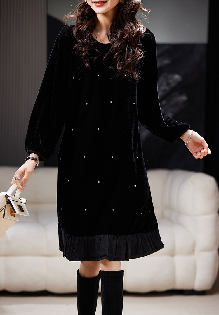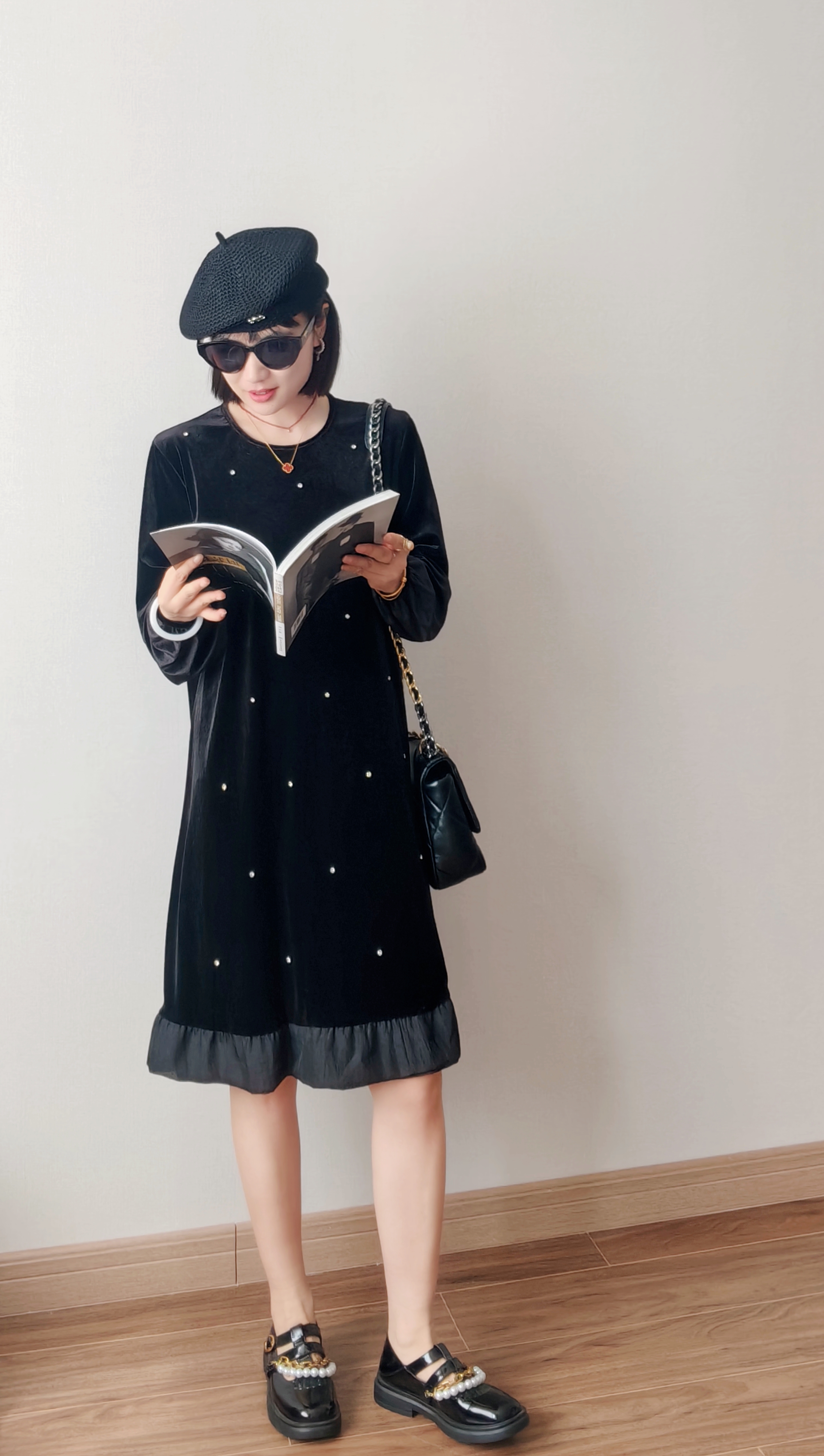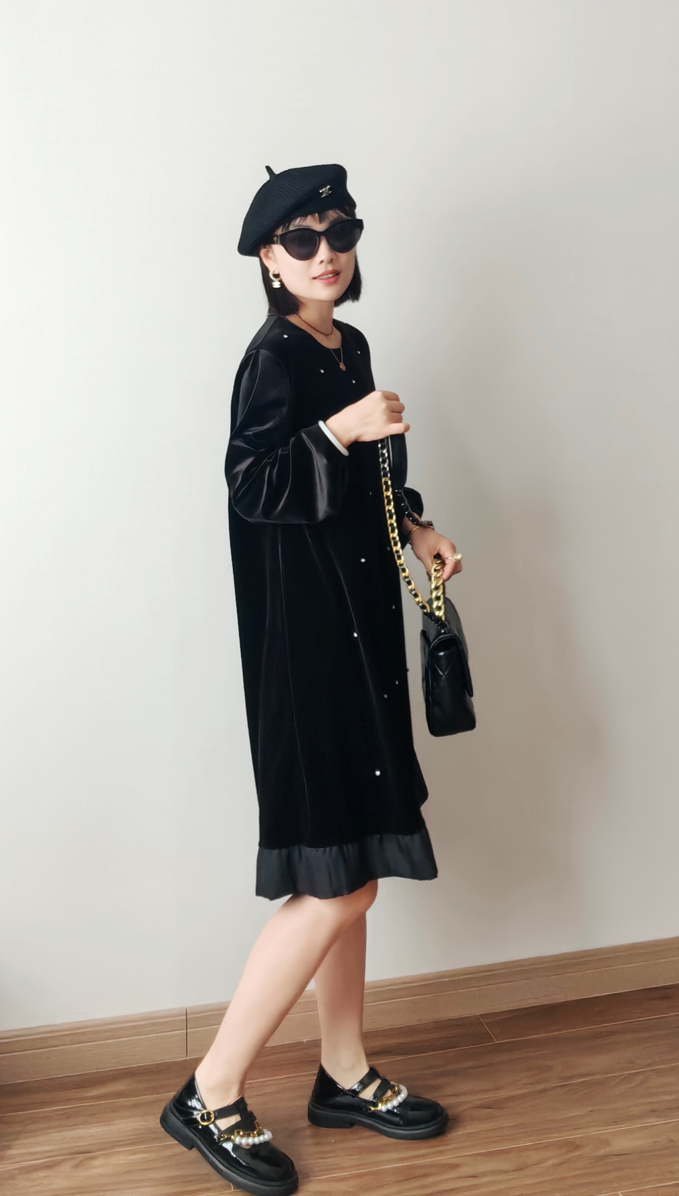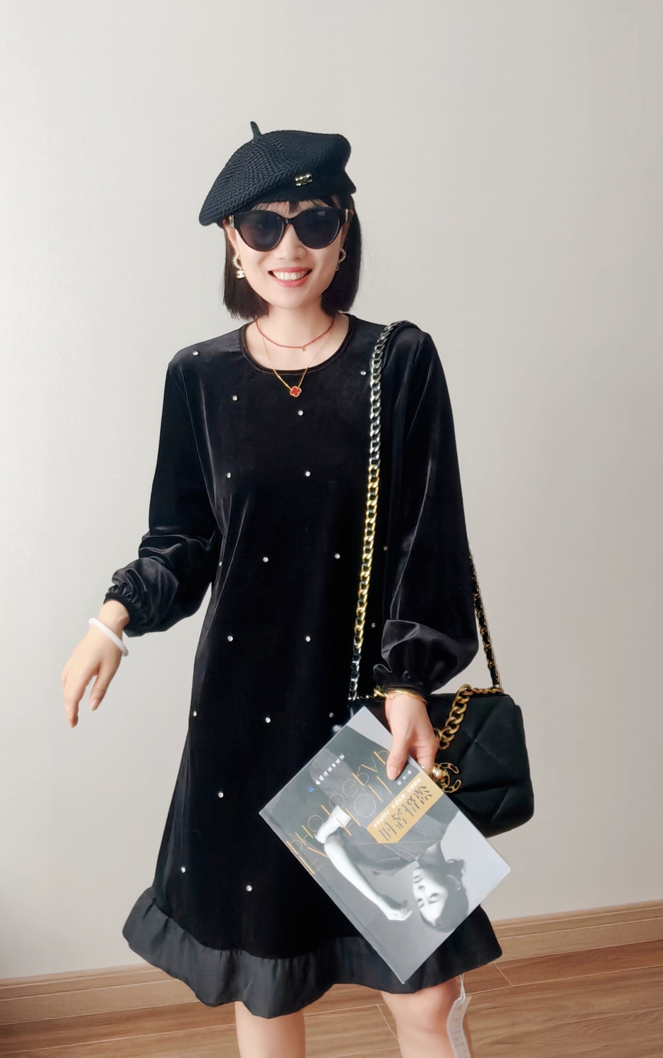 简约气质的重工钉钻丝绒拼接连衣裙,经典大气圆领领型,气质简约高级,视觉上拉长脖颈线条,裙身重工钉钻设计,亮眼吸睛,尽显细节重工高品质感,下摆鱼尾裙摆拼接撞色款式,尽显气质女人味宽松的版型,轻松藏肉,适合各种身材的朋友们~