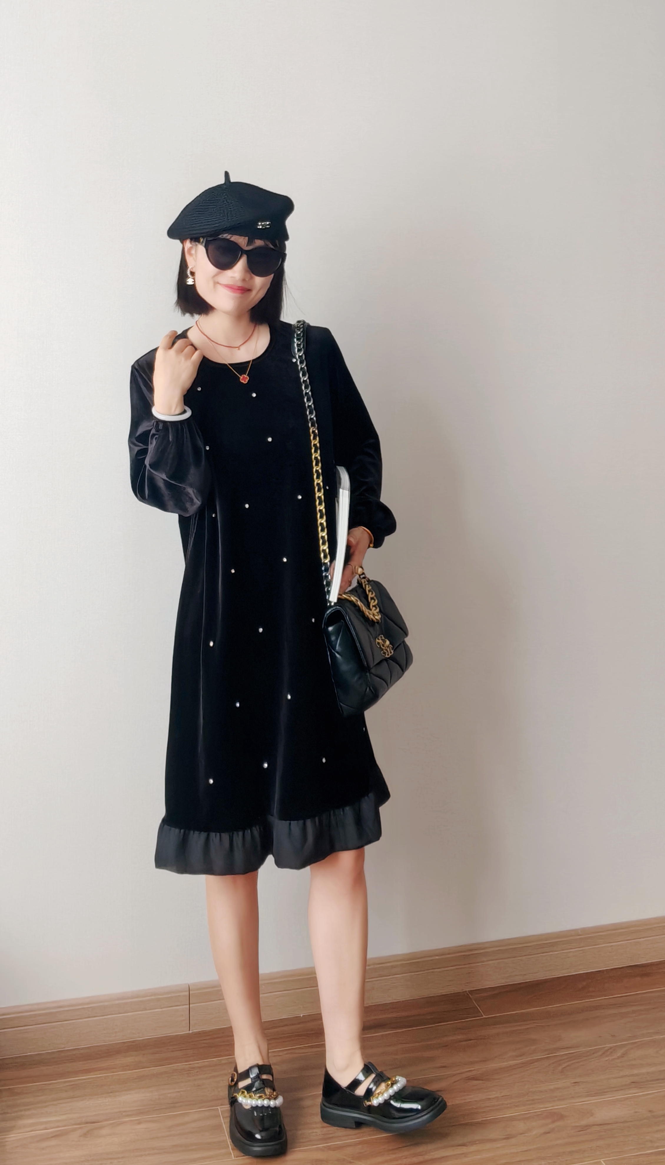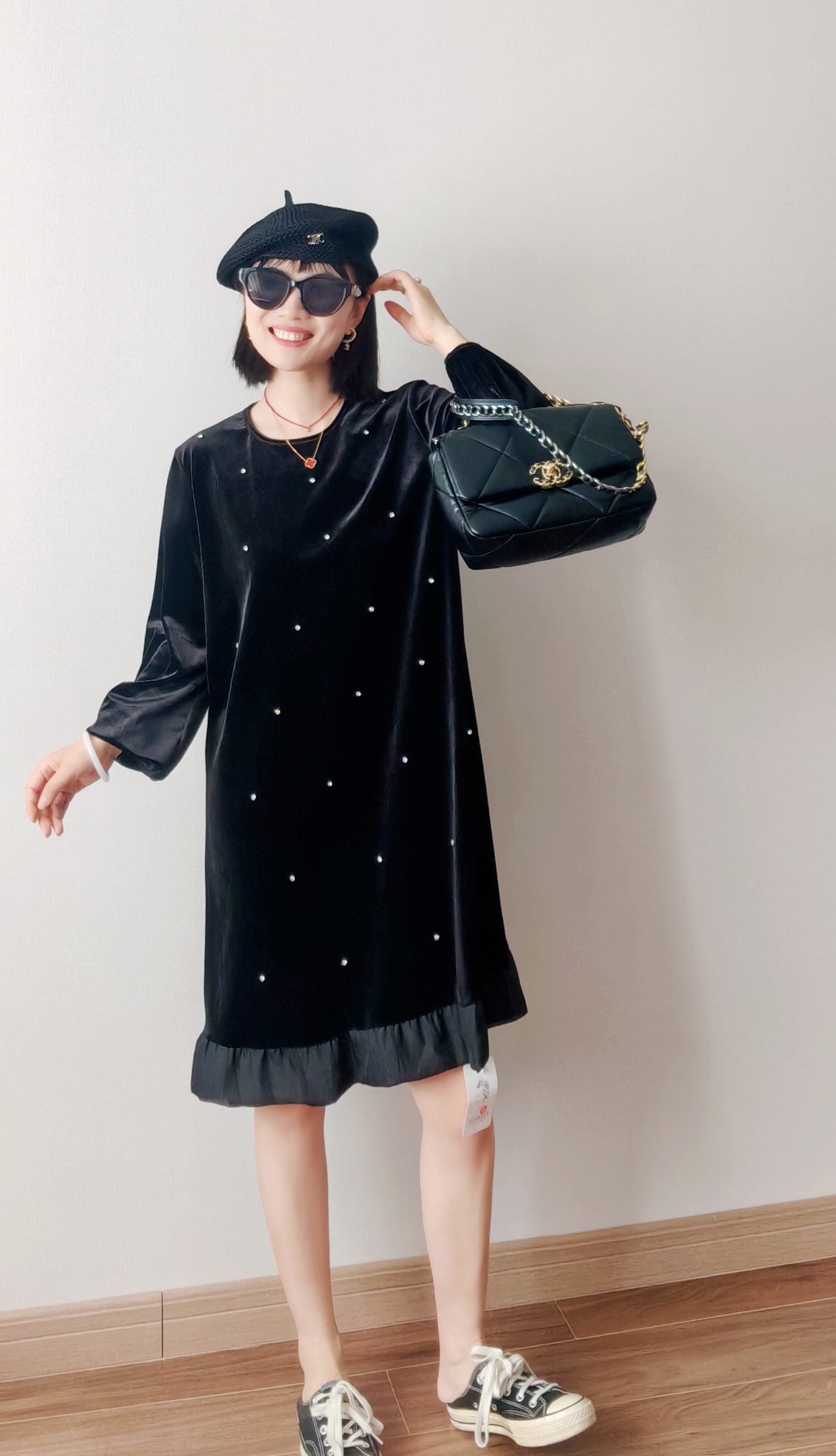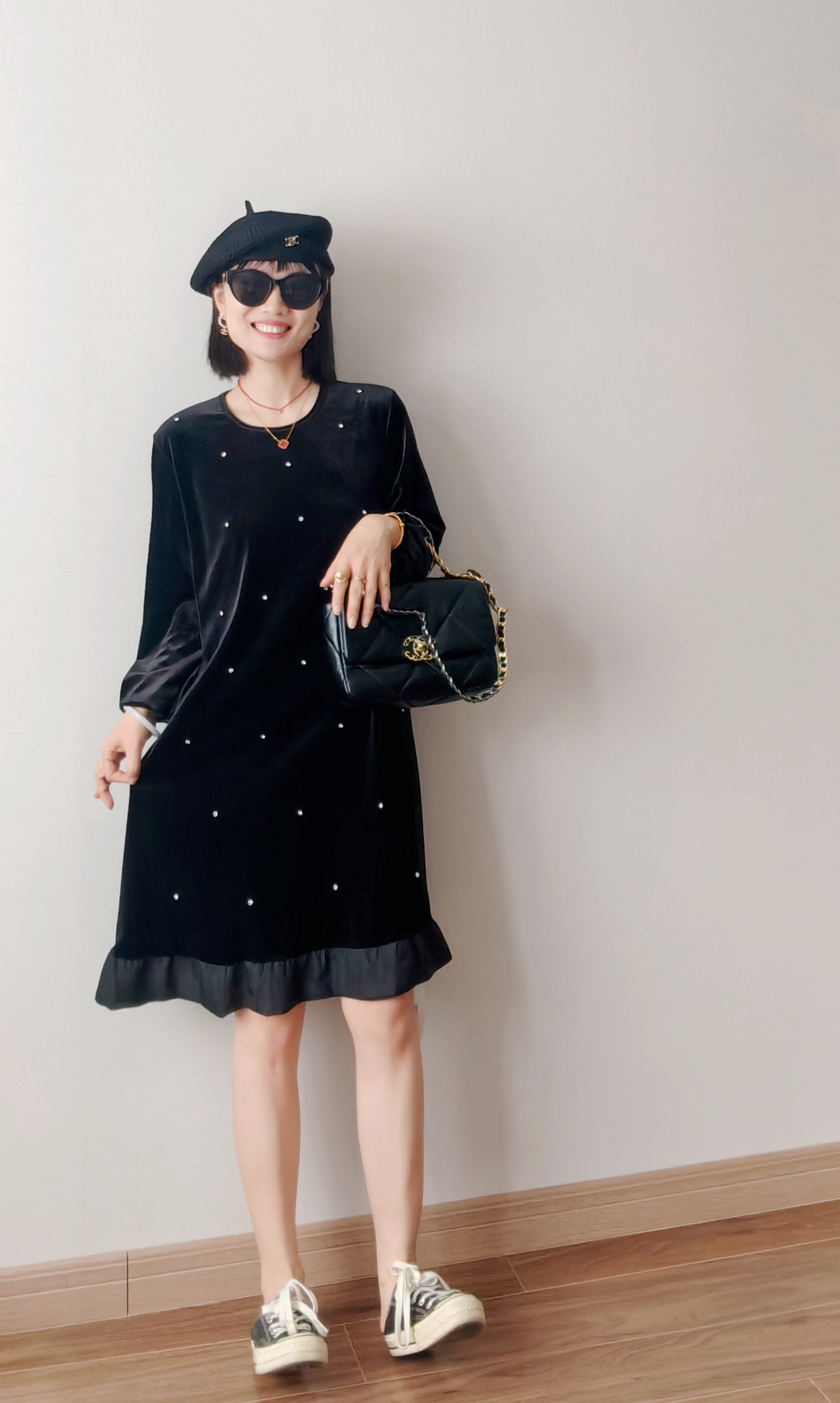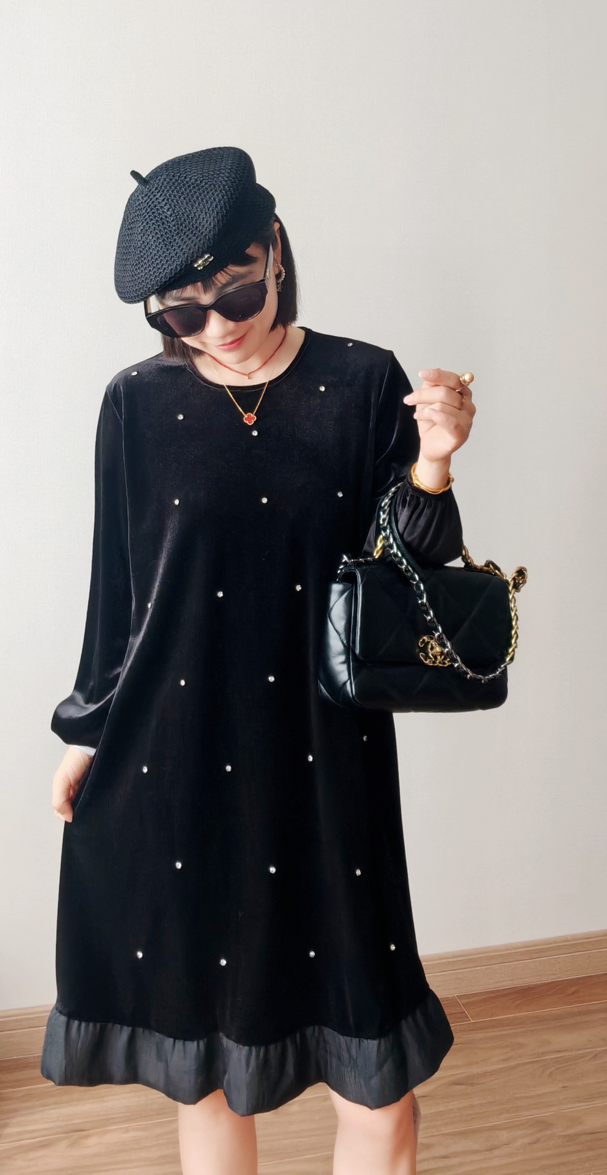 简约气质的重工钉钻丝绒拼接连衣裙,经典大气圆领领型,气质简约高级,视觉上拉长脖颈线条,裙身重工钉钻设计,亮眼吸睛,尽显细节重工高品质感,下摆鱼尾裙摆拼接撞色款式,尽显气质女人味宽松的版型,轻松藏肉,适合各种身材的朋友们~