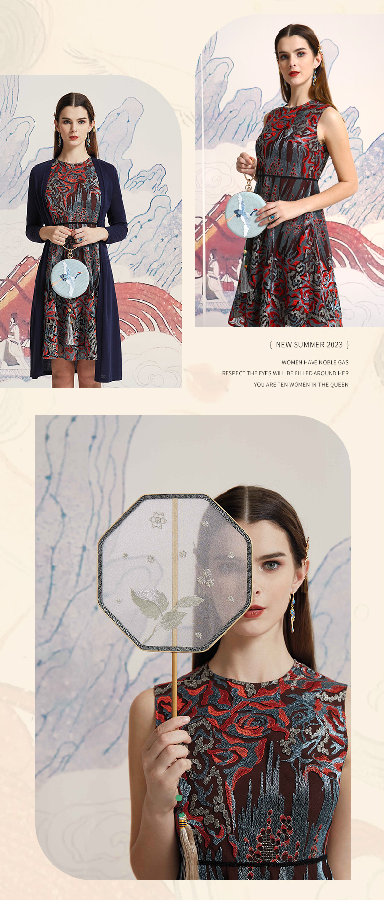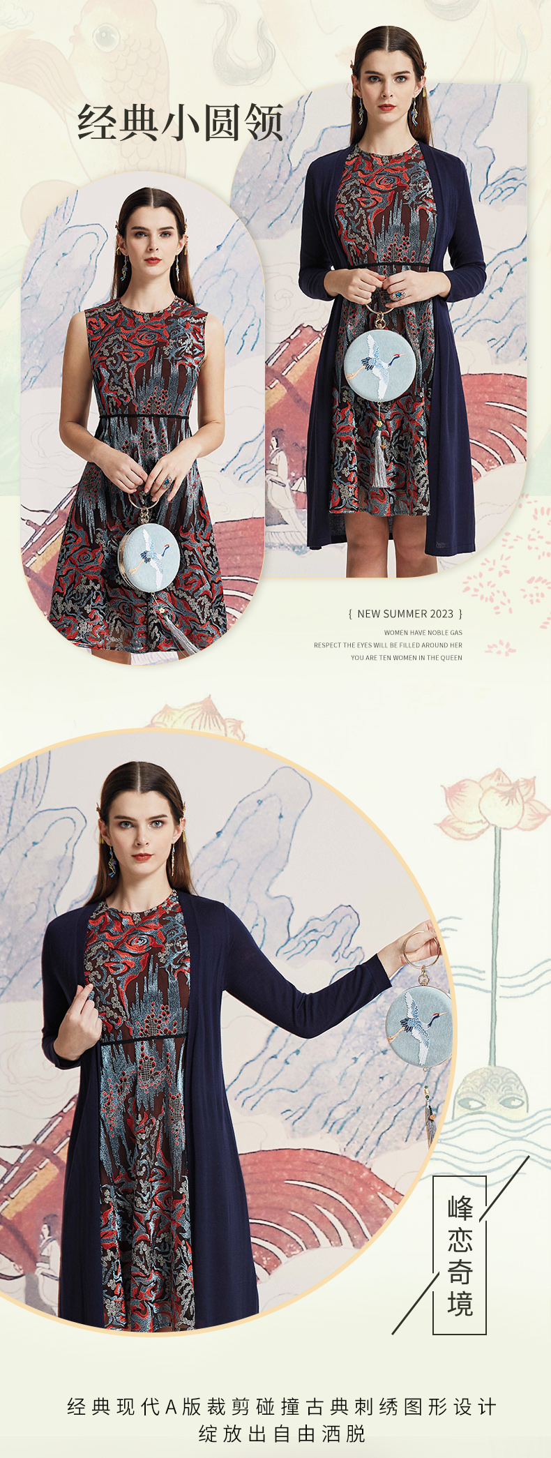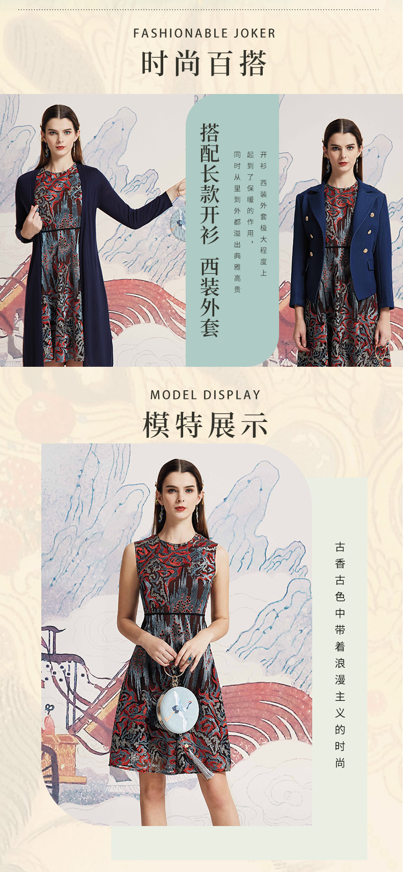 品牌风格:源自千年文学和万年艺术的时装,让你的气质内涵一枝独秀,精彩的品质,华丽的风格,炫耀的视觉,让你的衣品从此与众不同,标记你深厚的文化内涵与艺术气息。