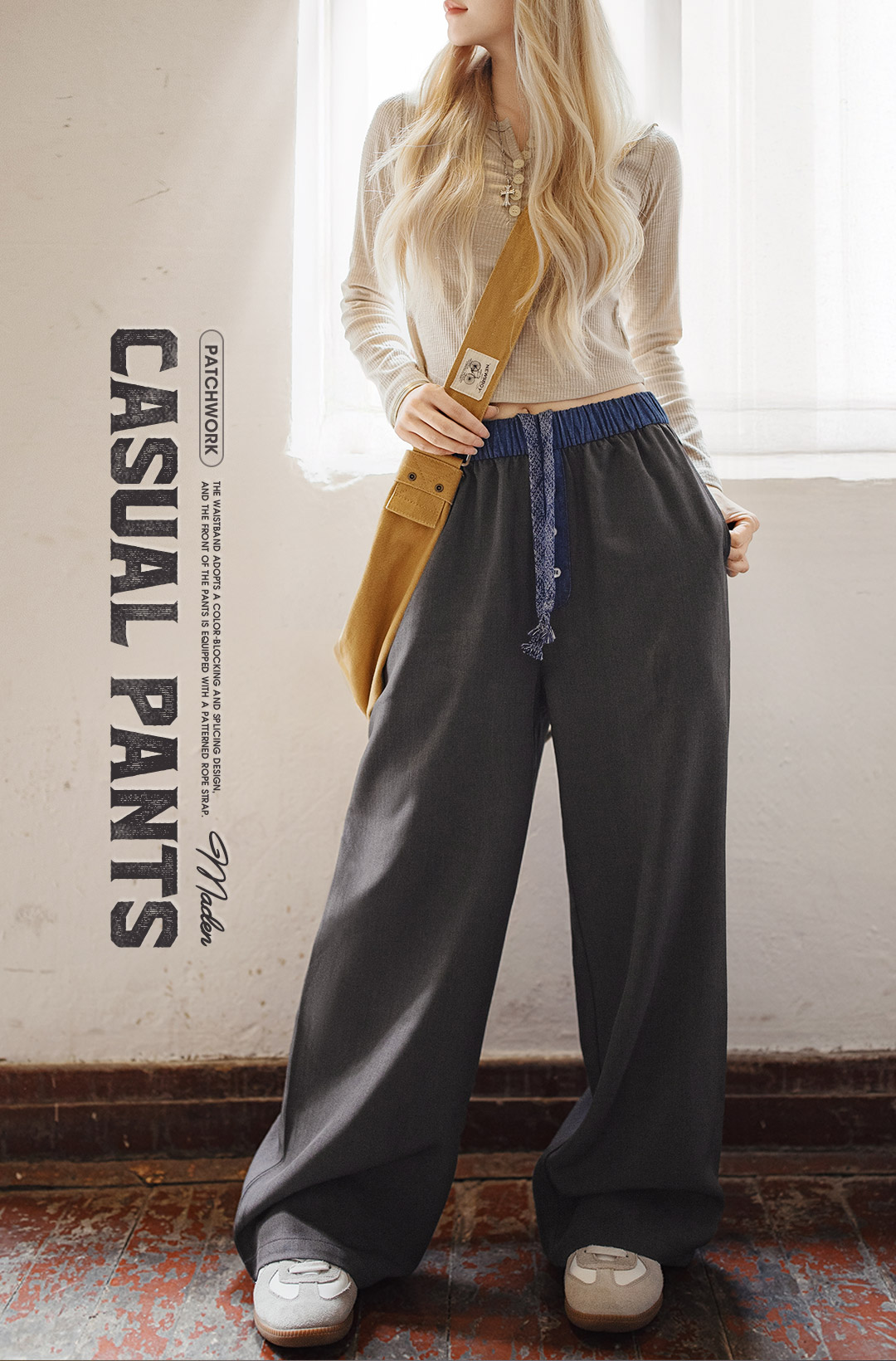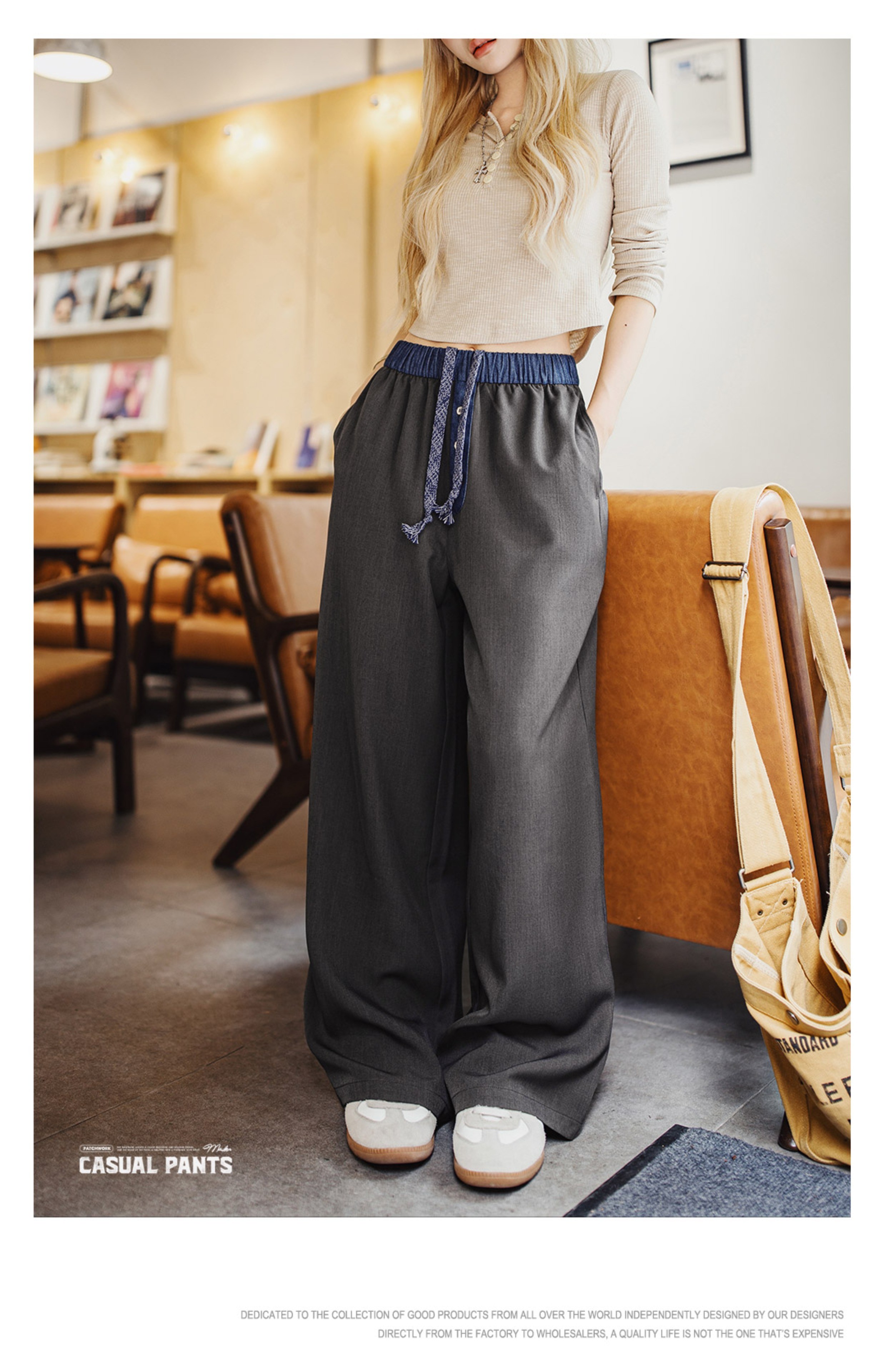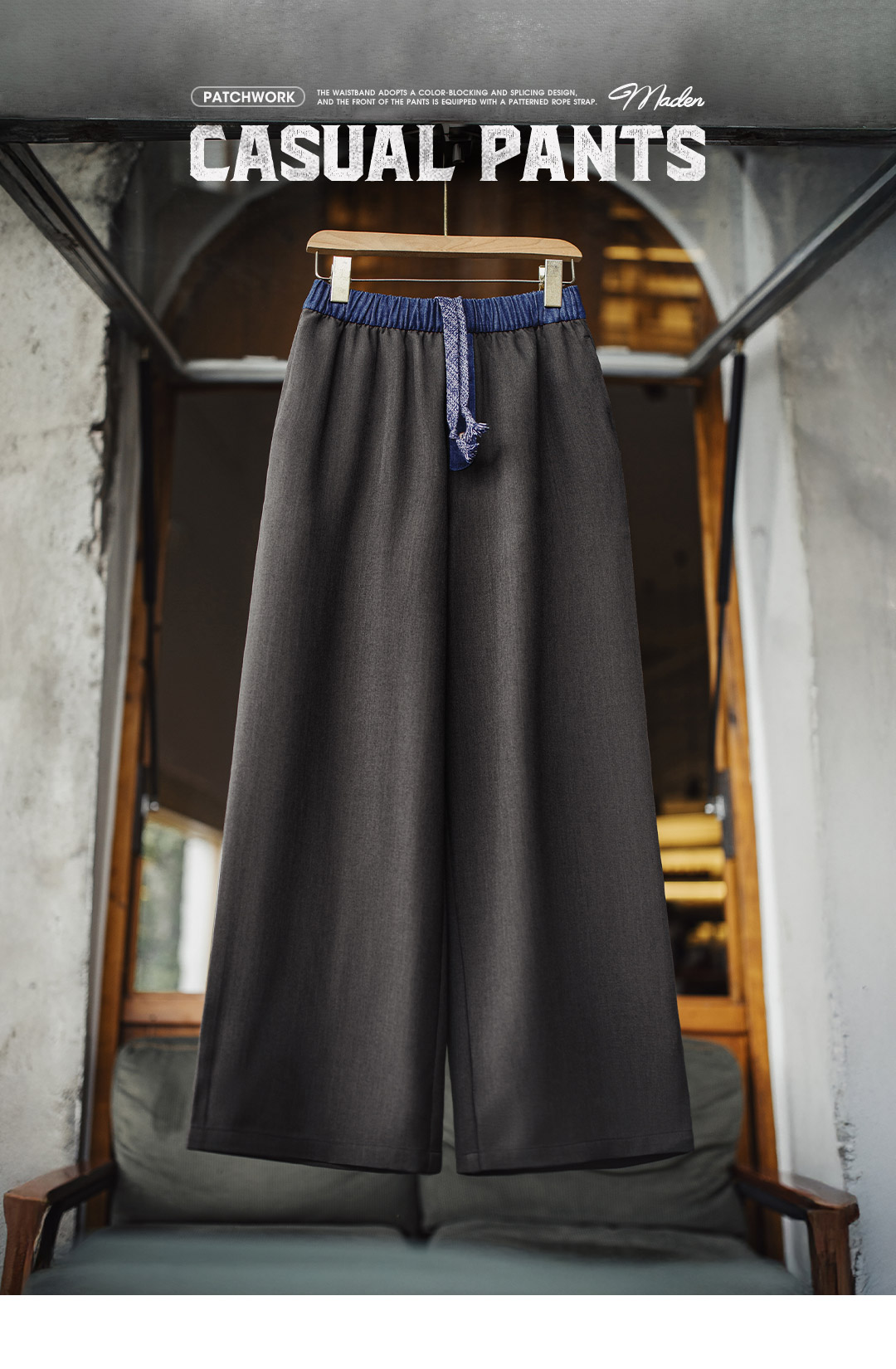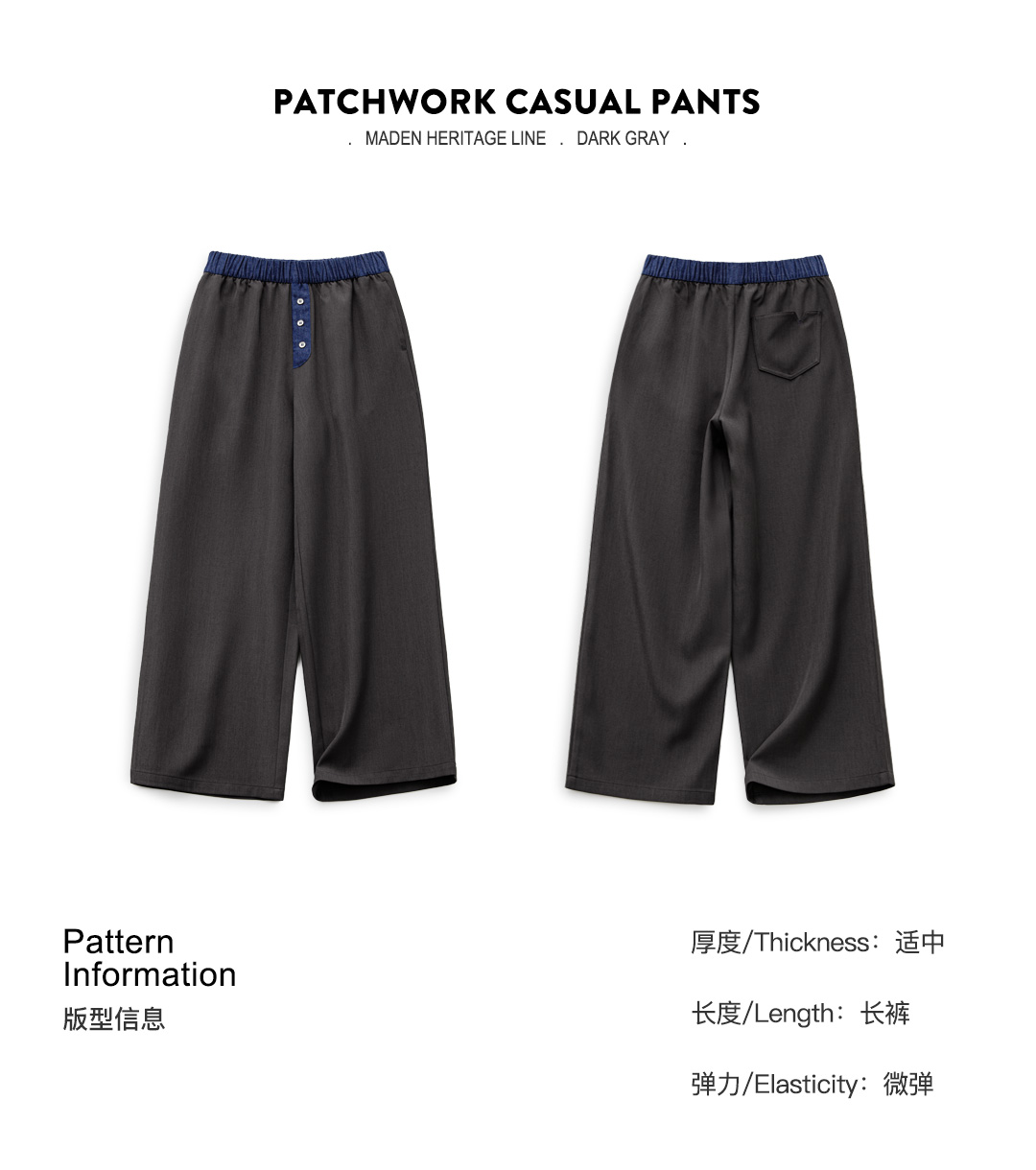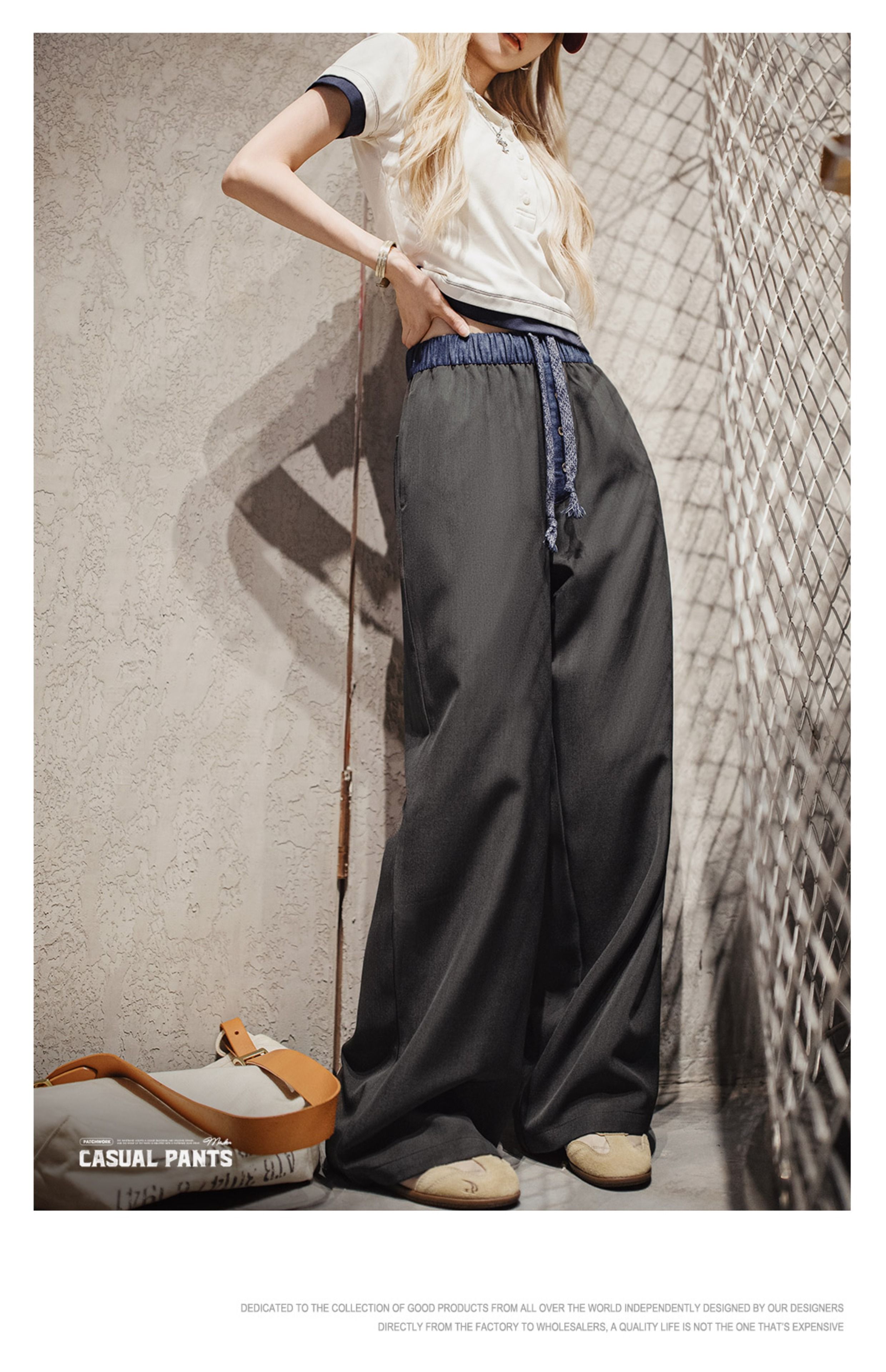马登黑色窄版撞色宽松紧腰头拼接直筒裤垂感休闲长裤小个子女士夏