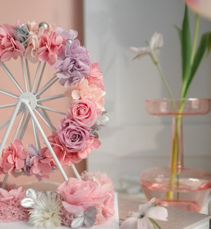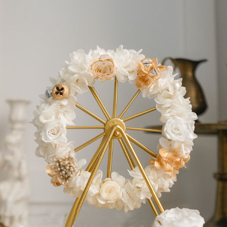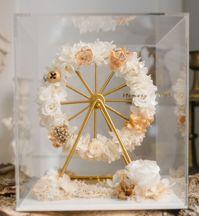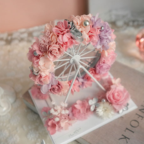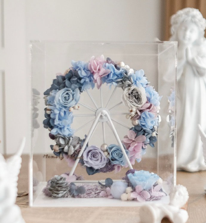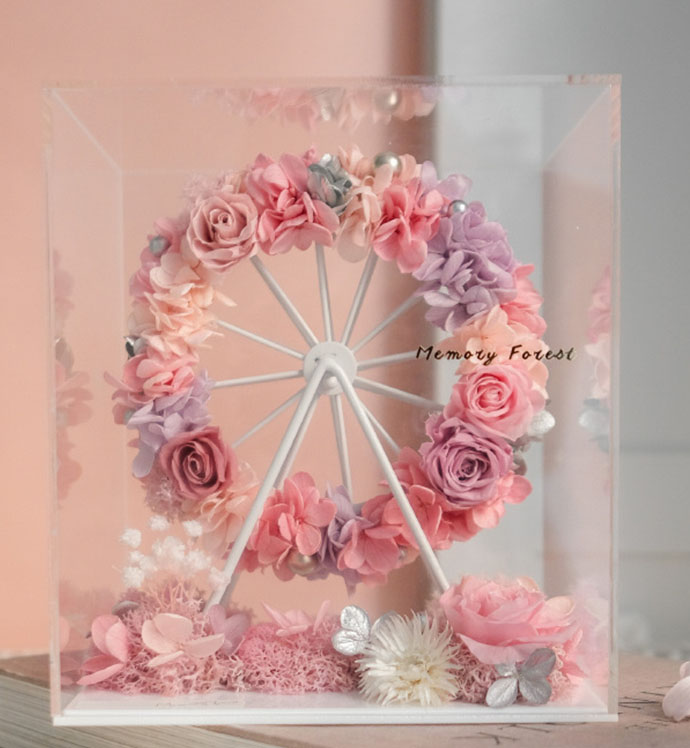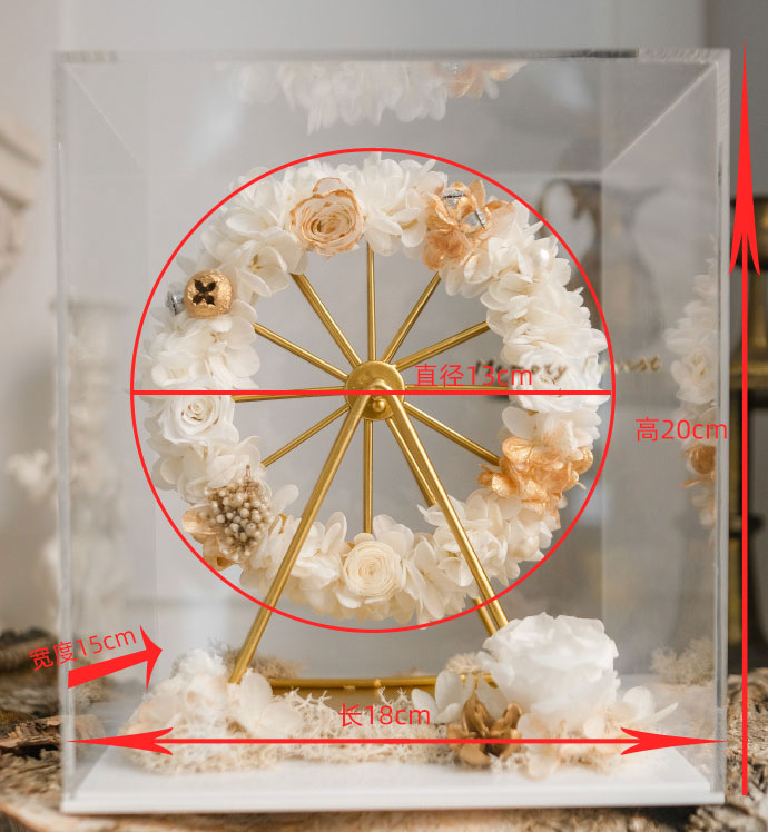 摩天轮花束直径为13cm,包装使用透明亚格力盒子,非玻璃盒,盒子尺寸为:长18cm*宽15cm*高20cm。